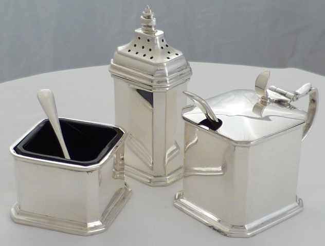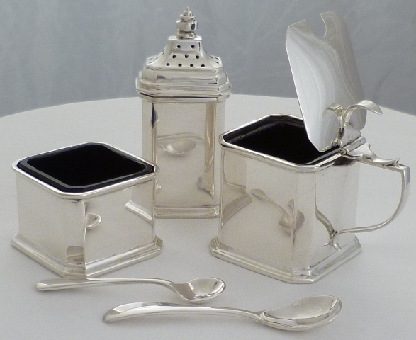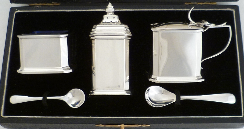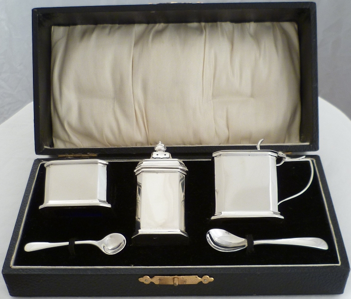| DESCRIPTION | Nice quality and cased Art Deco silver condiment set comprising of pepper pot, salt with blue glass liner and spoon, mustard pot with blue glass liner and ladle. The mustard ladle is a later replacement by Emile Viner, Sheffield 1965. |