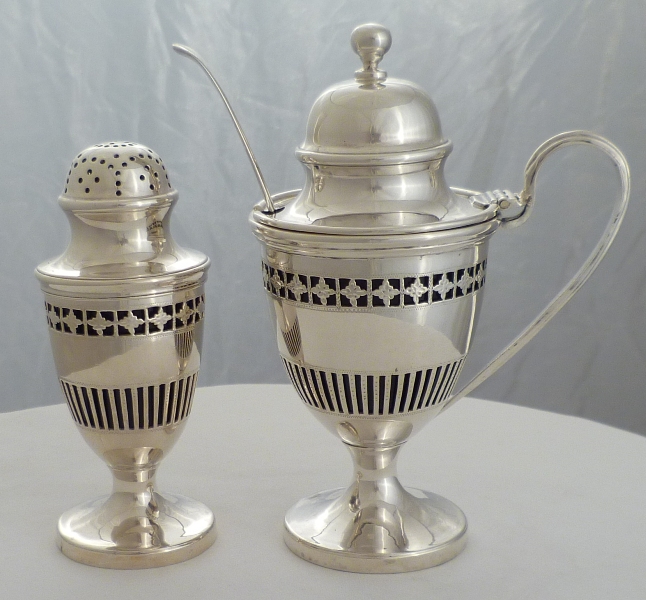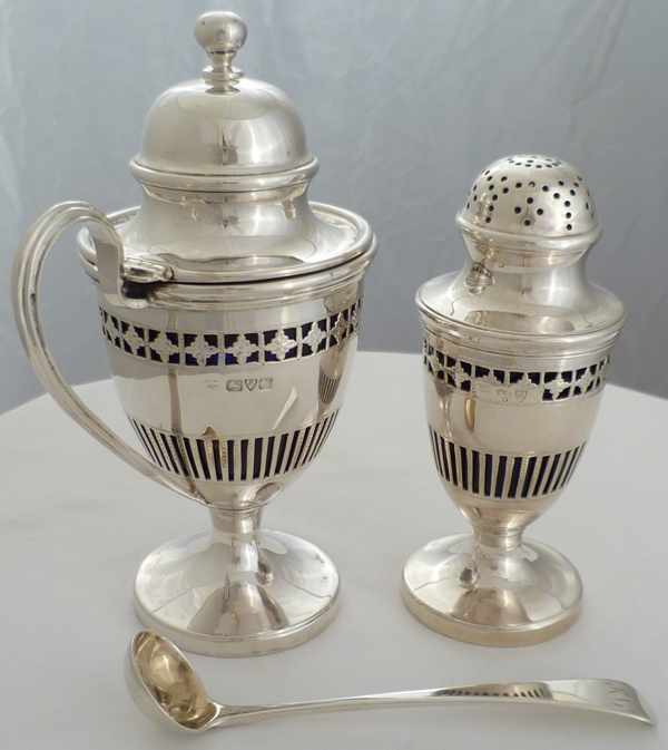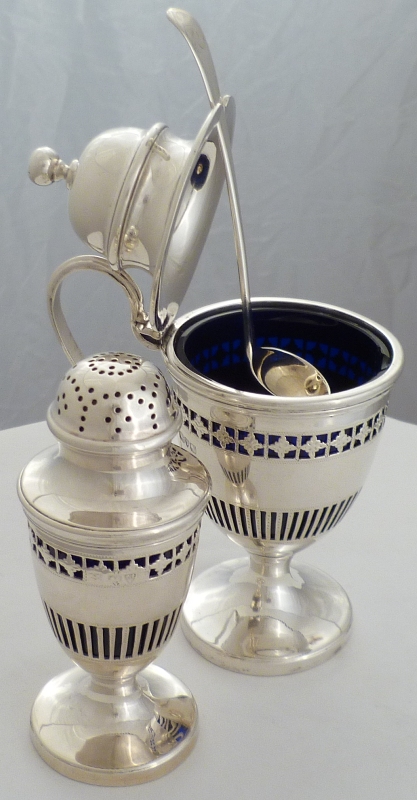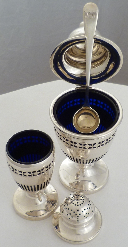 | DESCRIPTION | Very good pierced silver pedestal mustard pot and pepper with blue glass liners. The Georgian silver ladle has a monogram engraving and gilded bowl. |