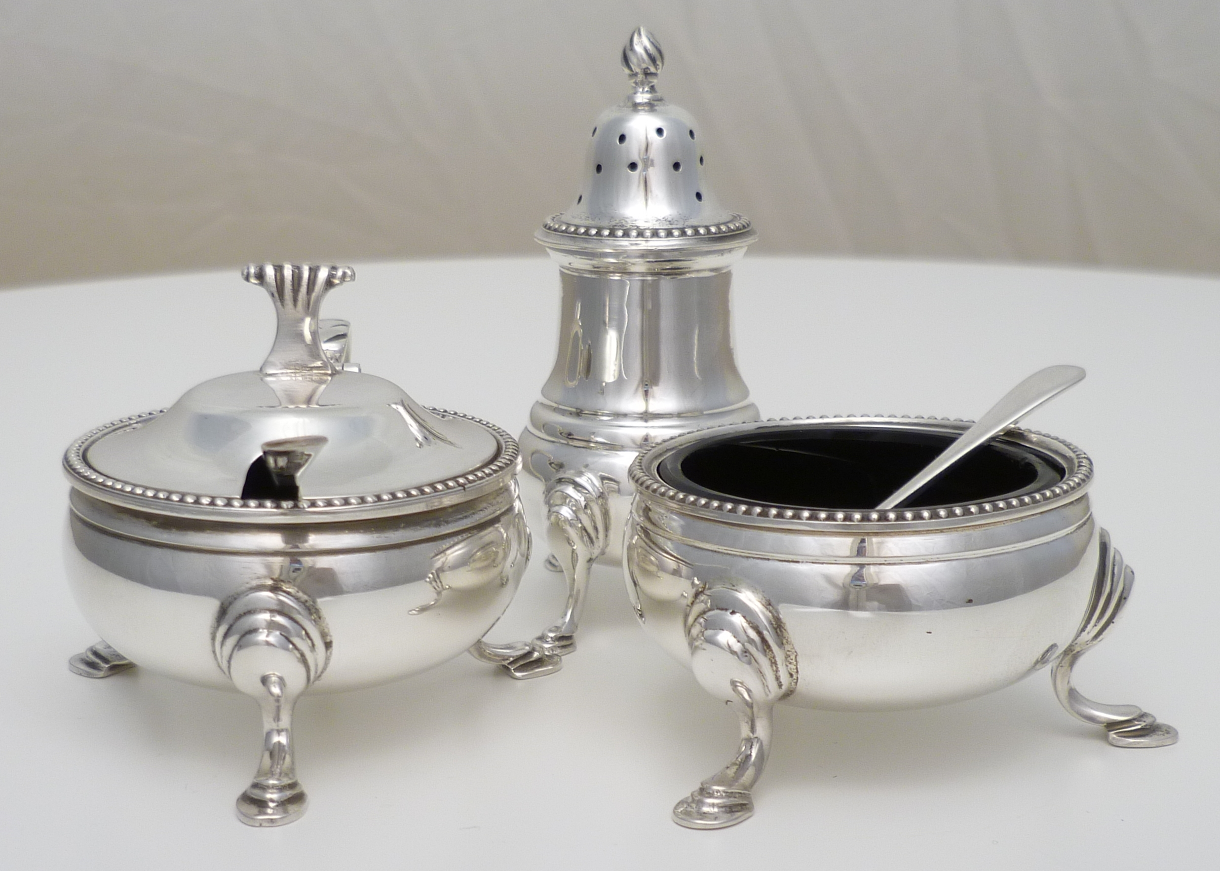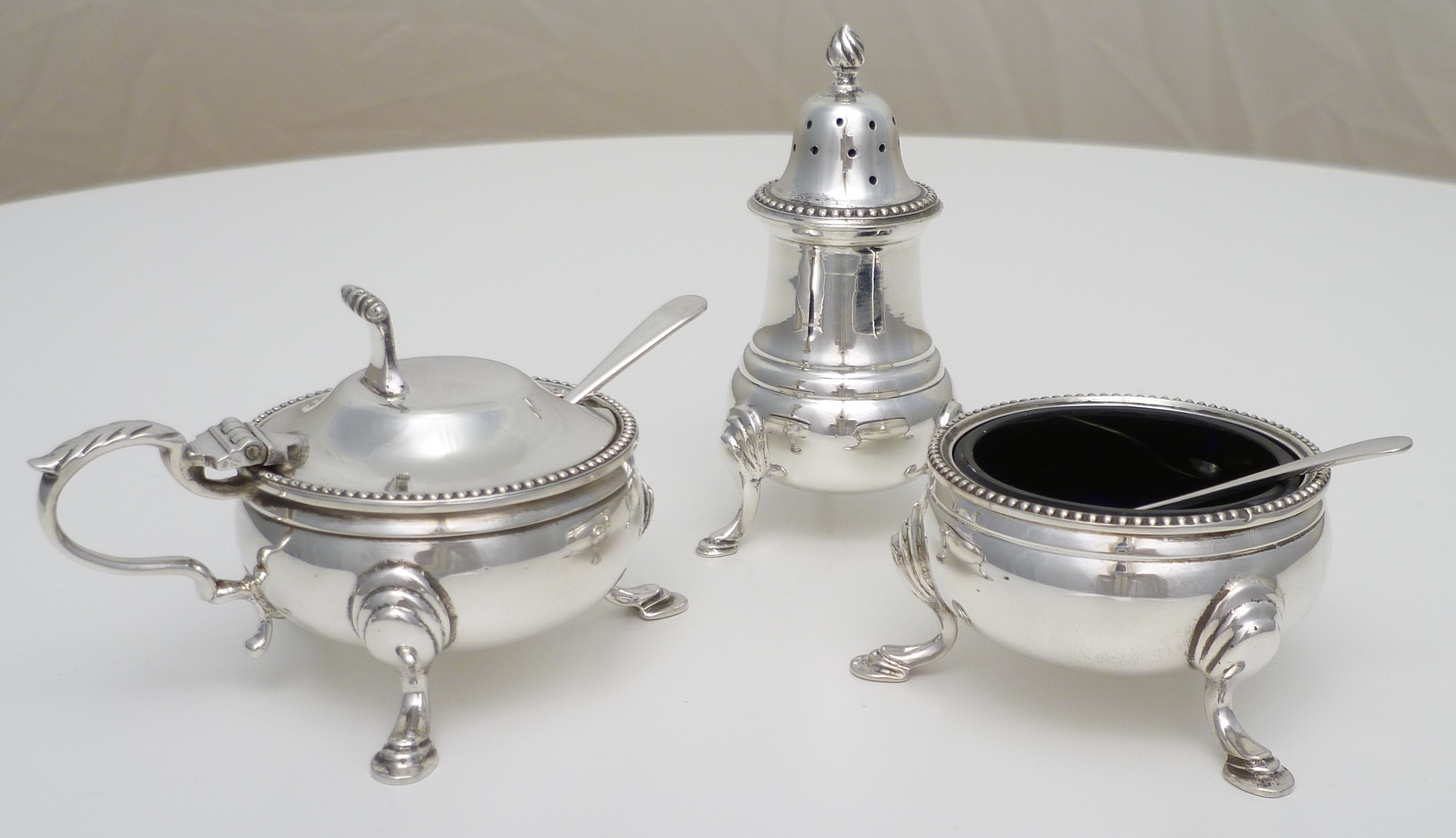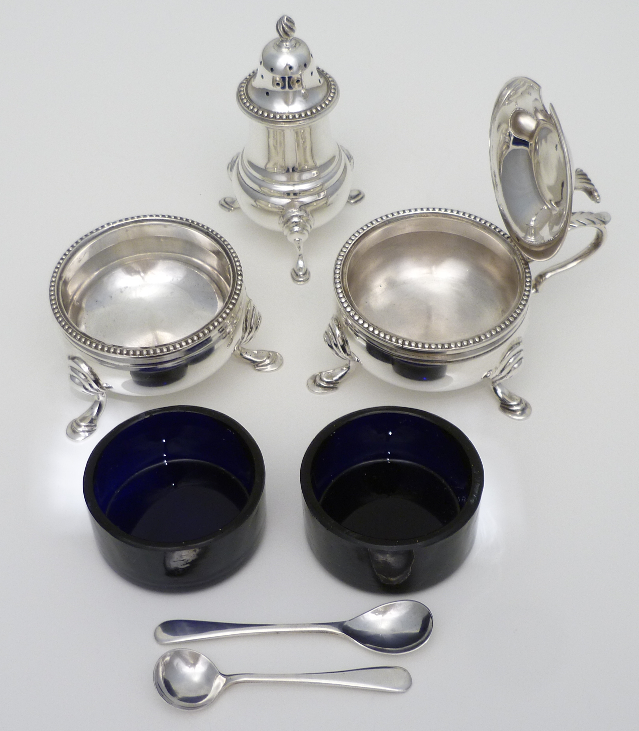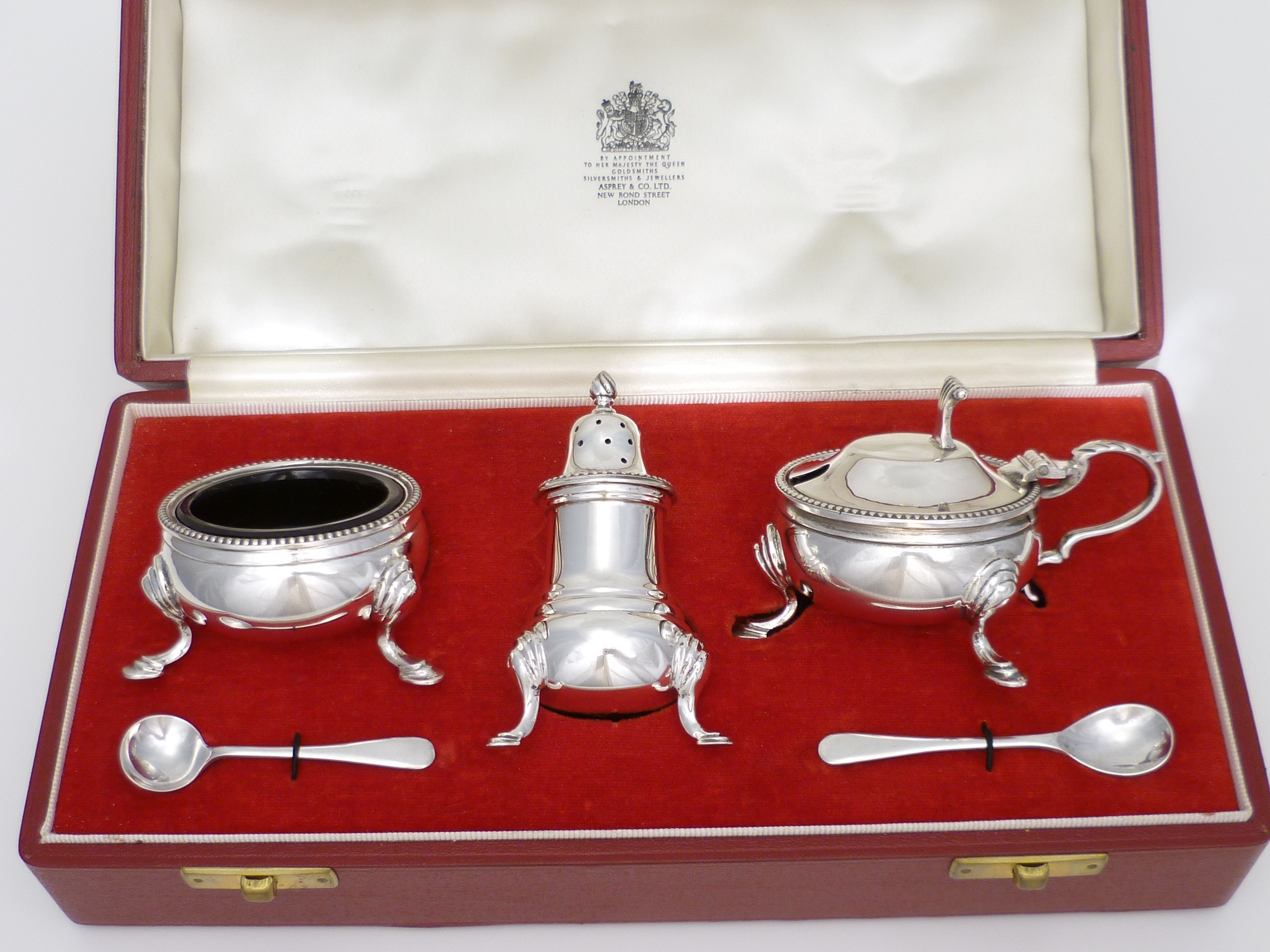 | DESCRIPTION | Superb quality and cased solid sterling silver condiment set complete with the original spoons and hand made blue glass liners. Retailed by Asprey & Co. of New Bond Street, London and contained within their original fitted case. |