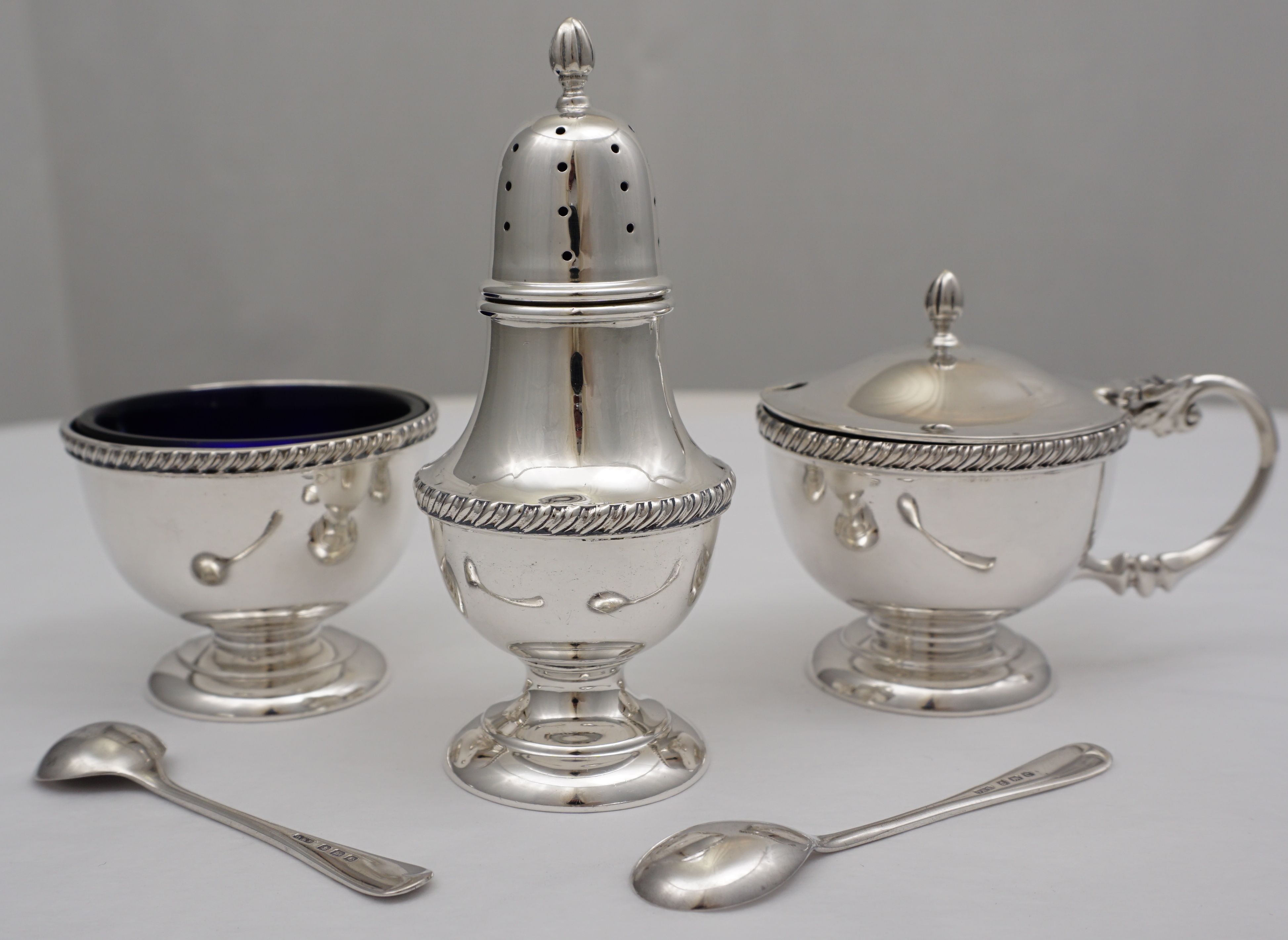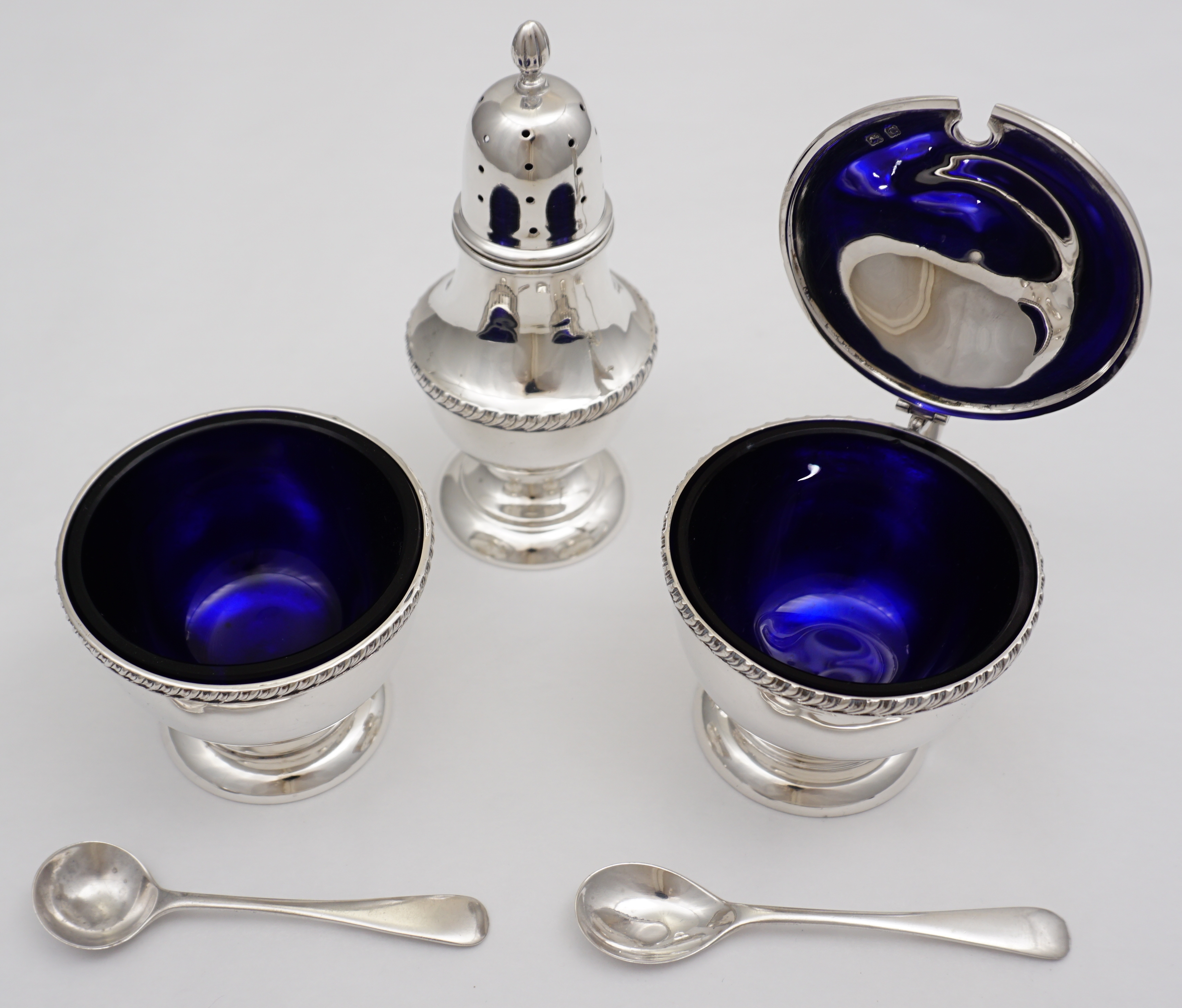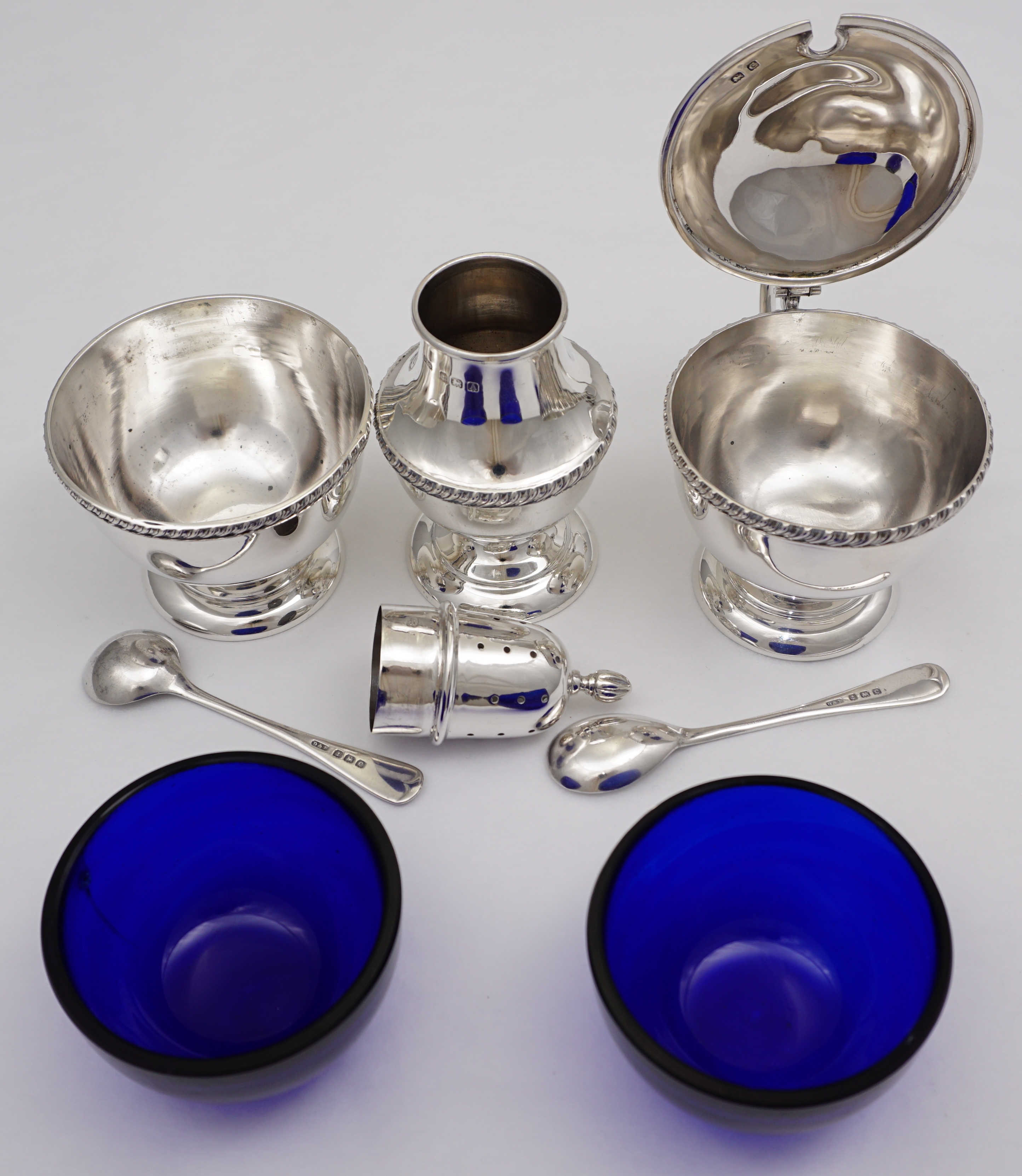 | DESCRIPTION | Cased vintage English solid sterling silver condiment set with blue glass liners. |