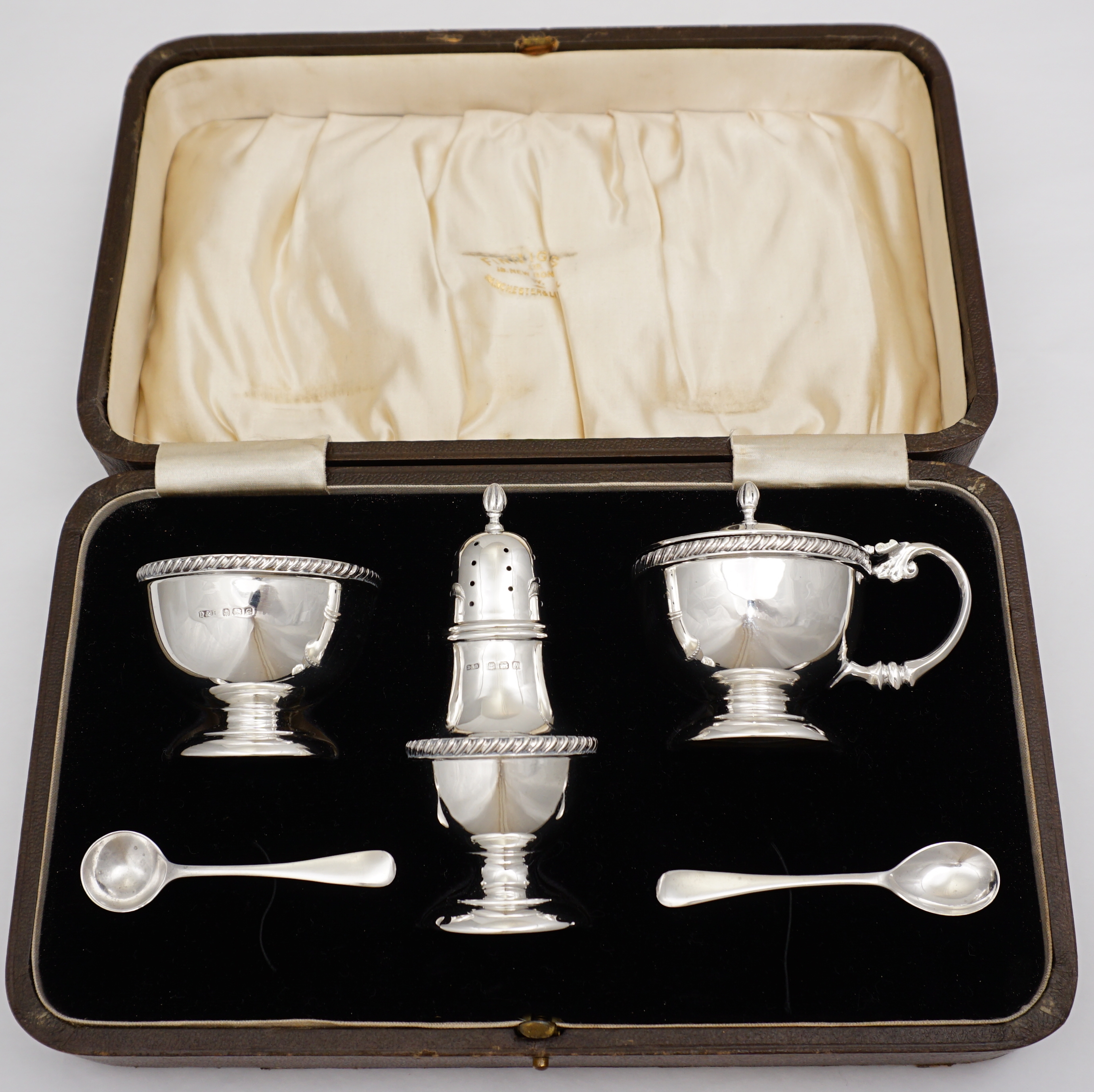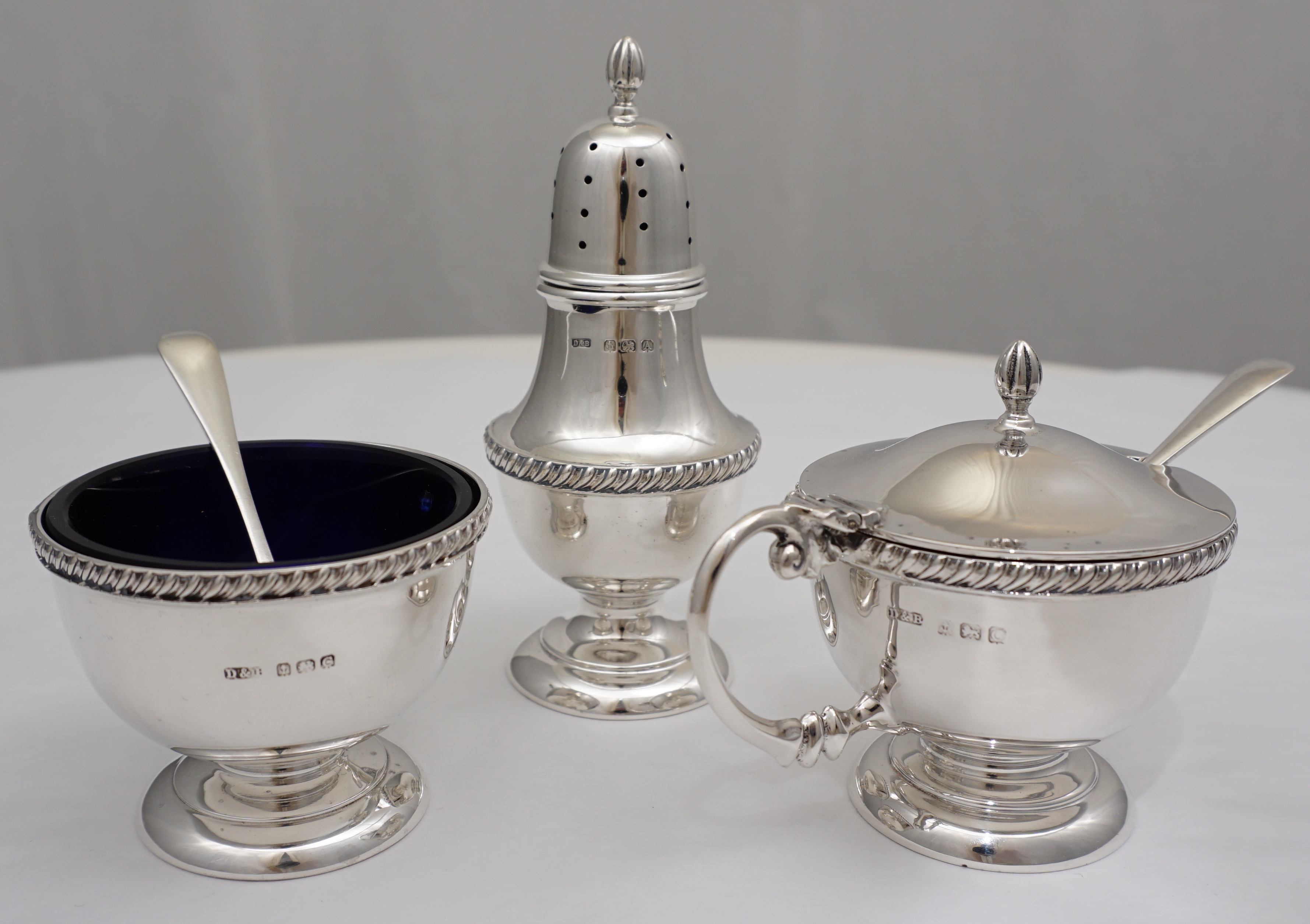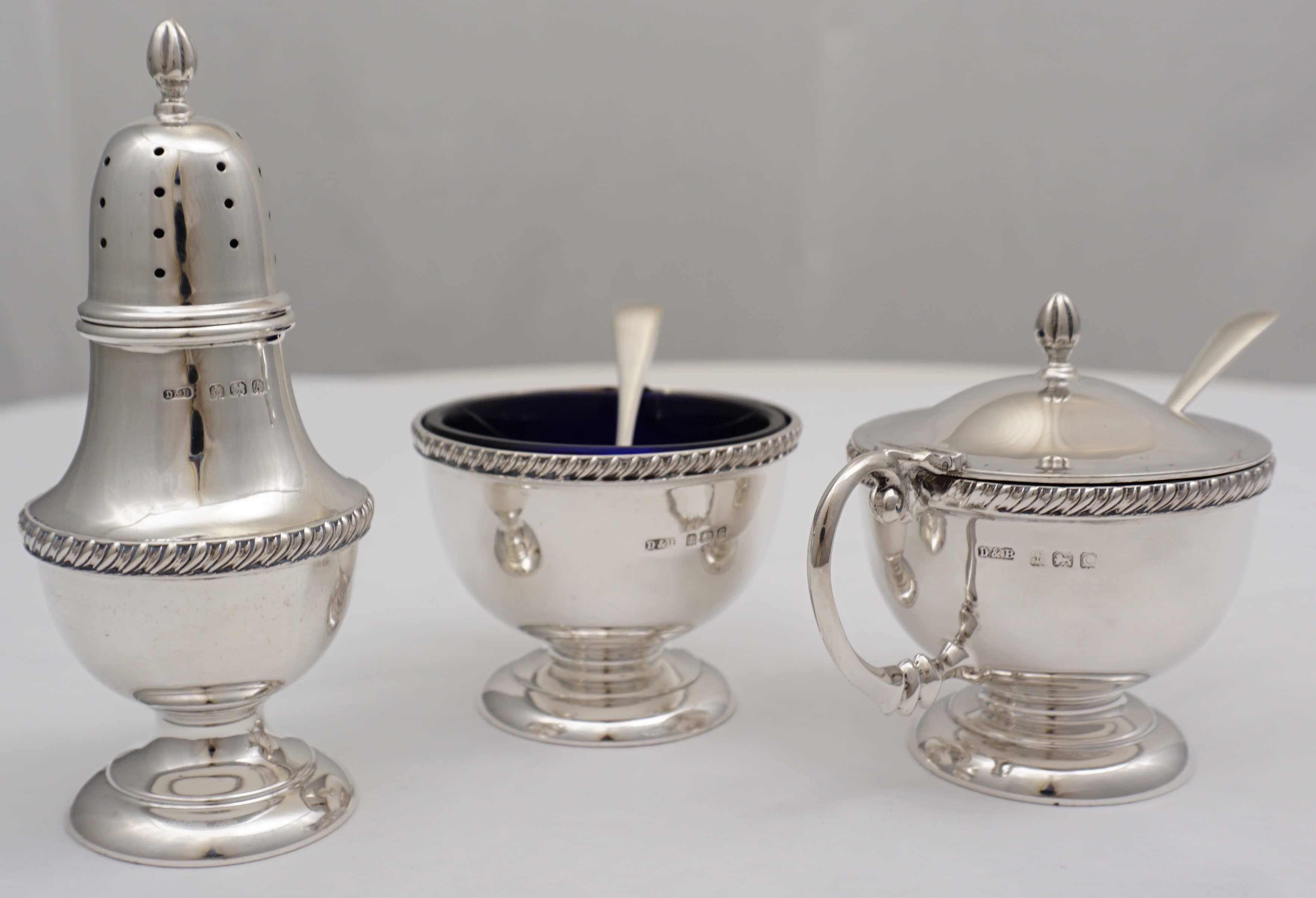 | DESCRIPTION | Cased vintage English solid sterling silver condiment set with blue glass liners. |