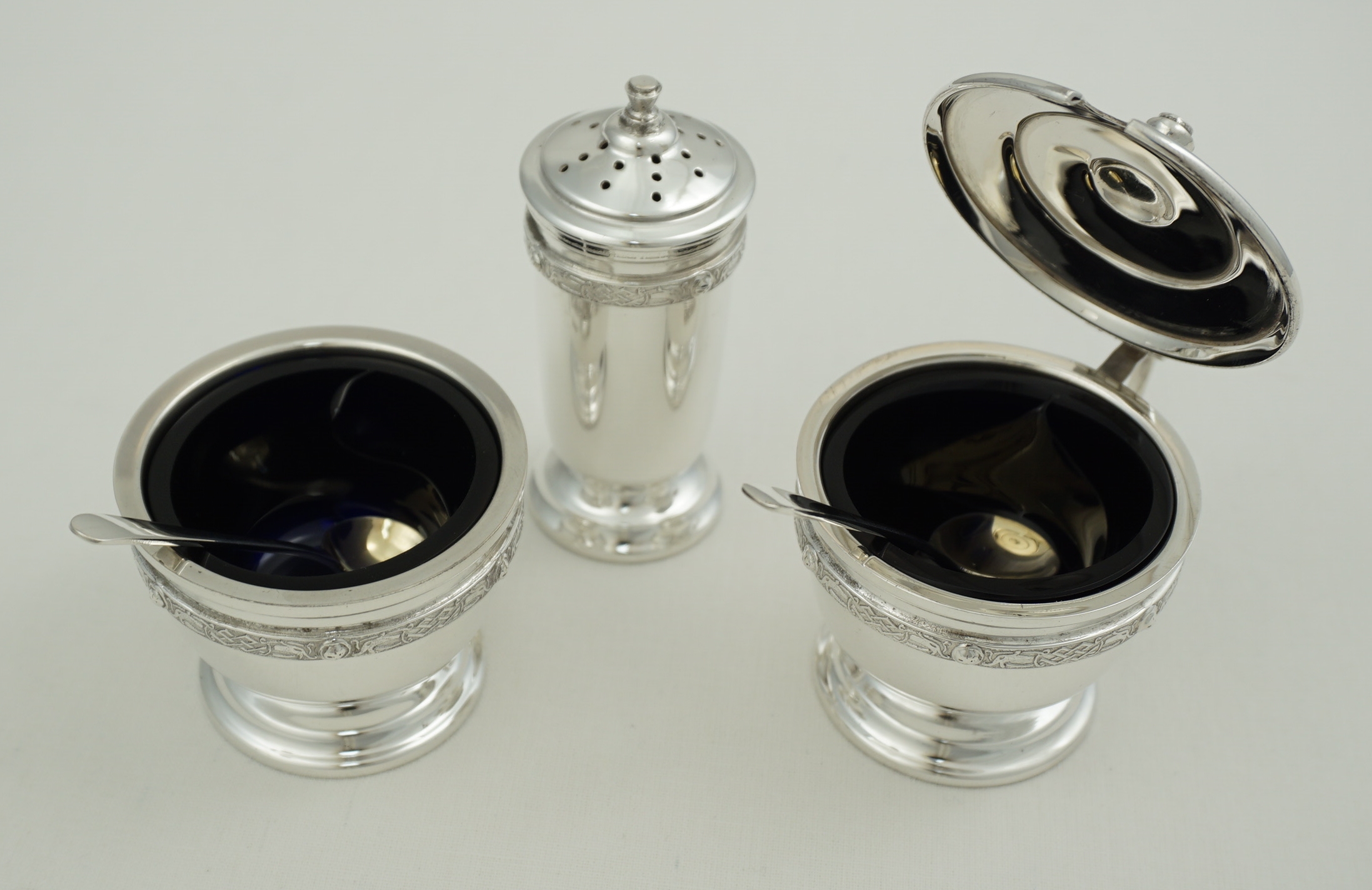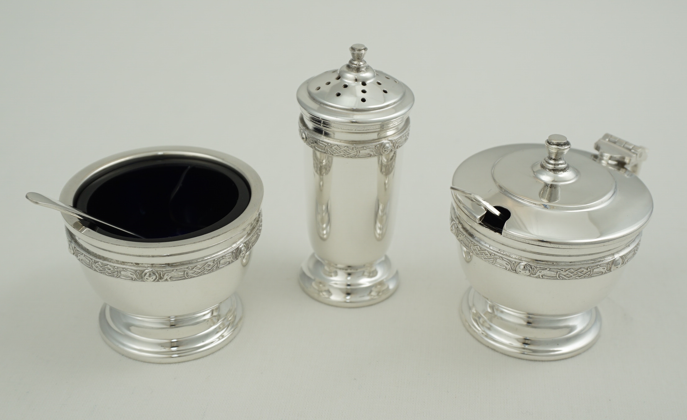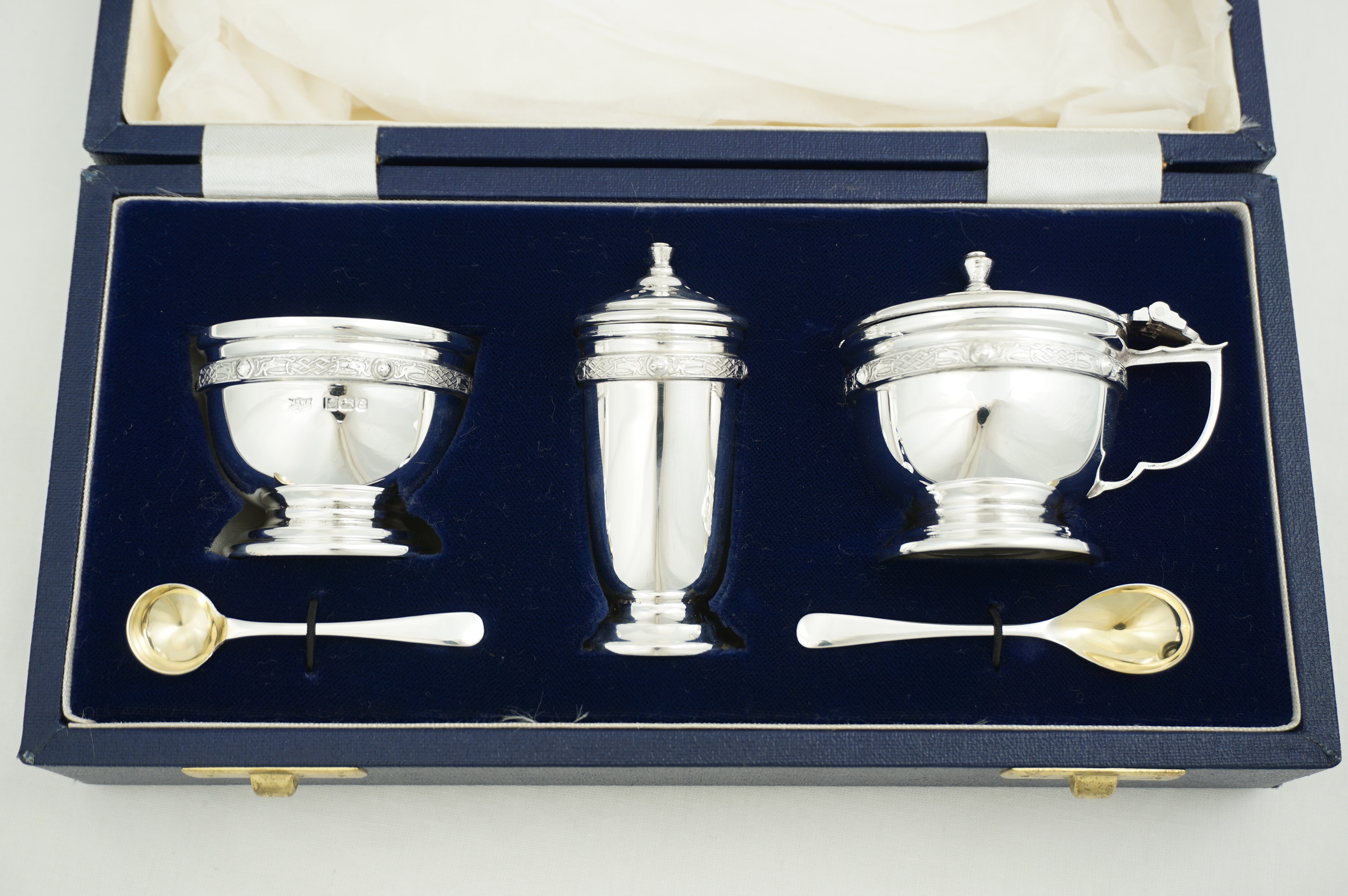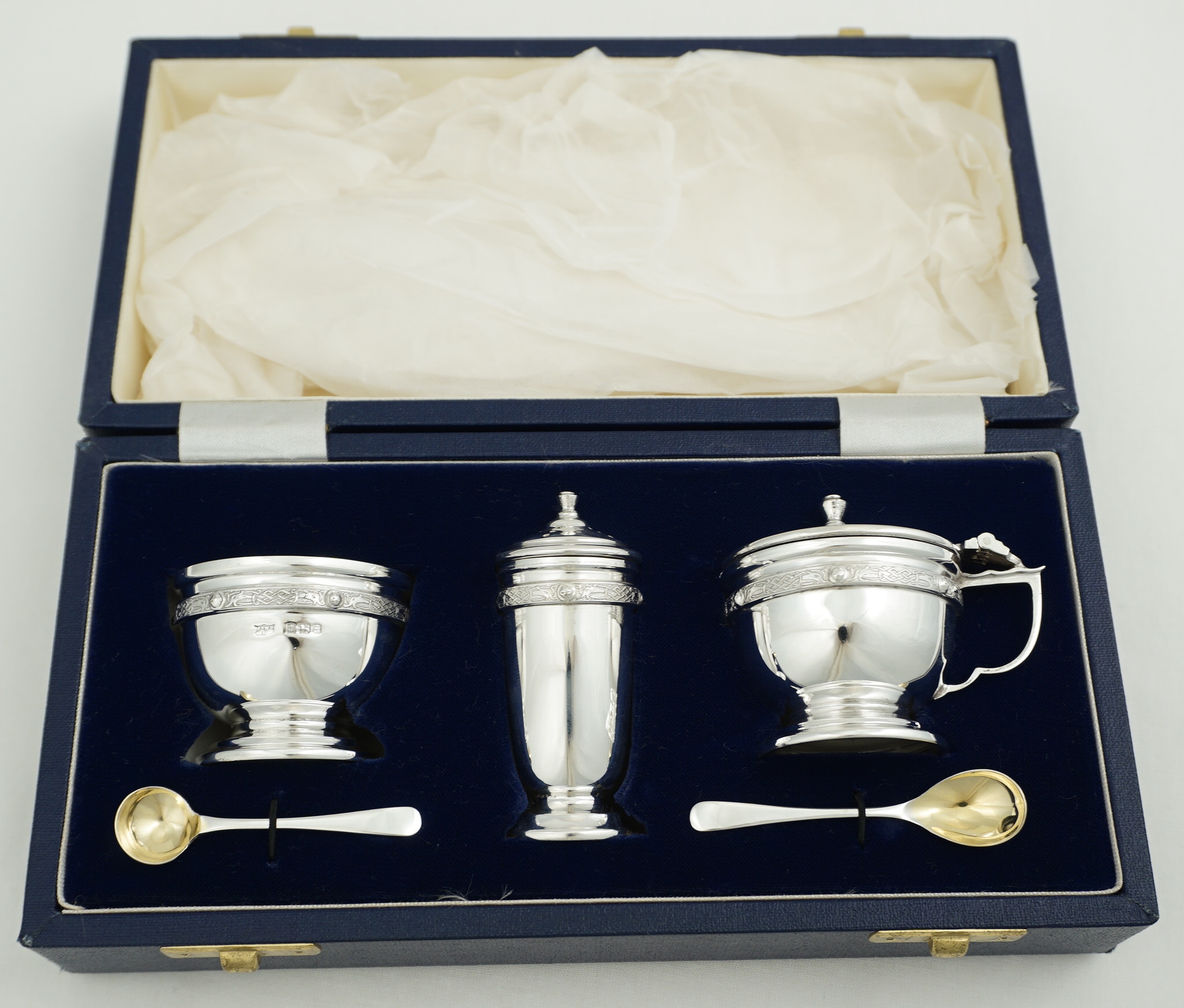 | DESCRIPTION | Good quality cased vintage English solid sterling silver condiment set with a band of Celtic Knot decoration and gilded bowls to the mustard ladle and salt spoon. The condition is extraordinary, appears not to have been used, even the tissue paper within the lid is the original crunchy paper. |