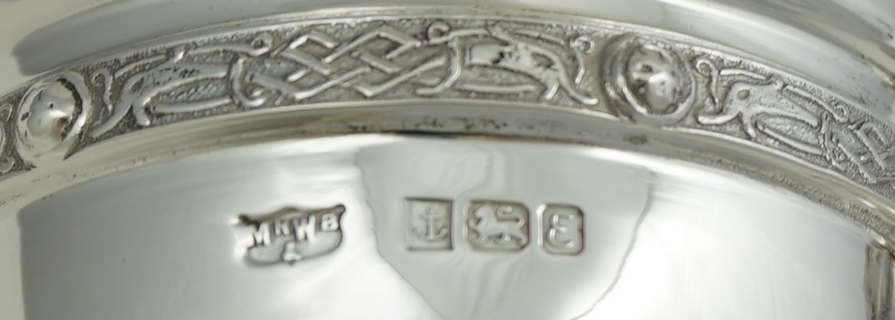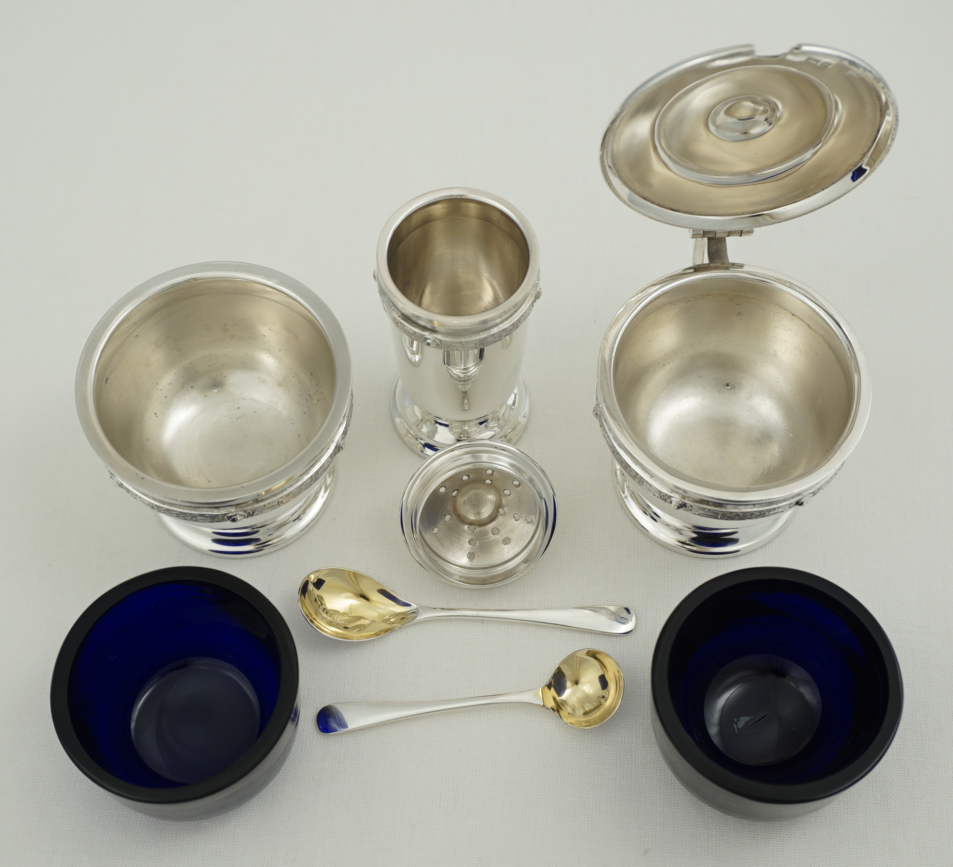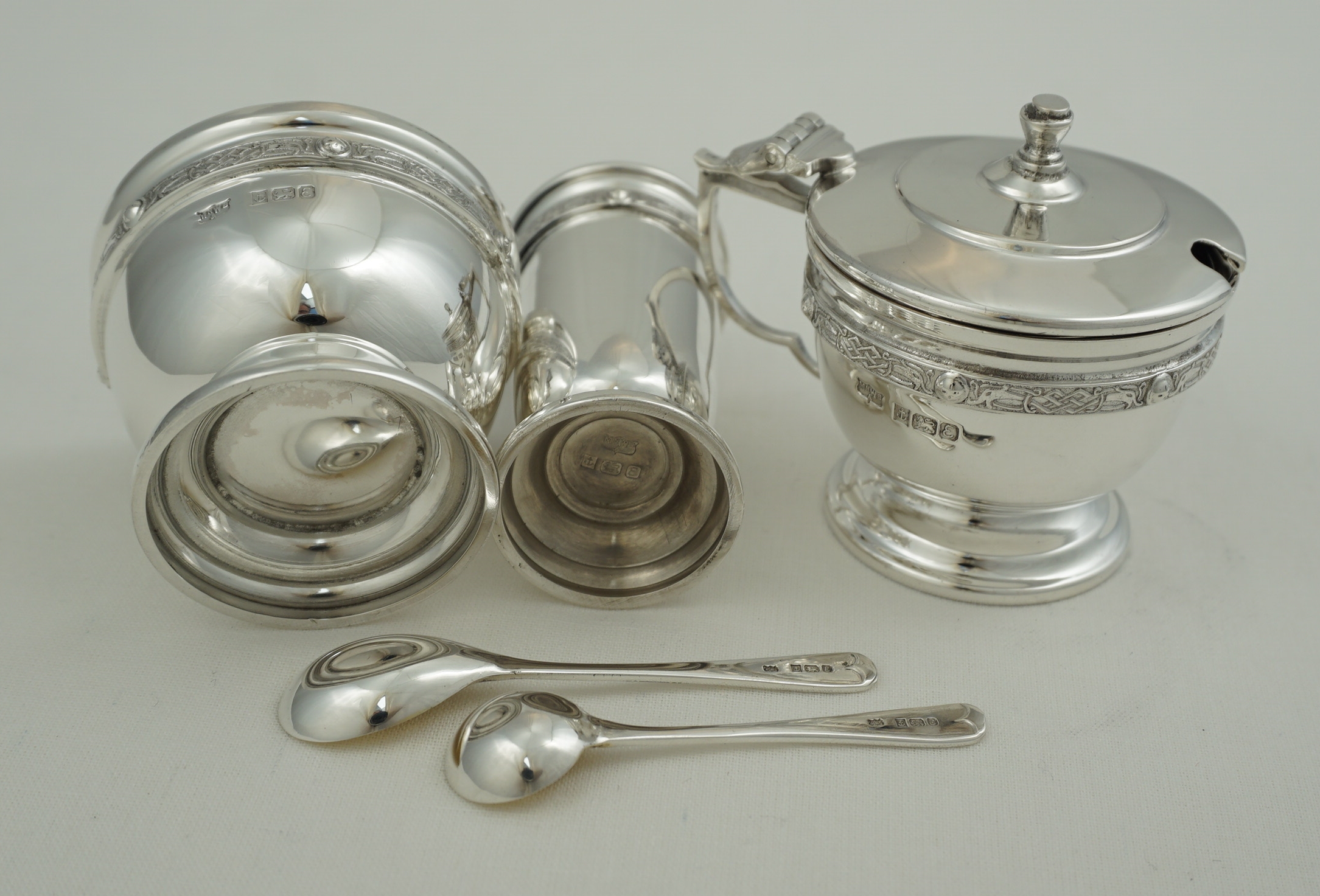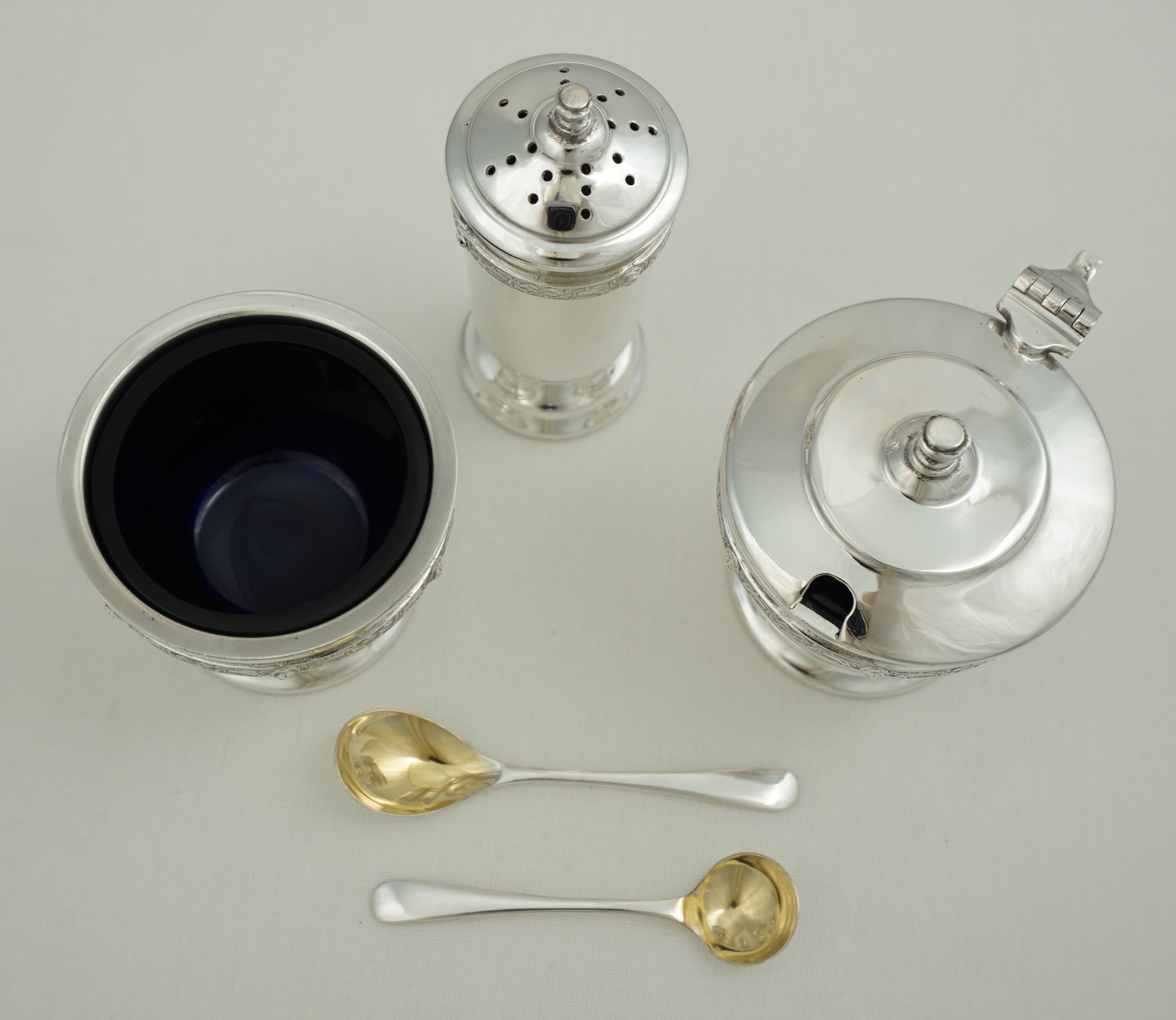 | DESCRIPTION | Good quality cased vintage English solid sterling silver condiment set with a band of Celtic Knot decoration and gilded bowls to the mustard ladle and salt spoon. The condition is extraordinary, appears not to have been used, even the tissue paper within the lid is the original crunchy paper. |