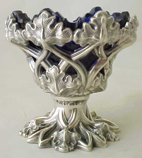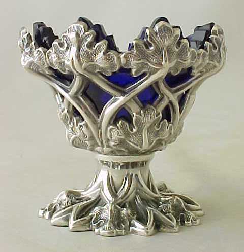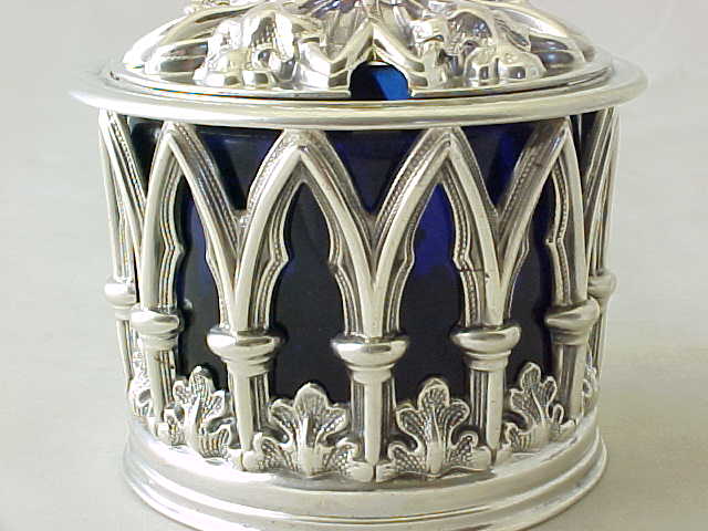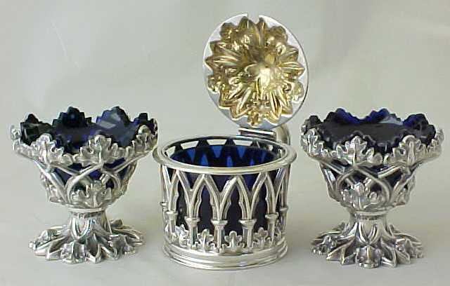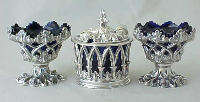 Extraordinary High Victorian Gothic silver three piece condiment set comprising of one large mustard pot and two matching pedestal salts, each with a glass liner. |