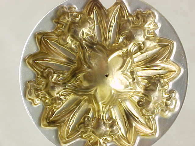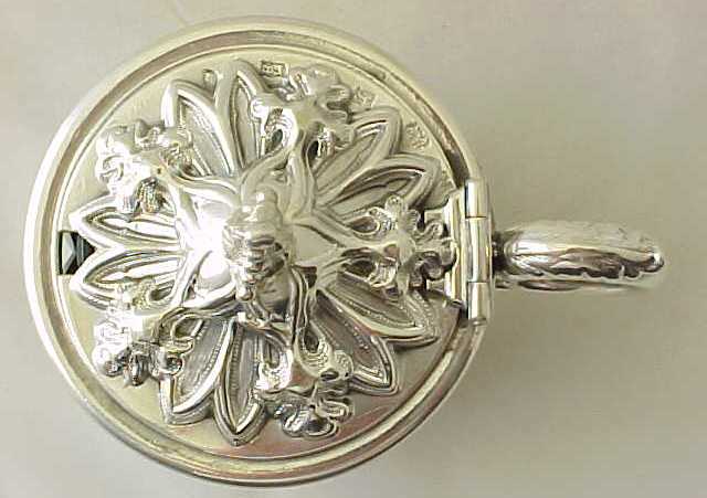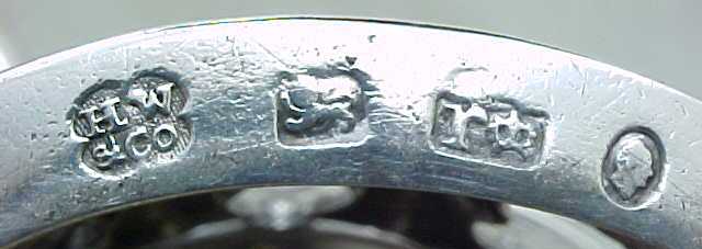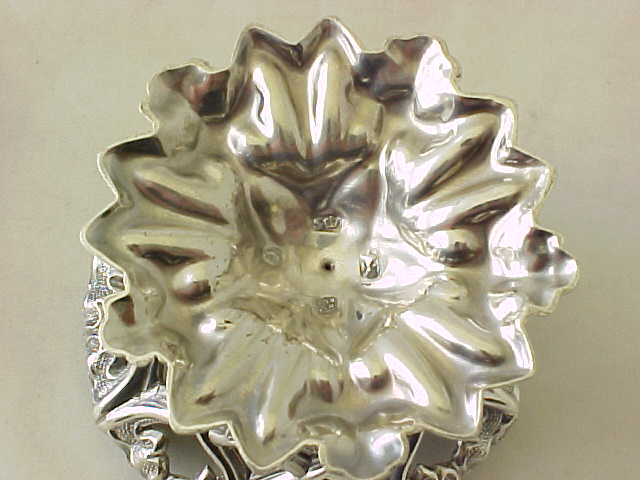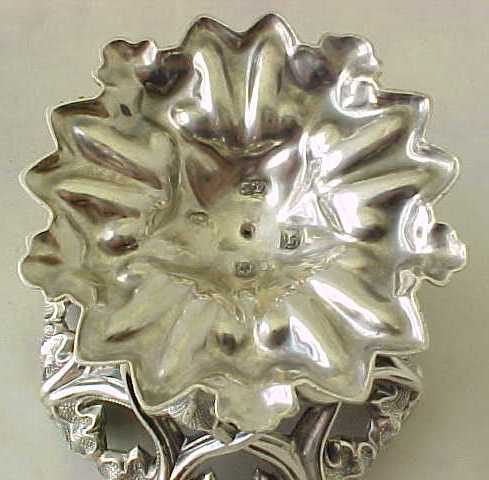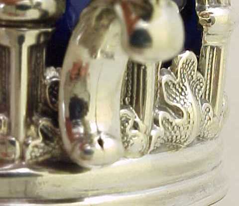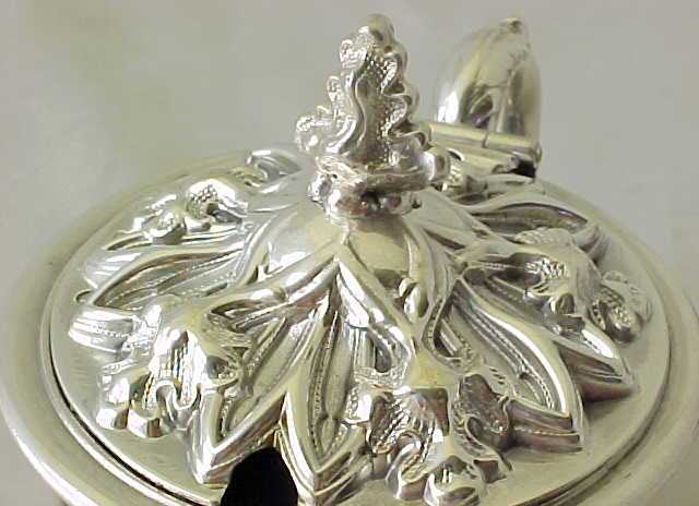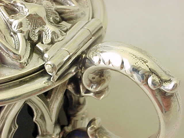 The hollow leaf capped mustard pot handle is slightly askew and there is some wear to the leaf cap. The seam around the expansion hole in the bottom C scroll of the handle is now visible. |