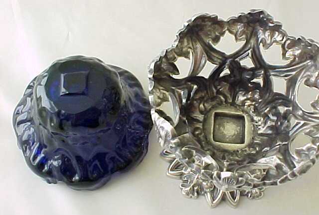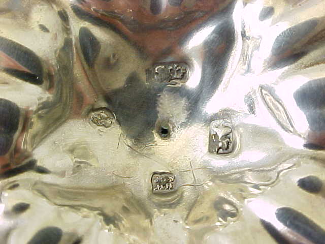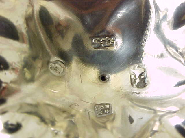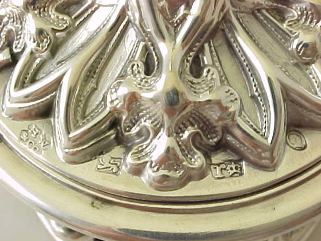 Originally made of very thick metal and so it has survived remarkably well. I have had some high points to the mustard pot lid restored and new gilding to the underside. It is possible that the mustard finial has been reattached in the past. One glass salt liner is a very good replacement. Some rim chips to the salt liners, one quite large, but they tend to blend into the general design. |