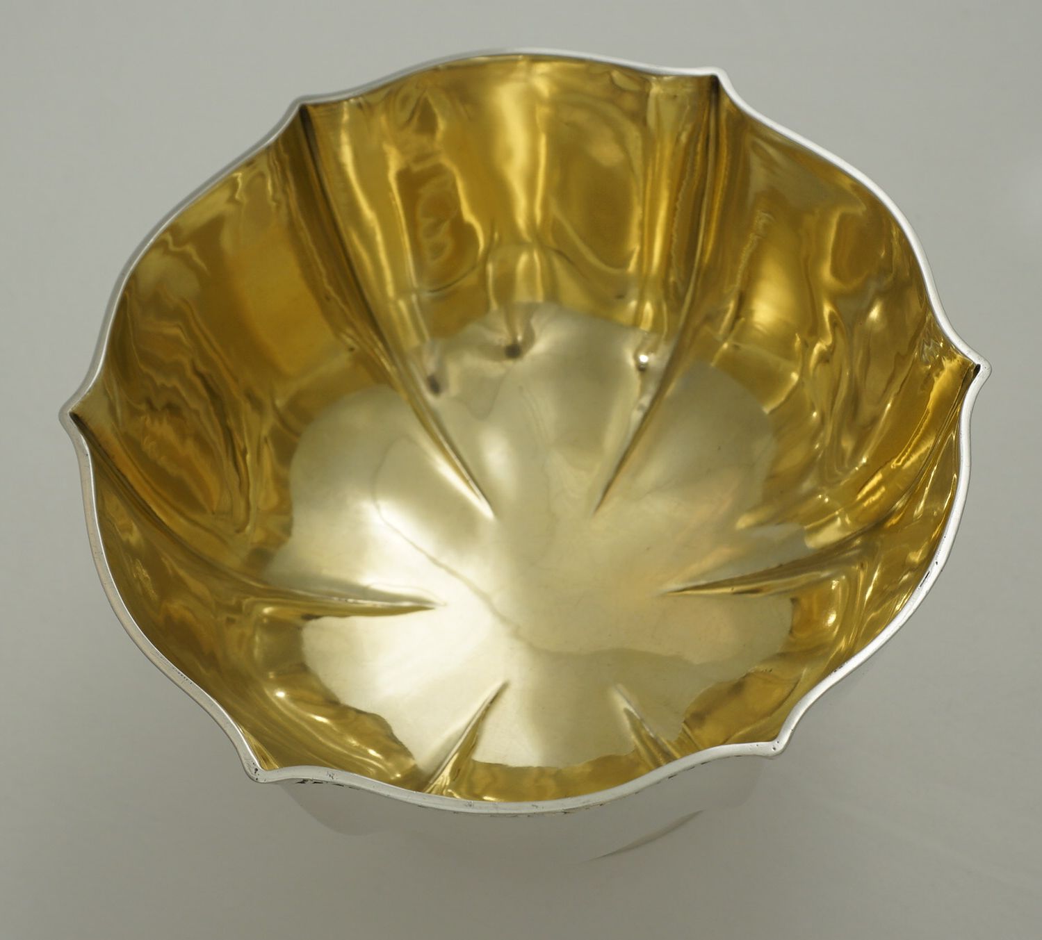 | DESCRIPTION | Antique English solid sterling silver wavy hexaform pedestal bowl with a brightly gilded interior. Not a discreet item, in fact, rather large and blingy with polished silver and gold. |