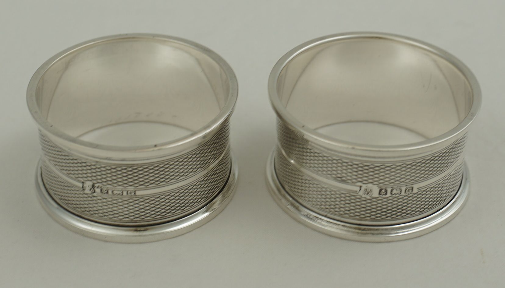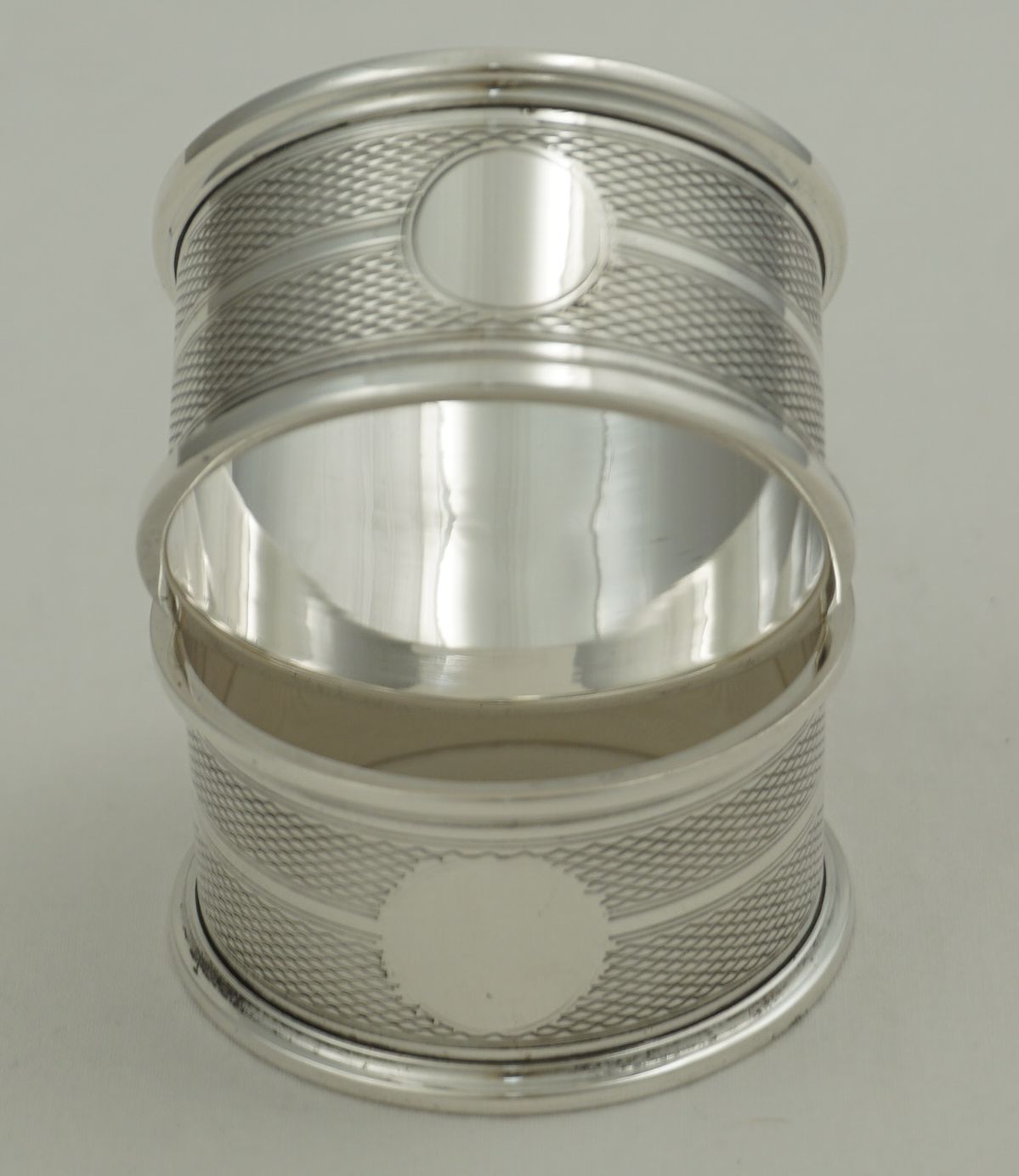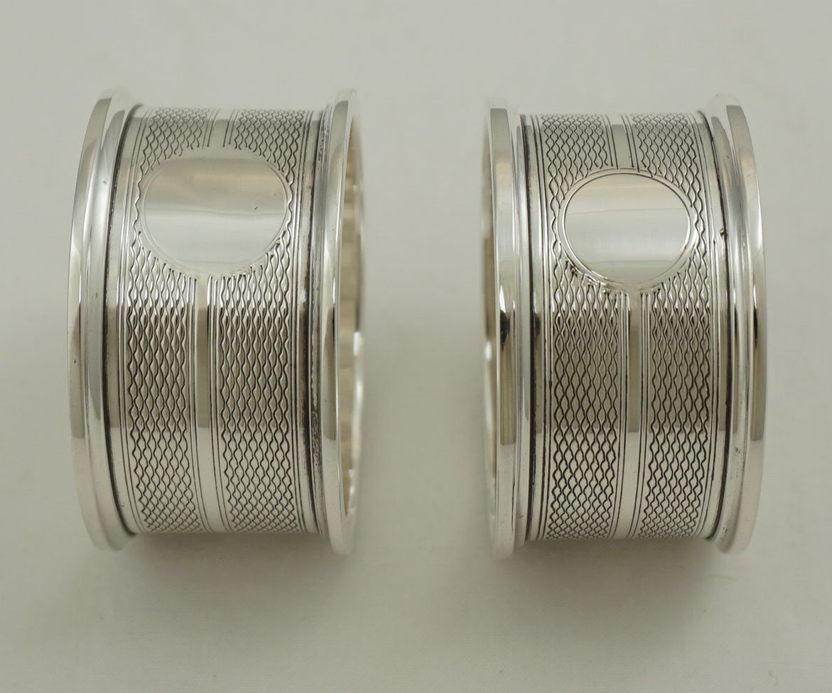 | DESCRIPTION | Pair of vintage English solid sterling silver napkin rings with engine turned engraved decoration and blank circular cartouches. |