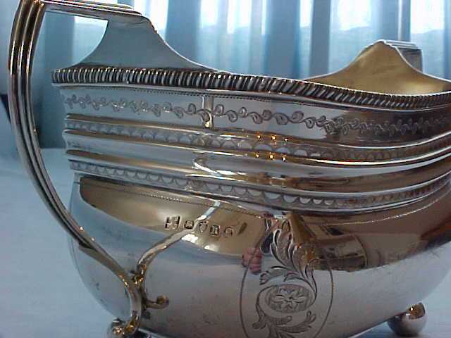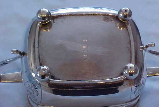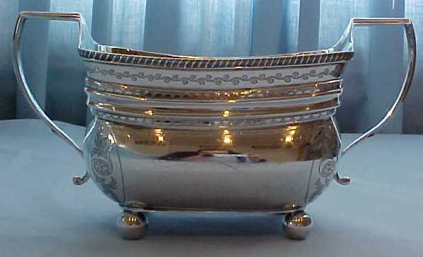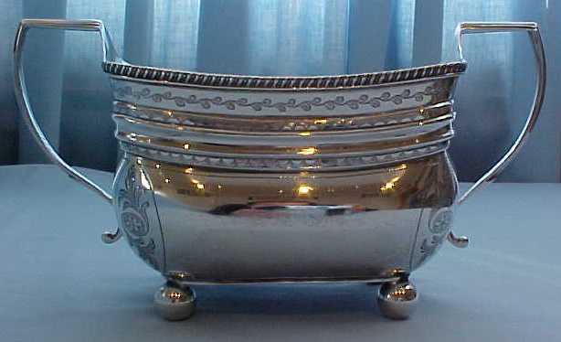 Large, quality Georgian silver two handled sugar bowl with a gilded interior and engraved 'MMT' to the base. | |