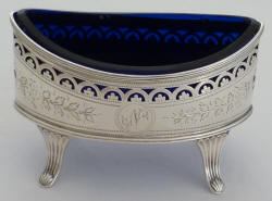 Mustard pot with gilded interior and blue glass liner, London 1835, ladle 1822, silver 143g. |