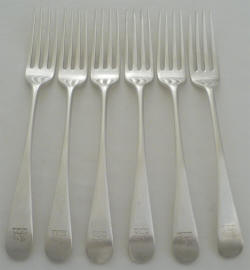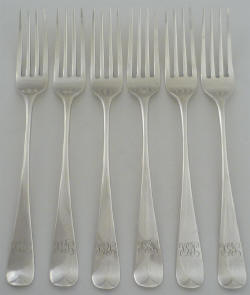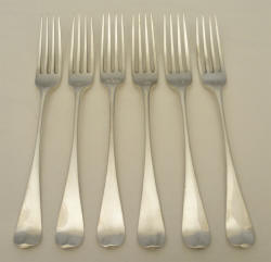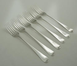 Six 8" Fiddle table forks, London 1830, 404g. |