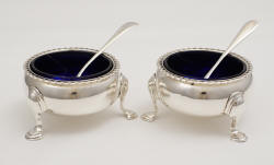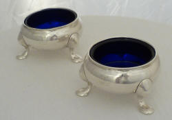 Pair 2 ¼" cauldron salts with blue glass liners and gilded interiors, David Mowden, London 1766, silver 78g. |