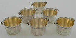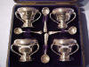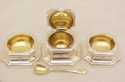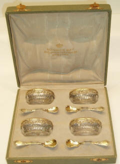 Four silver gilt mounted cut glass salts with shovels, Heinrich Mau, Dresden Germany, 1900. |