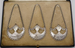 Cased set of three 2" cast silver spirit labels in the neo-classical urn form innovated by Hester Bateman, D & J Wellby, London 1911, 50mm, 29g. |