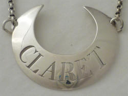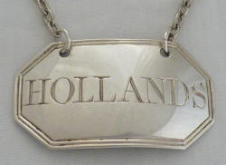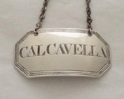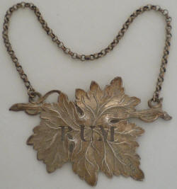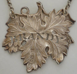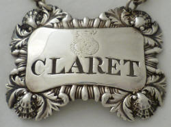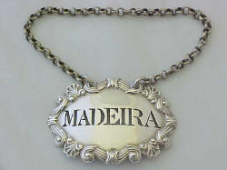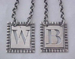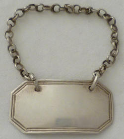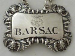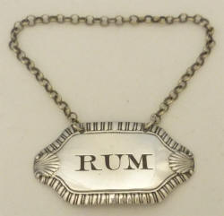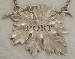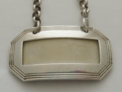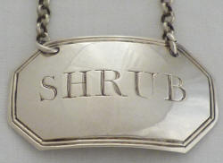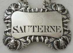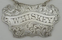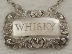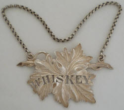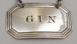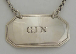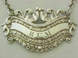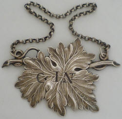 Pair 2 ¼" cast silver labels pierced 'GIN' and 'SCOTCH' depicting a putto offering a cup of wine to Dionysus, Israel Freeman, London 1937, 47g. |