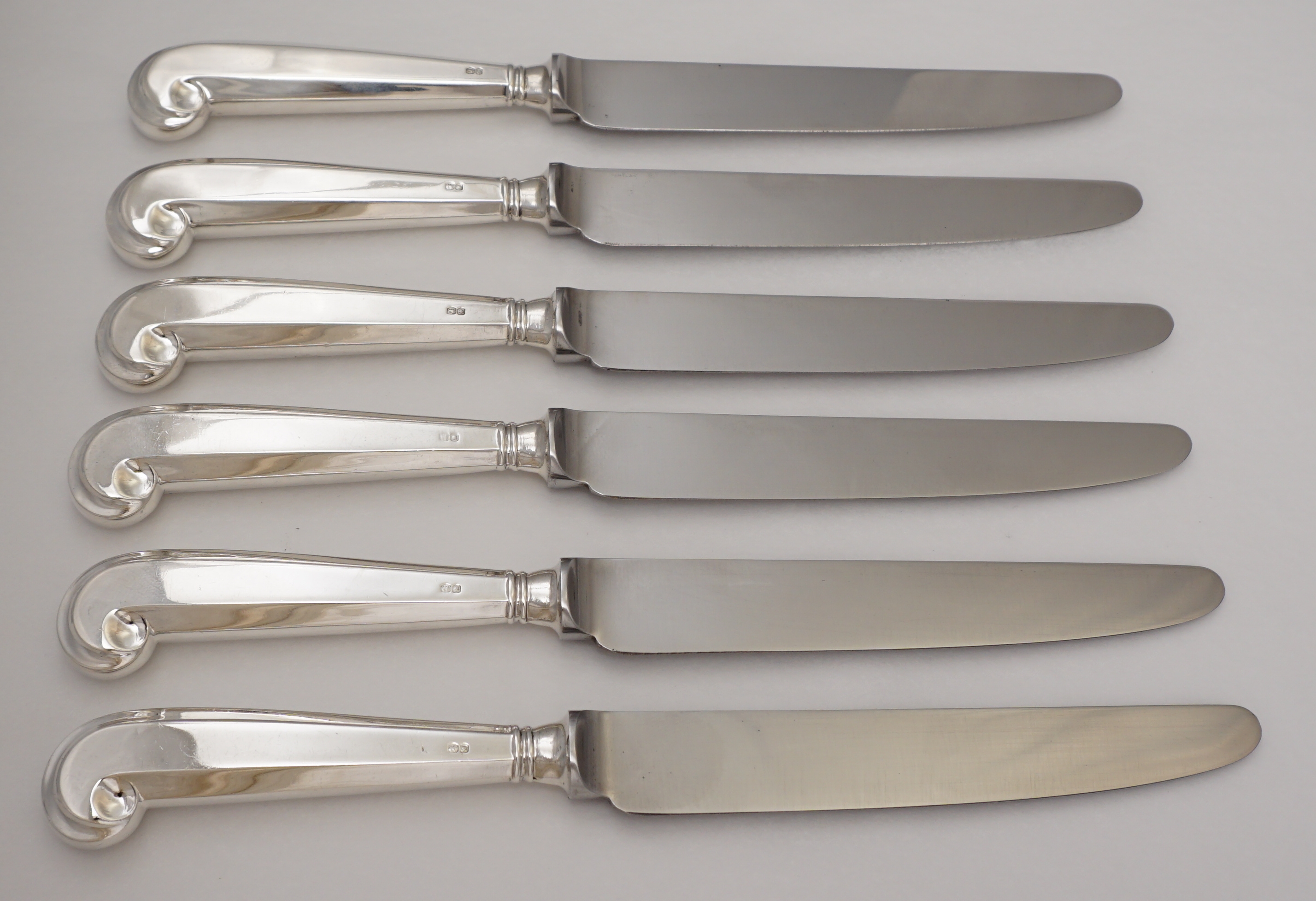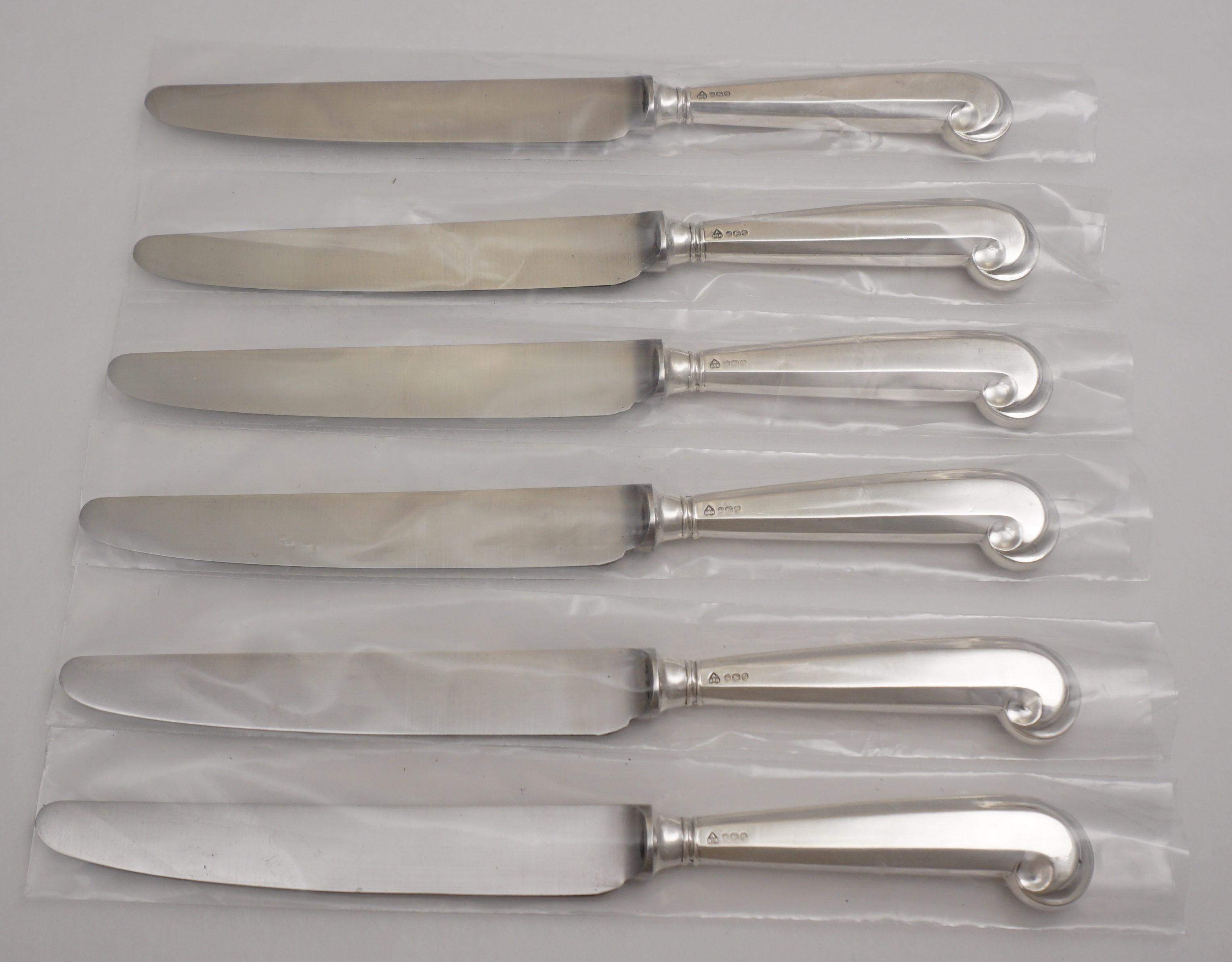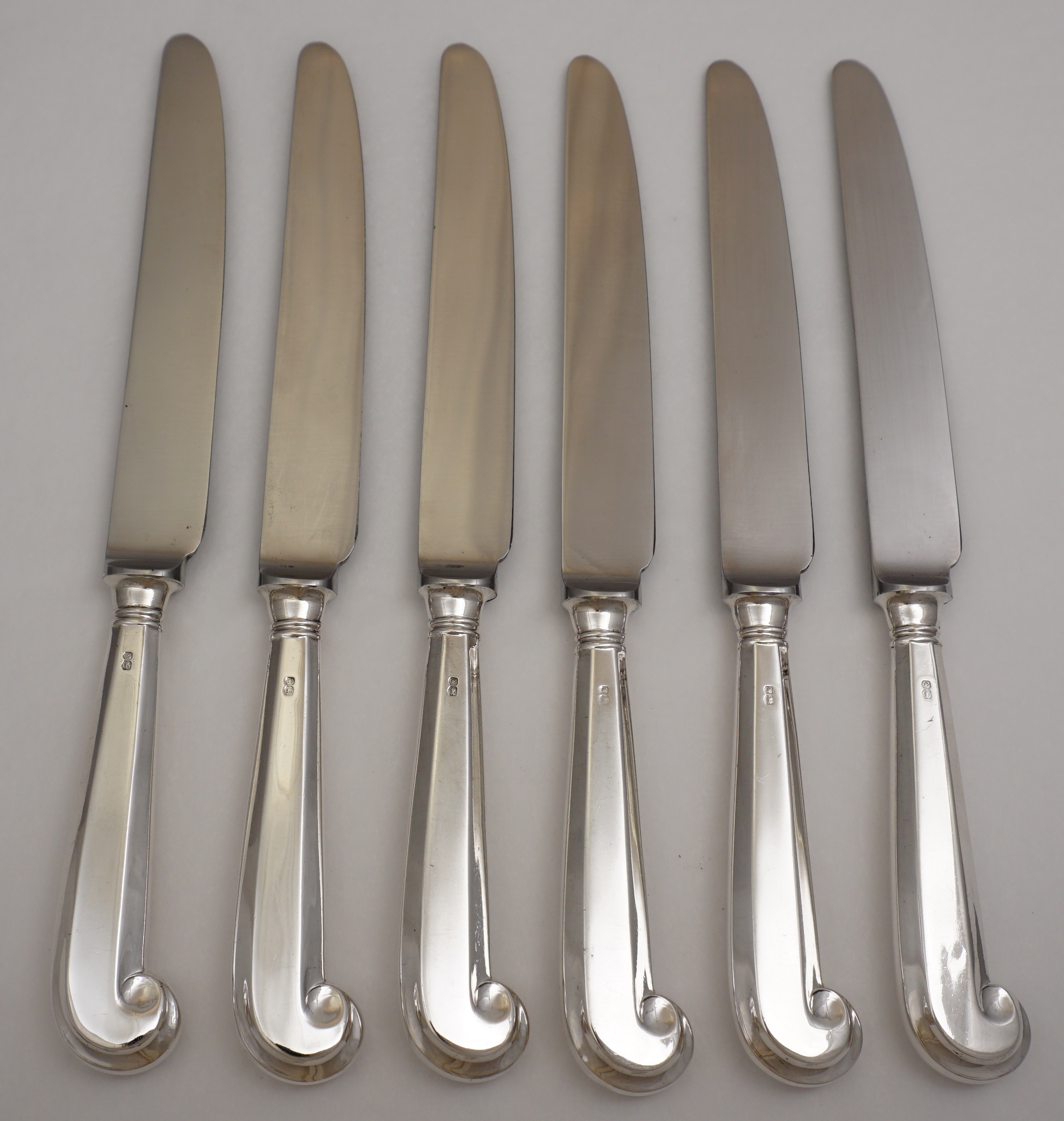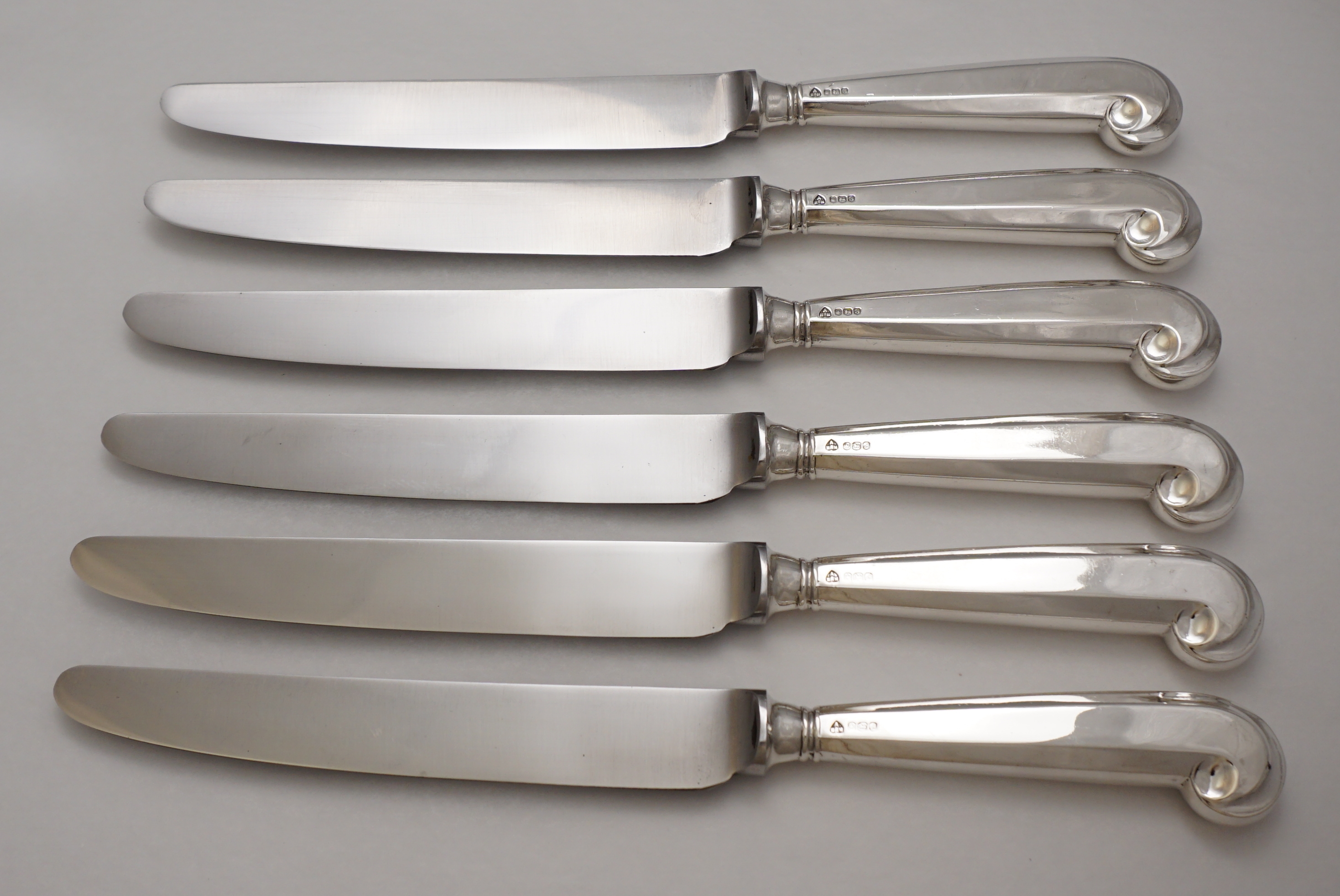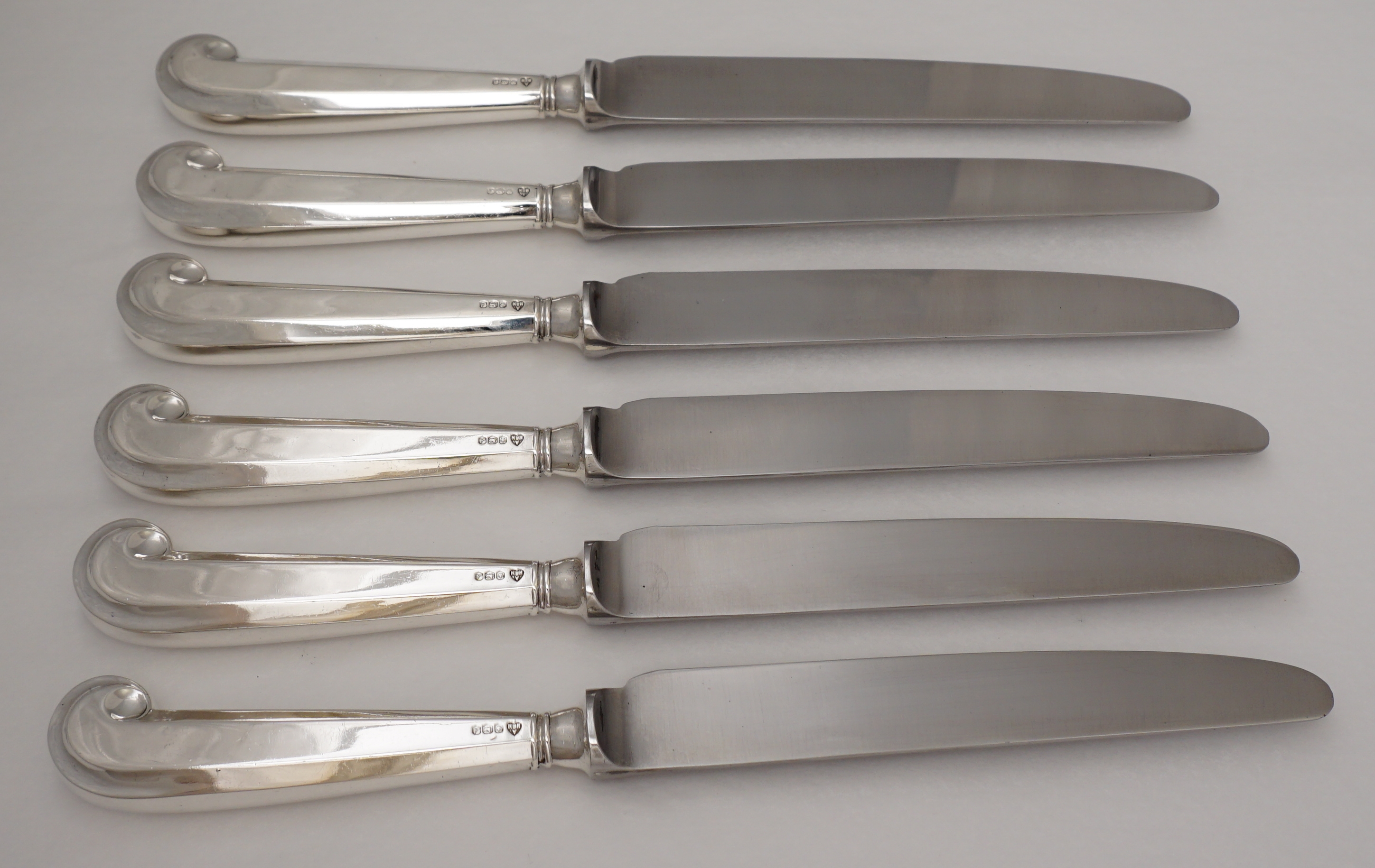 | DESCRIPTION | Excellent set of six vintage English loaded solid sterling silver facetted Pistol Grip pattern table knives with stainless steel blades. Pistol Grip knives were originally used with Hanoverian and early Old English pattern flatware. These have the significant advantage of soldered joints so can be safely cleaned in a dishwasher. |