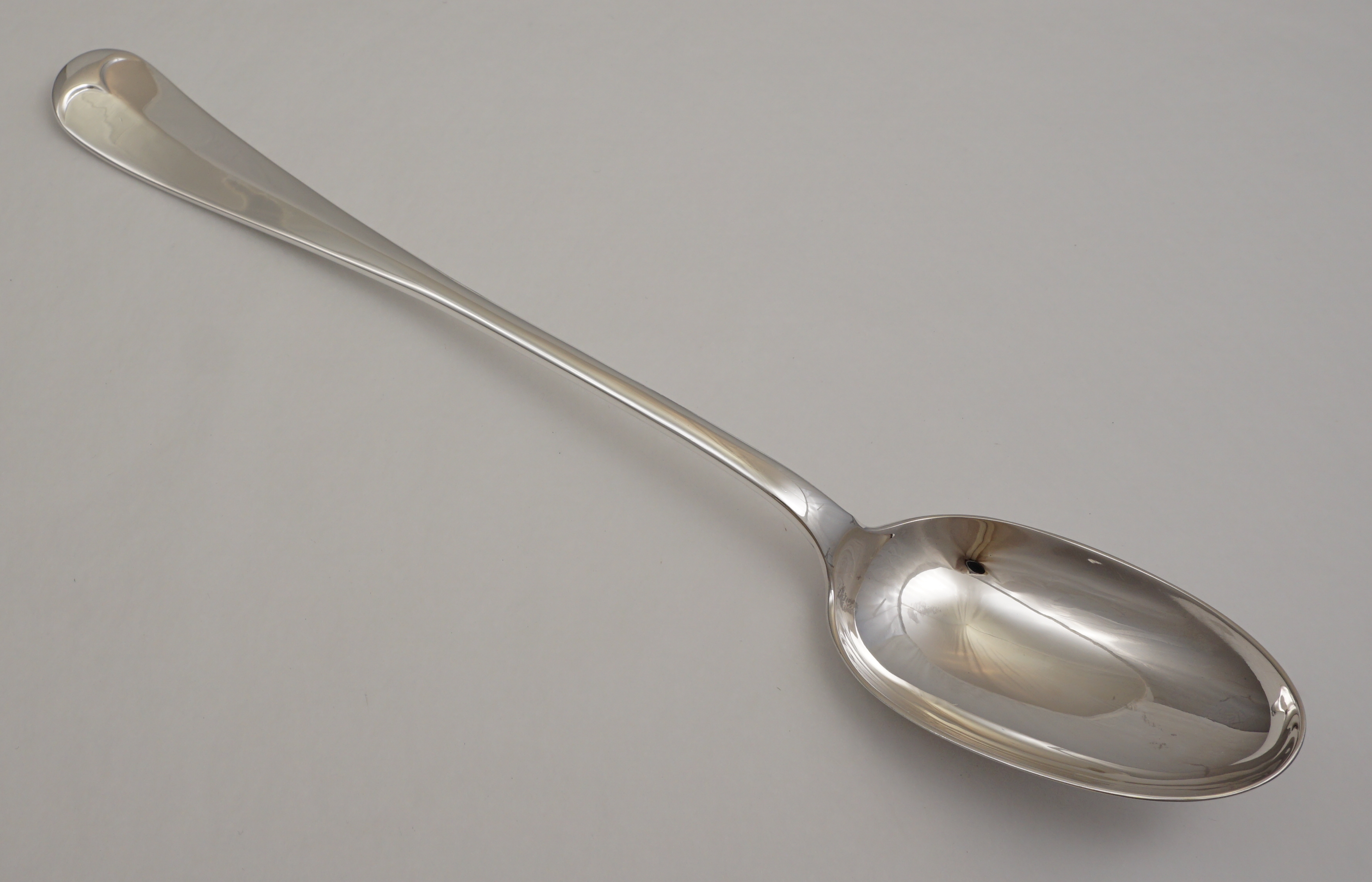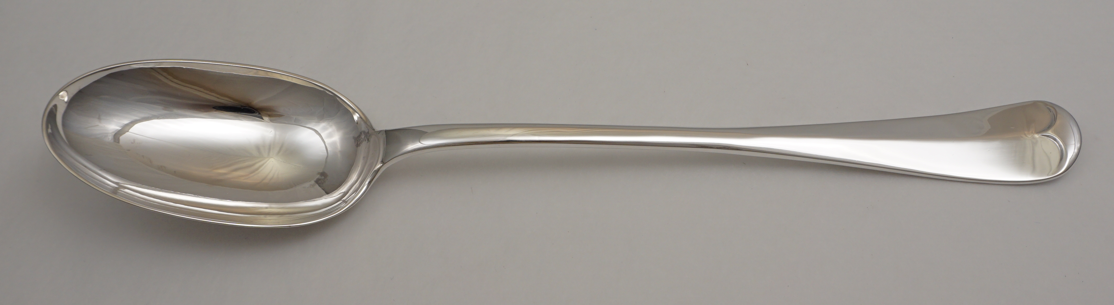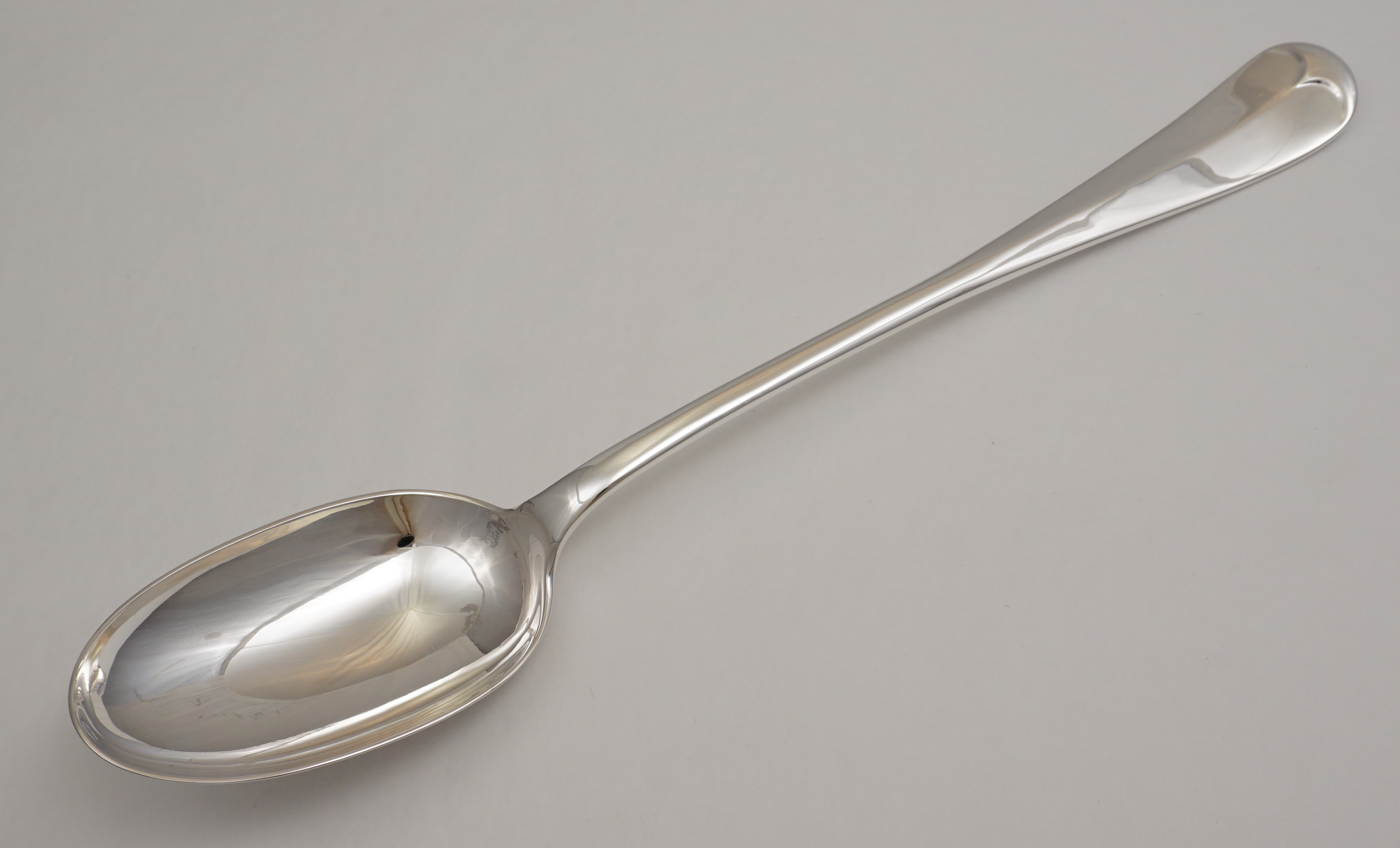 DESCRIPTION | Very good vintage English George V solid sterling silver Hanoverian with Rat-Tail pattern basting/gravy/stuffing spoon. No engraving or erasure, heavy, almost unnecessarily thick metal. |