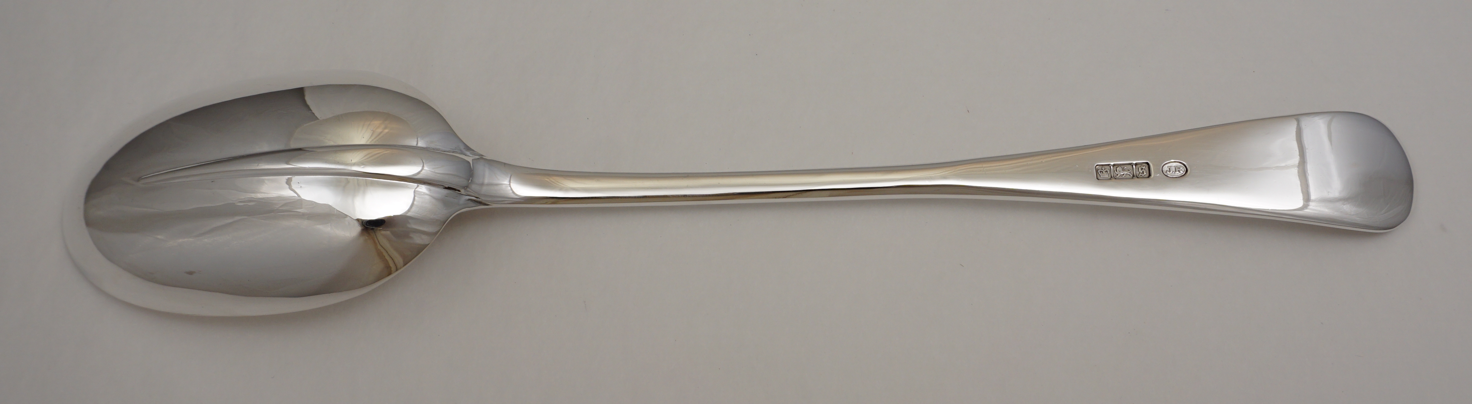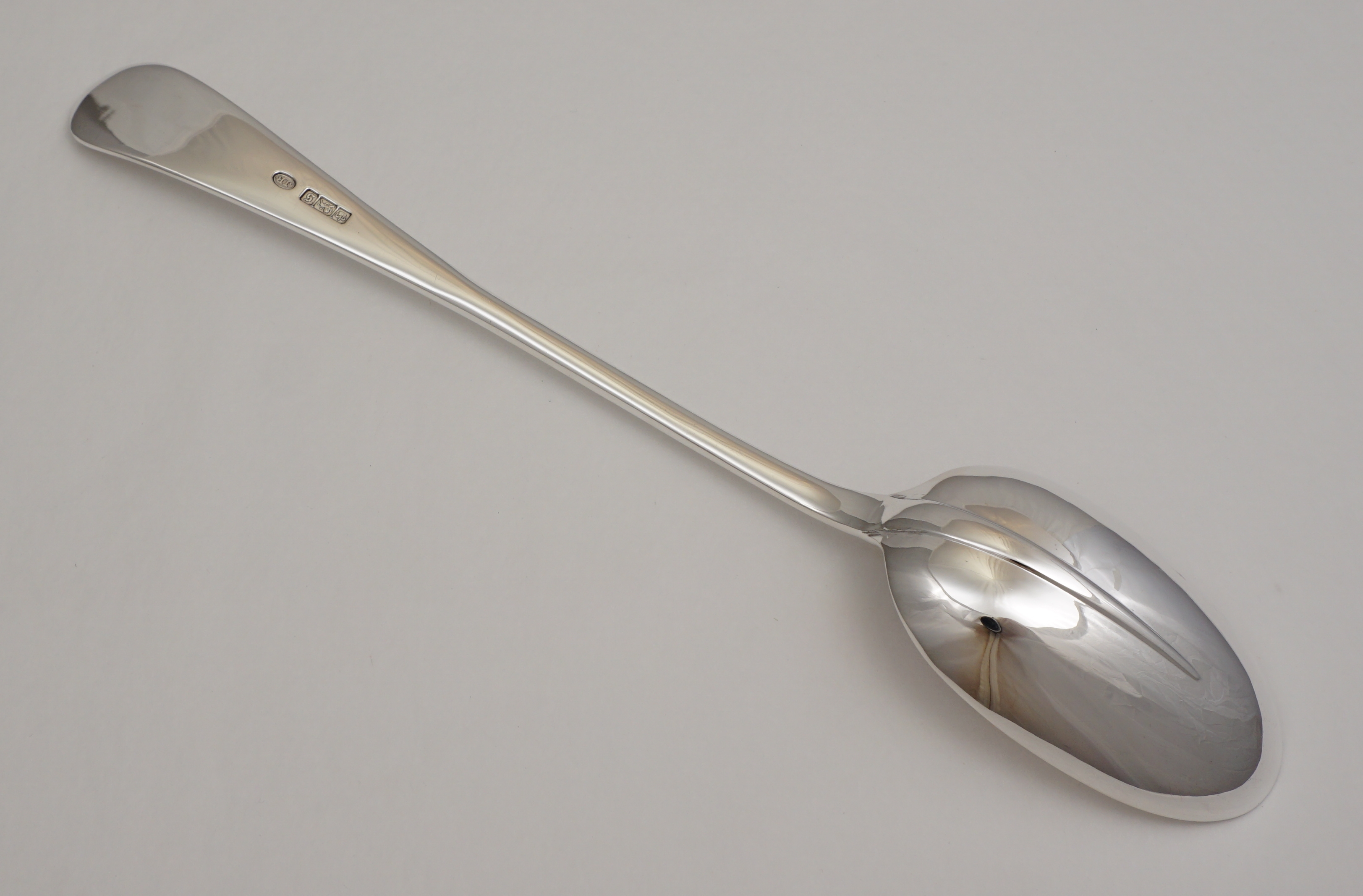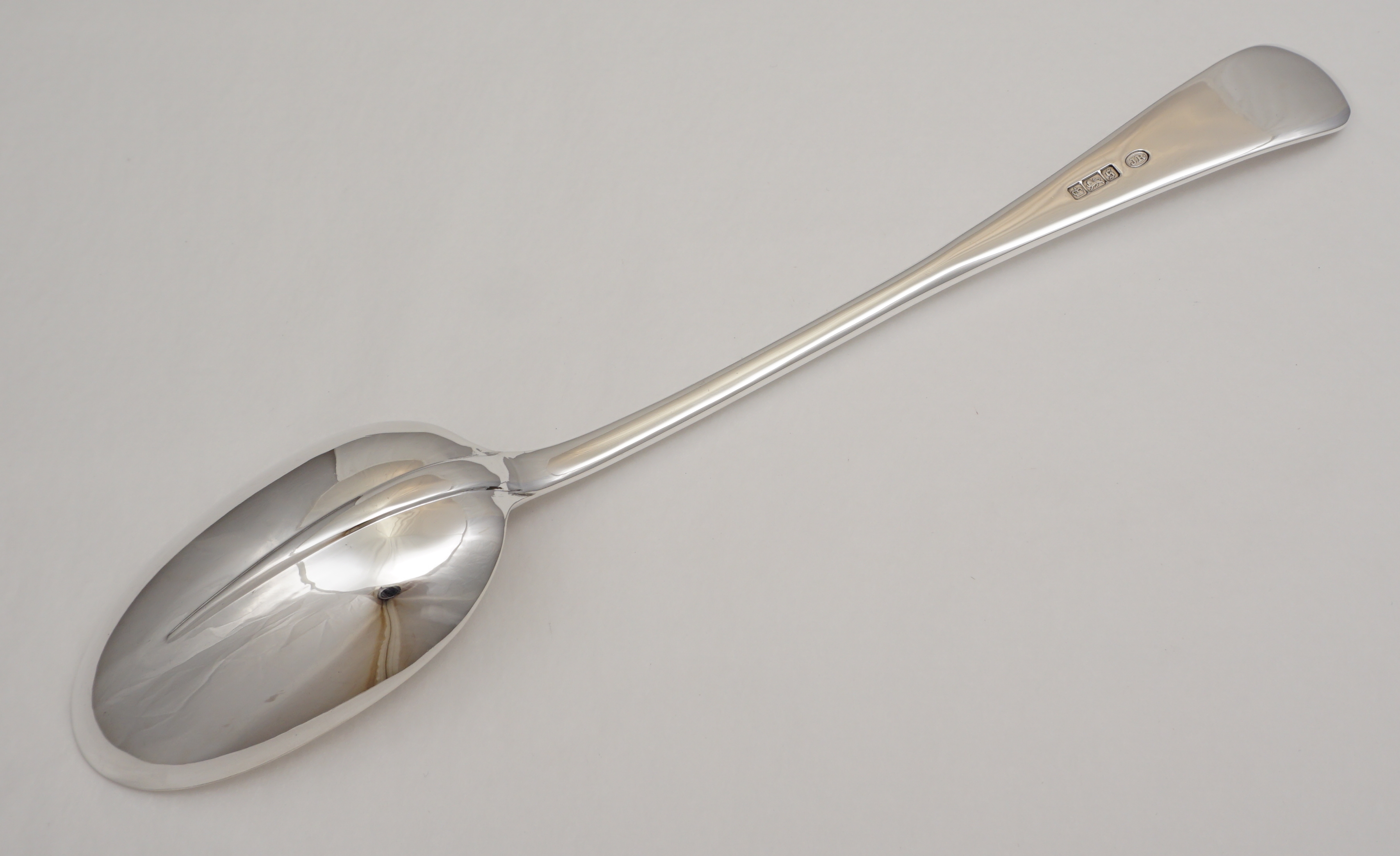 DESCRIPTION | Very good vintage English George V solid sterling silver Hanoverian with Rat-Tail pattern basting/gravy/stuffing spoon. No engraving or erasure, heavy, almost unnecessarily thick metal. |