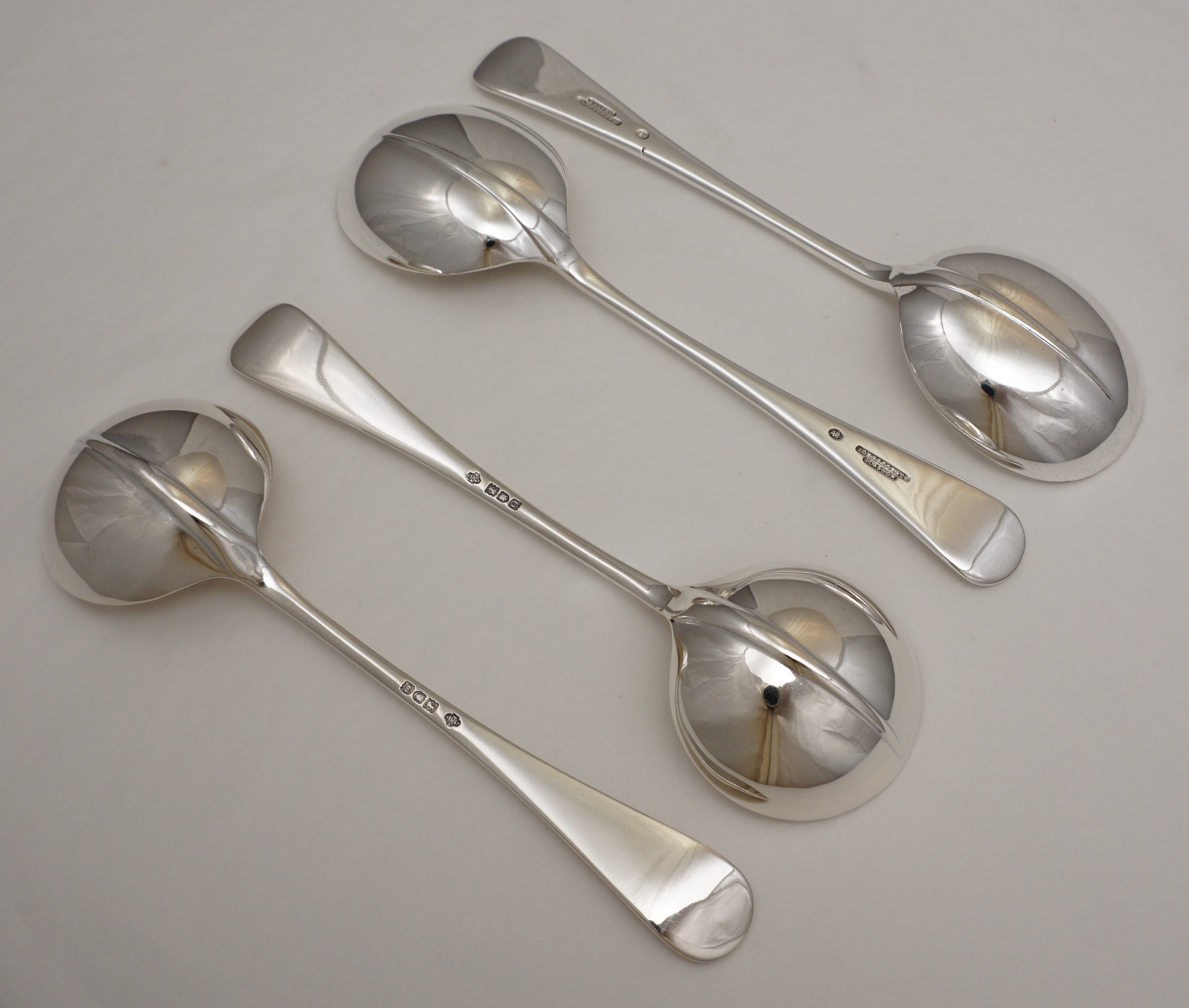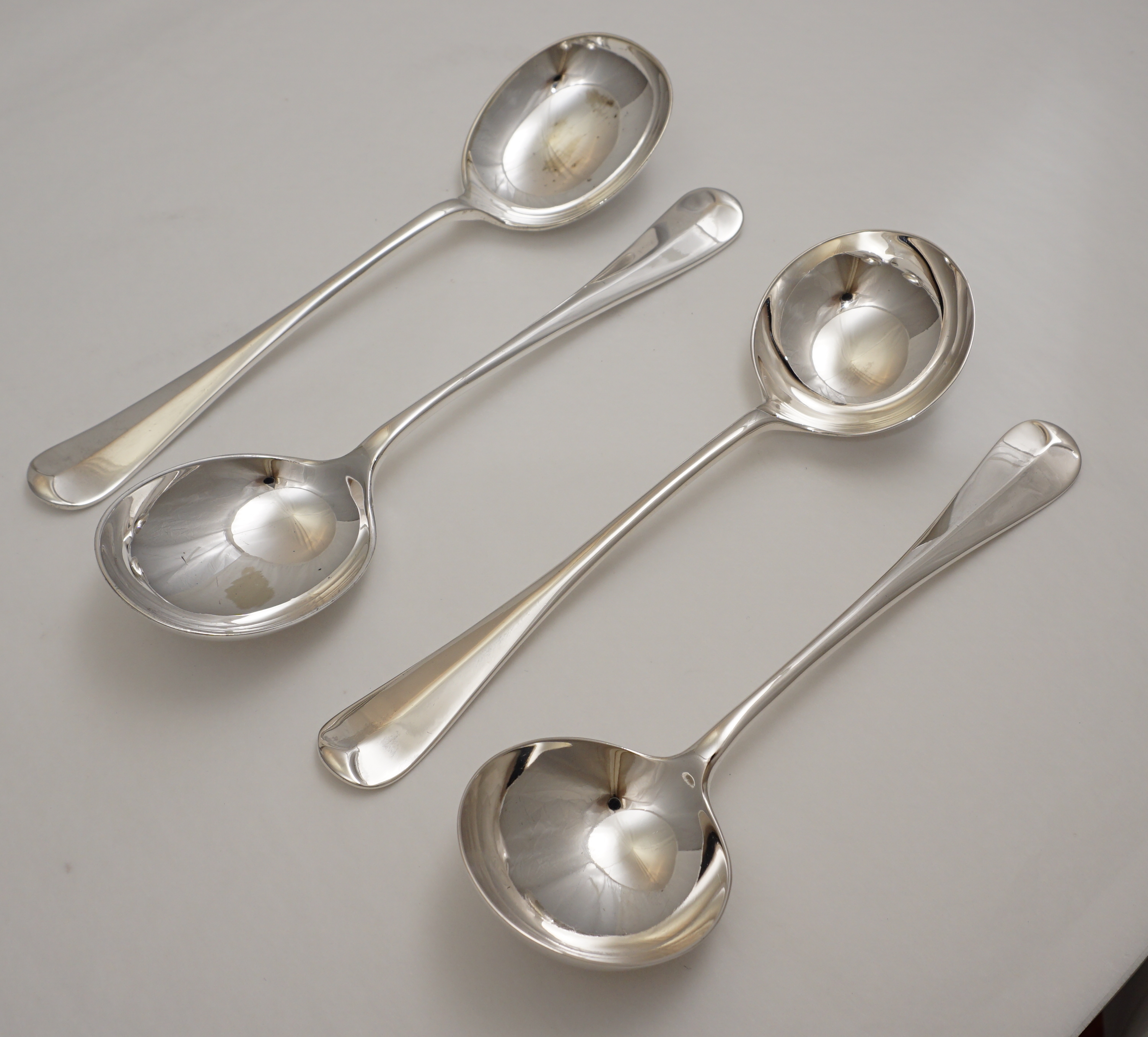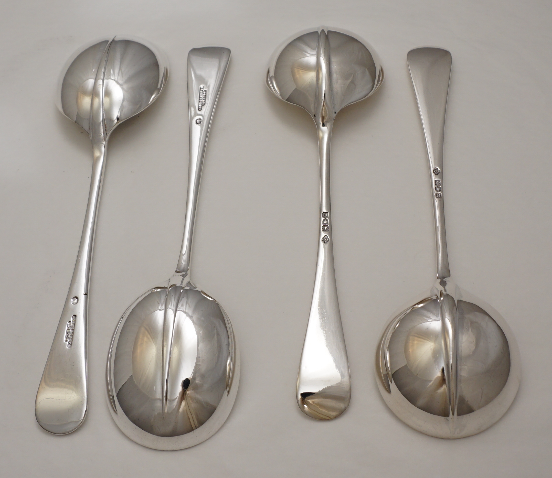 DESCRIPTION | Good pair of antique English Edwardian solid sterling silver Hanoverian with Rat Tail pattern round bowled soup spoons with no engraving or erasure. Included FREE is a slightly larger but otherwise very similar pair of Scottish Victorian silver plated soup spoons in used condition. |