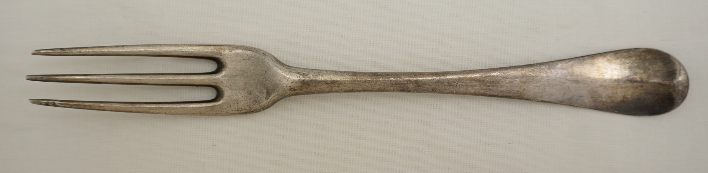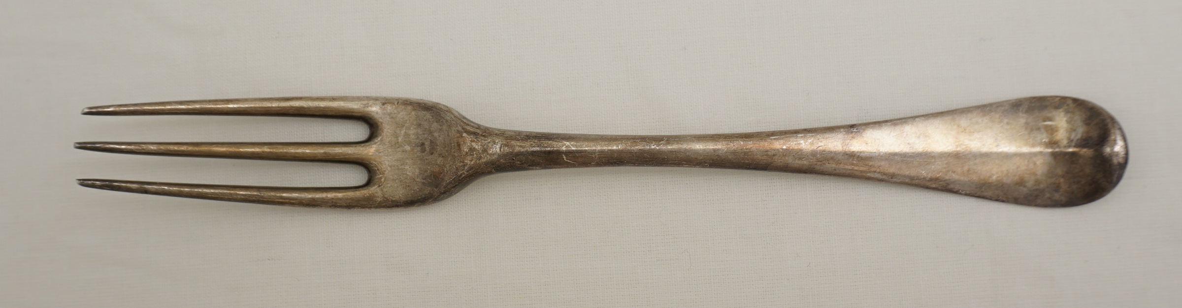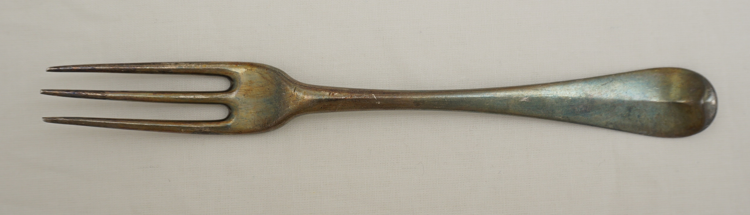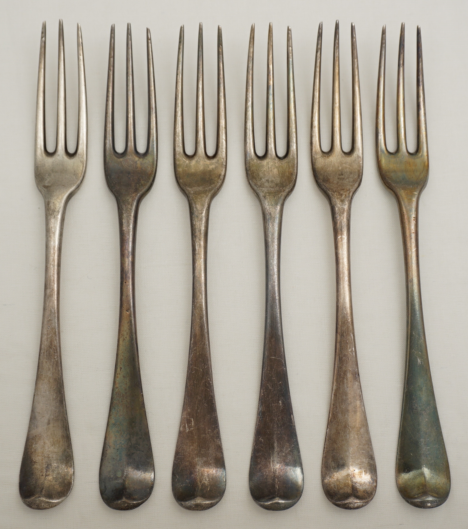(I, 1622) (archive.org) As fork tines wear it is important to level them by clipping or stretching otherwise the wear is amplified on the shortest tines. The old silversmiths made their tines extra long to accommodate the expected levelling. After successive levelling the tines look stubby, the forks have reached the end of their useful life and are usually scrapped. This is why old forks are so rare today and even the stubby are becoming acceptable as good examples are seldom available. What makes this set so extraordinary is that although a little wear can be seen on some outer tines the rest are their original full length. If you are interested in acquiring similar forks, and you probably are if you have read this far, you are welcome to supply an indication of your budget and I will add you to the wait list. These took eight years to find so I can make no promises. |