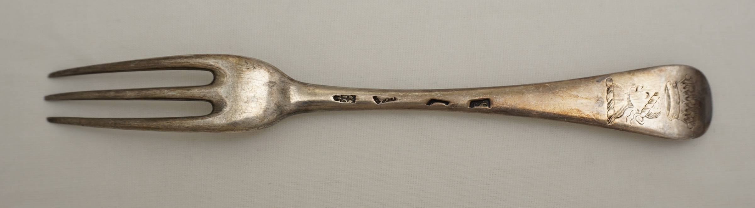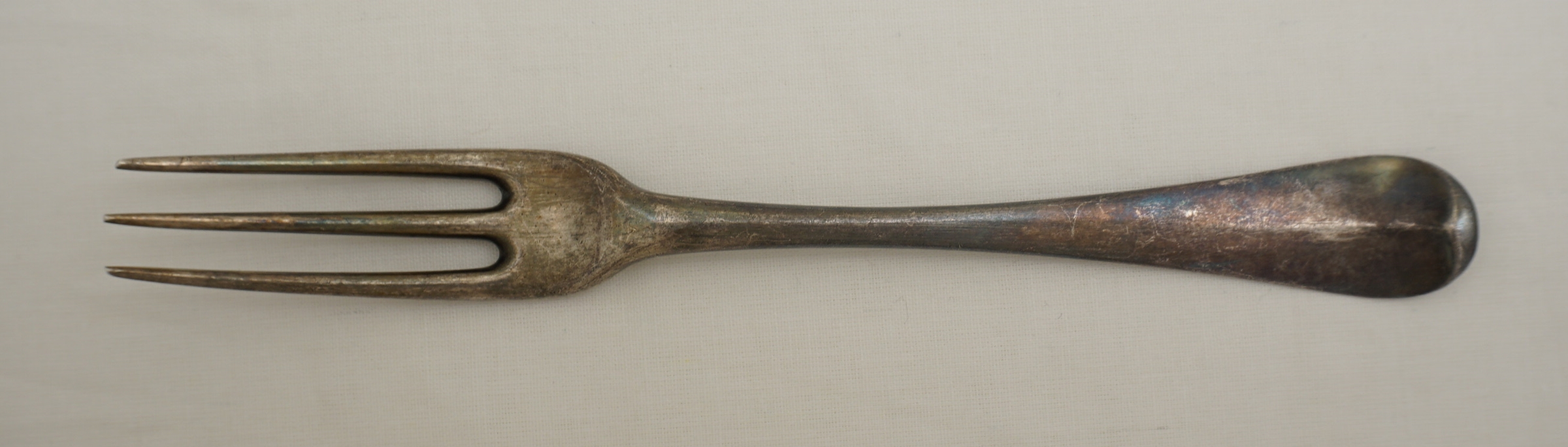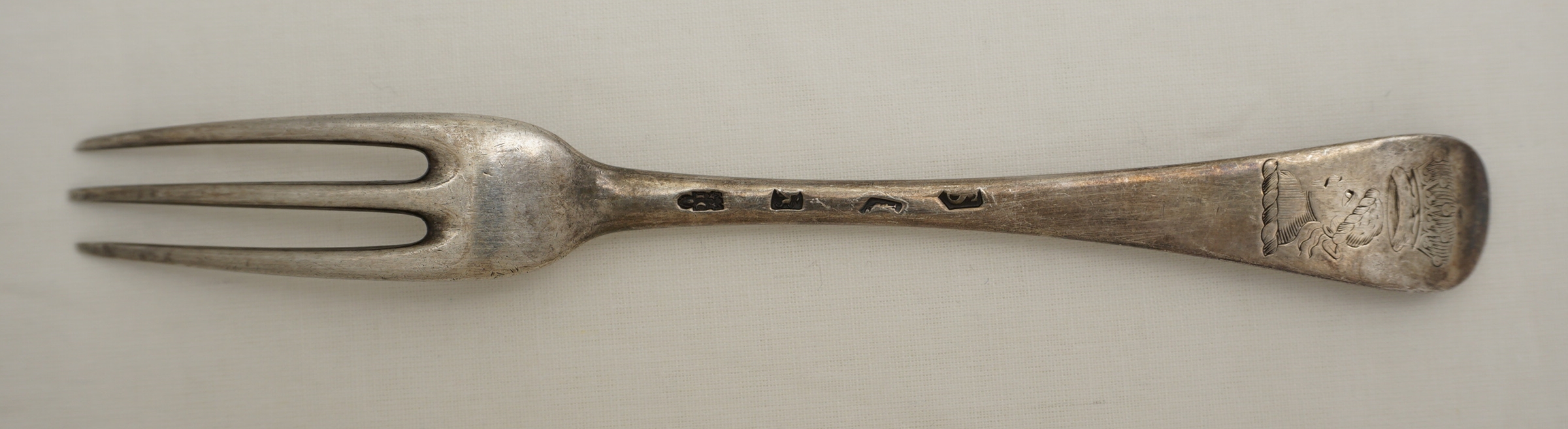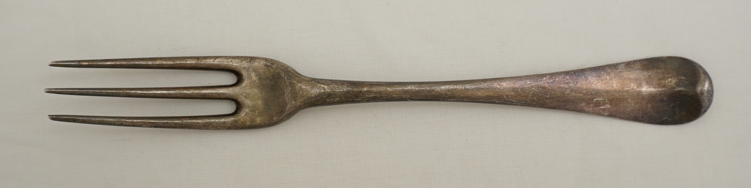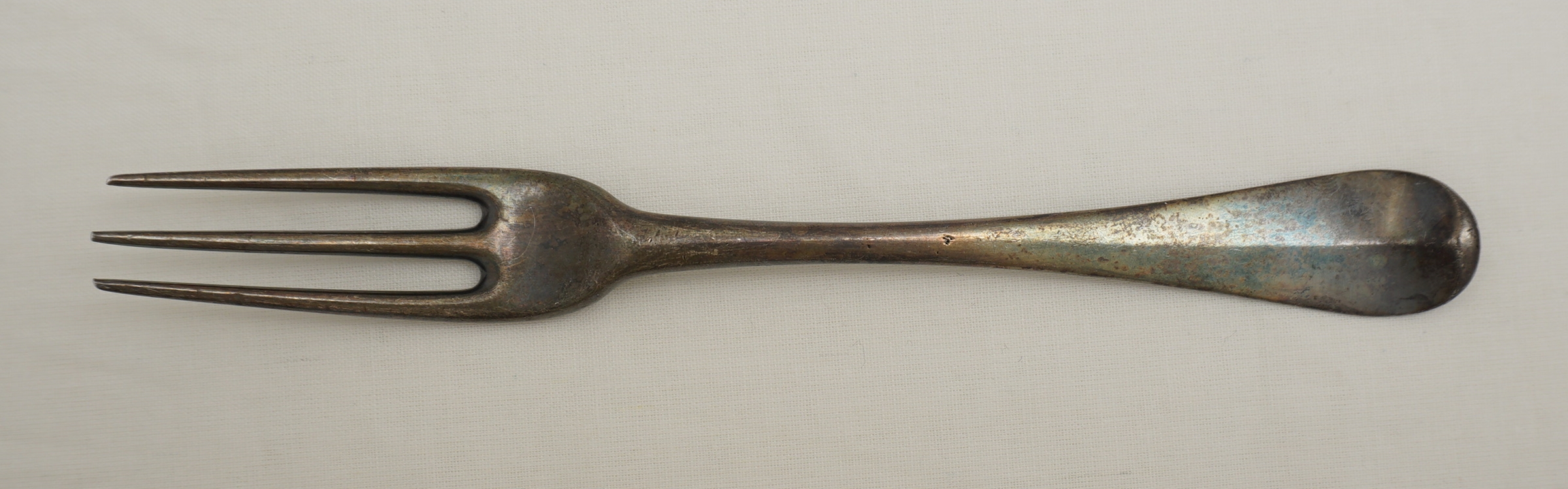 (I, 1622) (archive.org) As fork tines wear it is important to level them by clipping or stretching otherwise the wear is amplified on the shortest tines. The old silversmiths made their tines extra long to accommodate the expected levelling. After successive levelling the tines look stubby, the forks have reached the end of their useful life and are usually scrapped. This is why old forks are so rare today and even the stubby are becoming acceptable as good examples are seldom available. What makes this set so extraordinary is that although a little wear can be seen on some outer tines the rest are their original full length. If you are interested in acquiring similar forks, and you probably are if you have read this far, you are welcome to supply an indication of your budget and I will add you to the wait list. These took eight years to find so I can make no promises. |