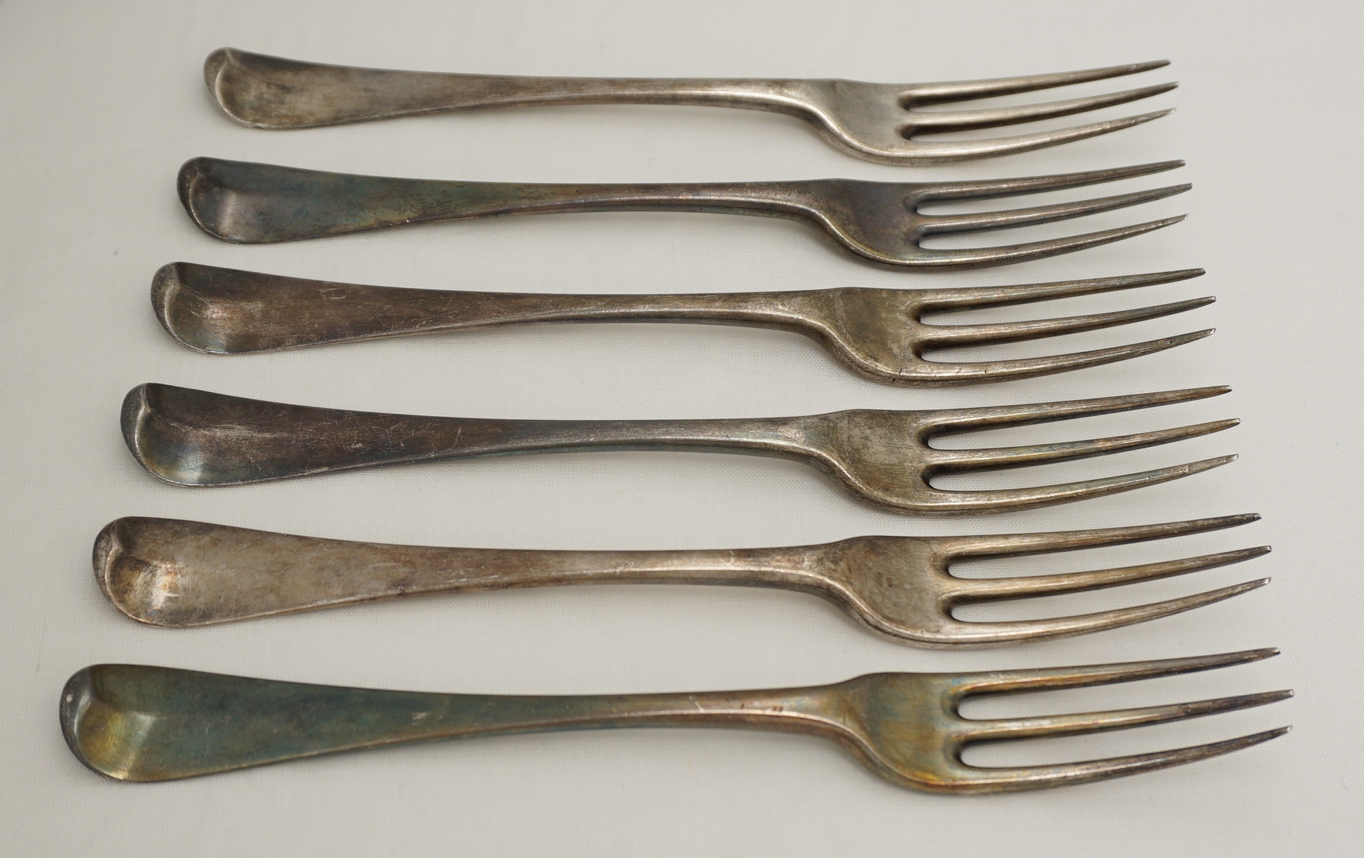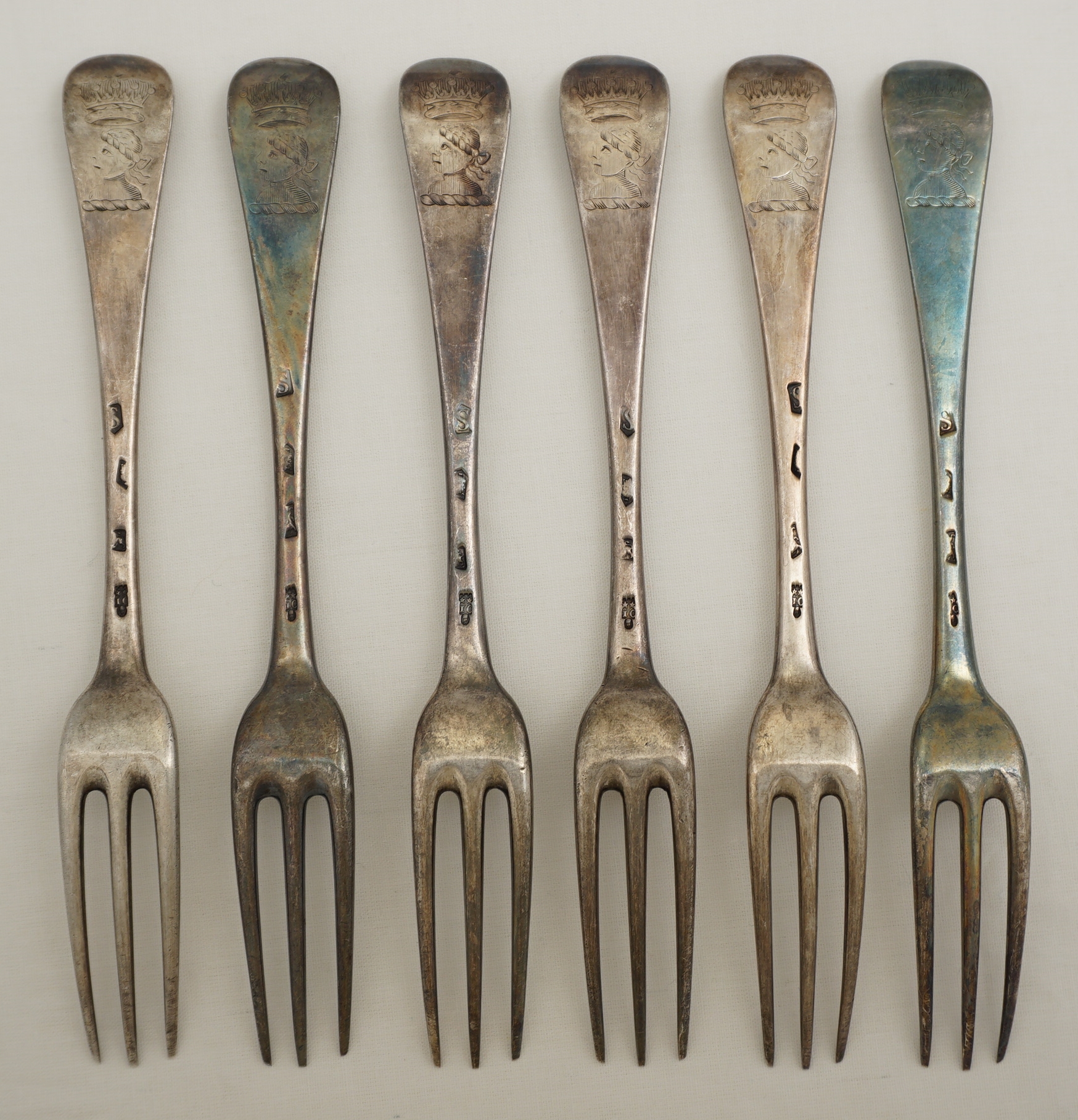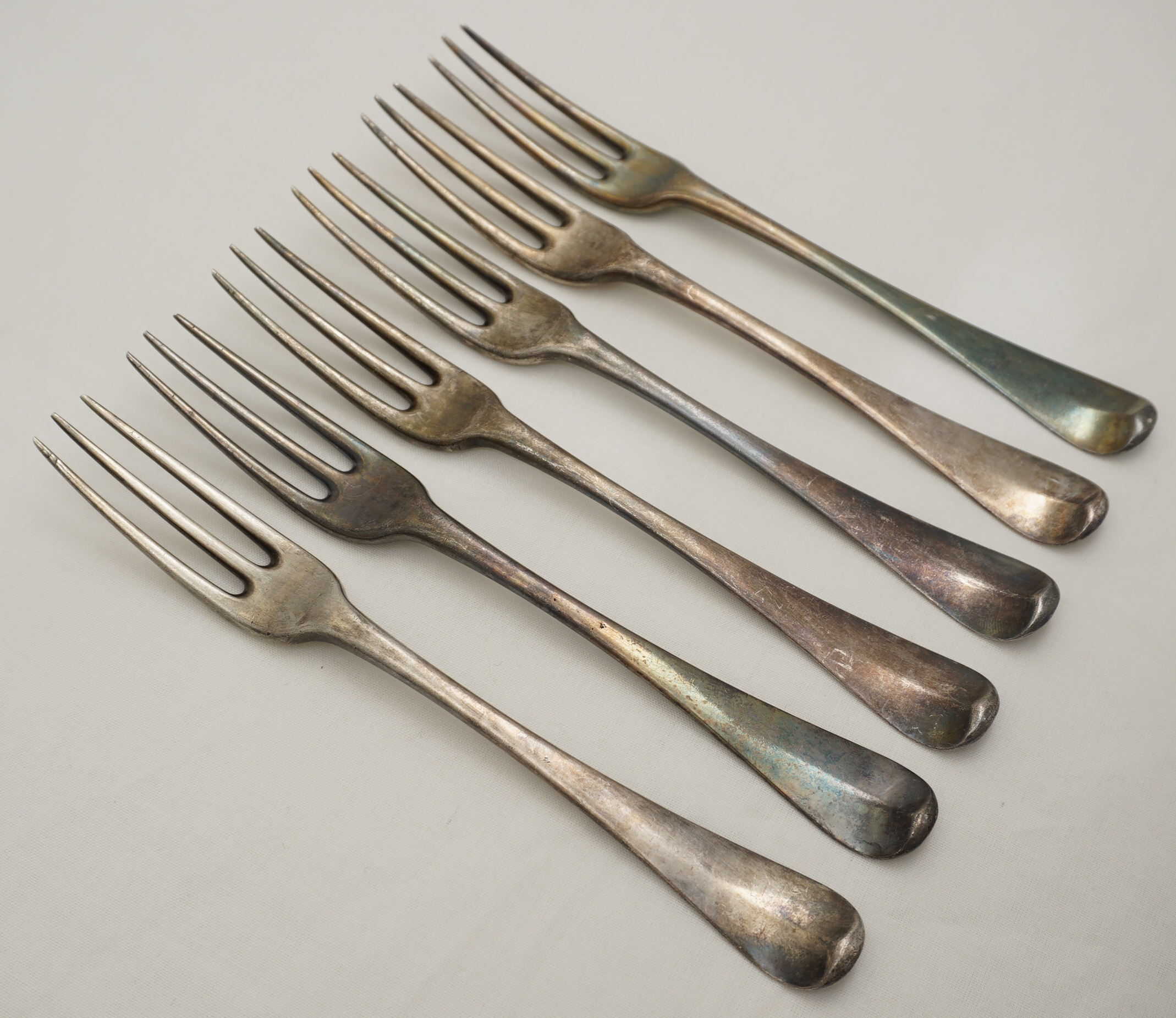 DESCRIPTION | Superb set of six antique English Georgian solid sterling silver Hanoverian pattern three tine table forks with an earl's coronet above a crest engraving and wonderful