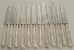 SILVER PLATED. Useful set of twelve table knives and twelve dessert knives with loaded silver plated King's pattern handles and