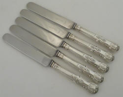 Five 9 ¾" silver handled Queen's table knives, John Biggin, Sheffield 1995, 246mm, total 358g. |