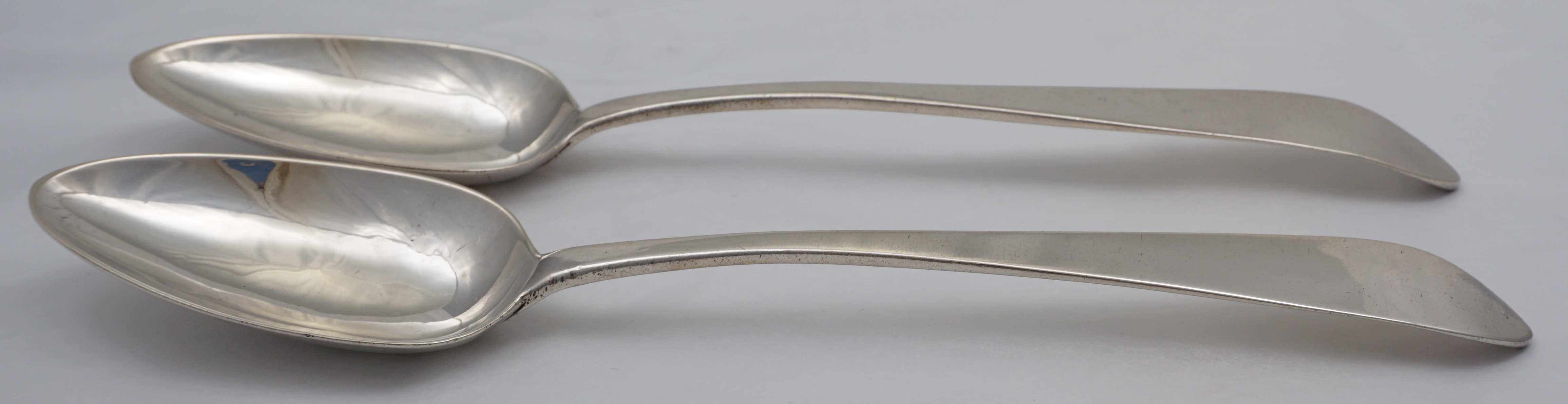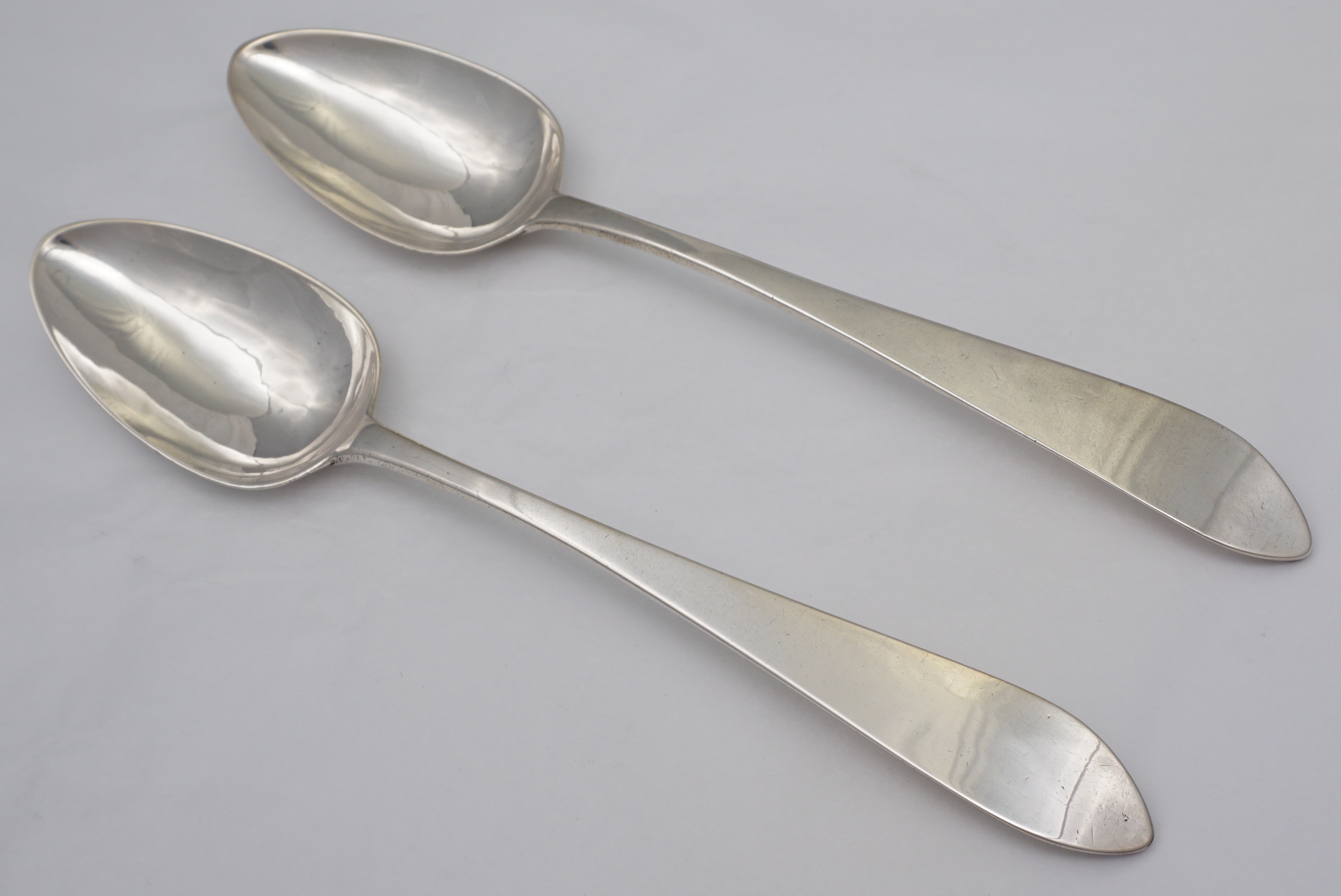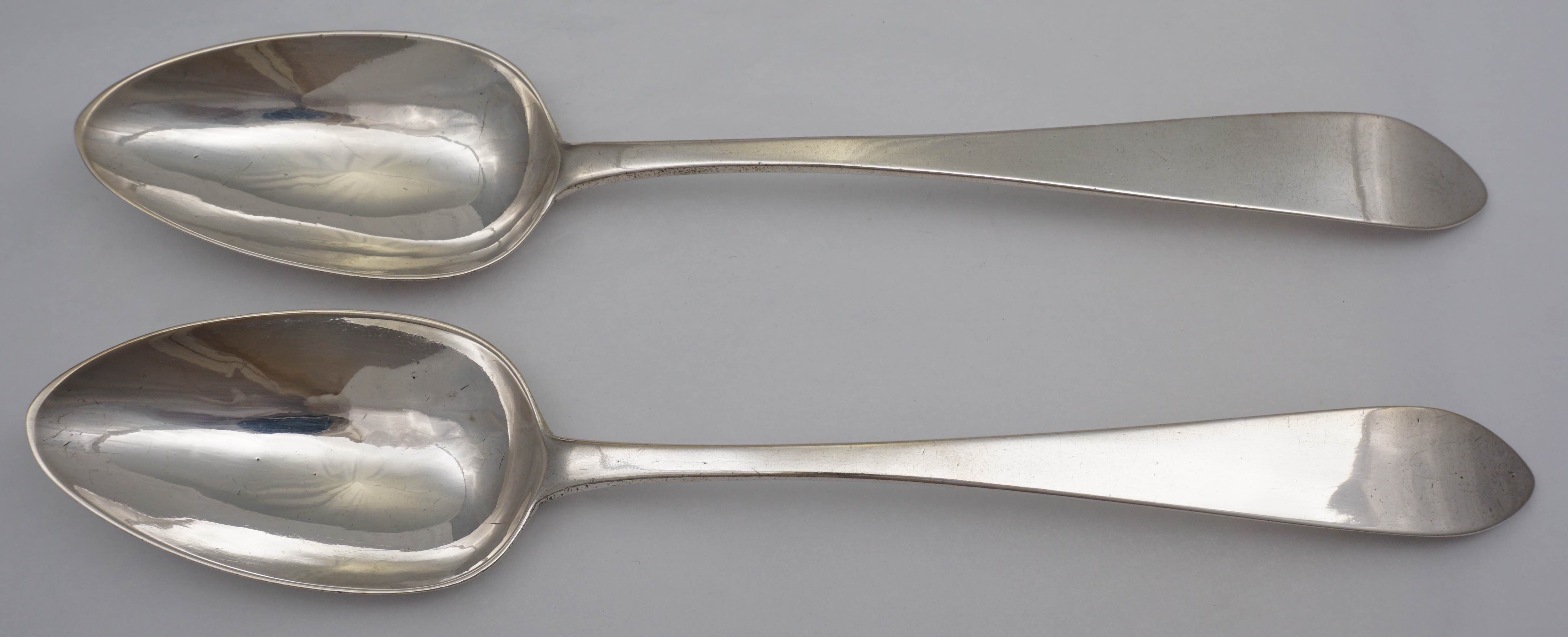 | DESCRIPTION | Unusually plain pair of antique Irish Georgian solid sterling silver Pointed Old English pattern table spoons with beautiful 18th century hallmarks. |