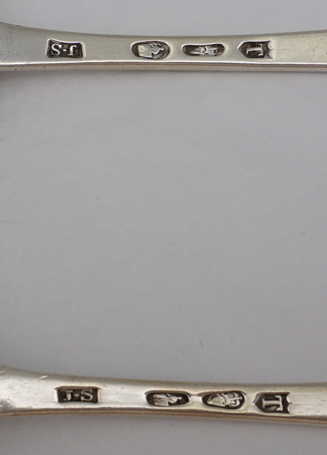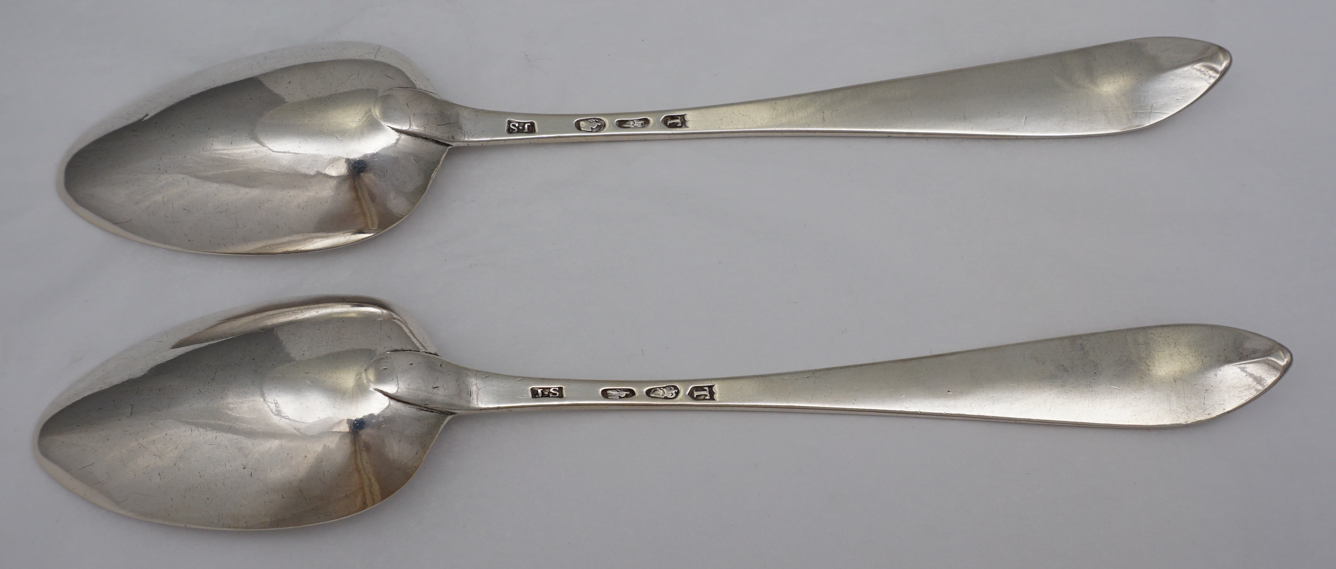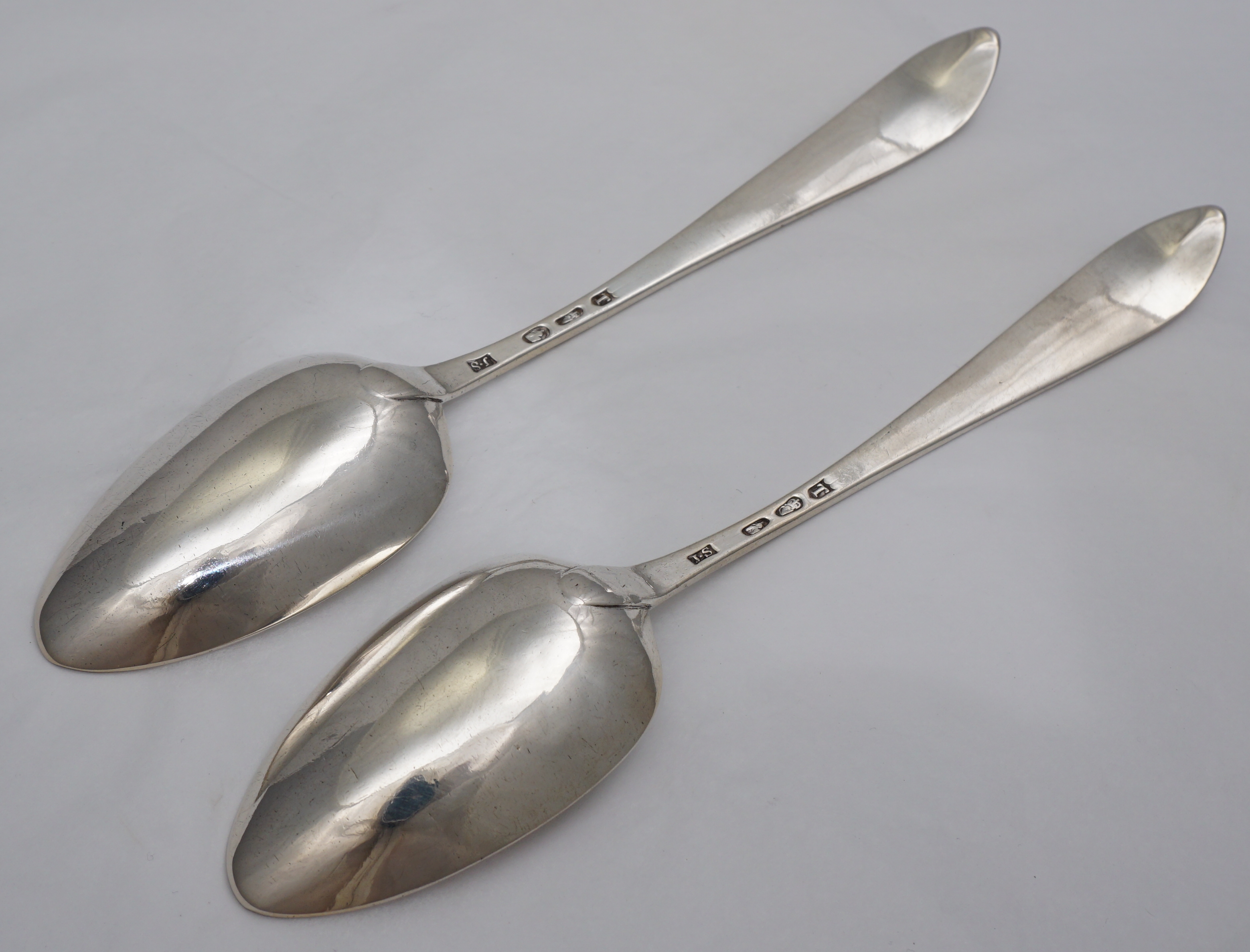| DESCRIPTION | Unusually plain pair of antique Irish Georgian solid sterling silver Pointed Old English pattern table spoons with beautiful 18th century hallmarks. |