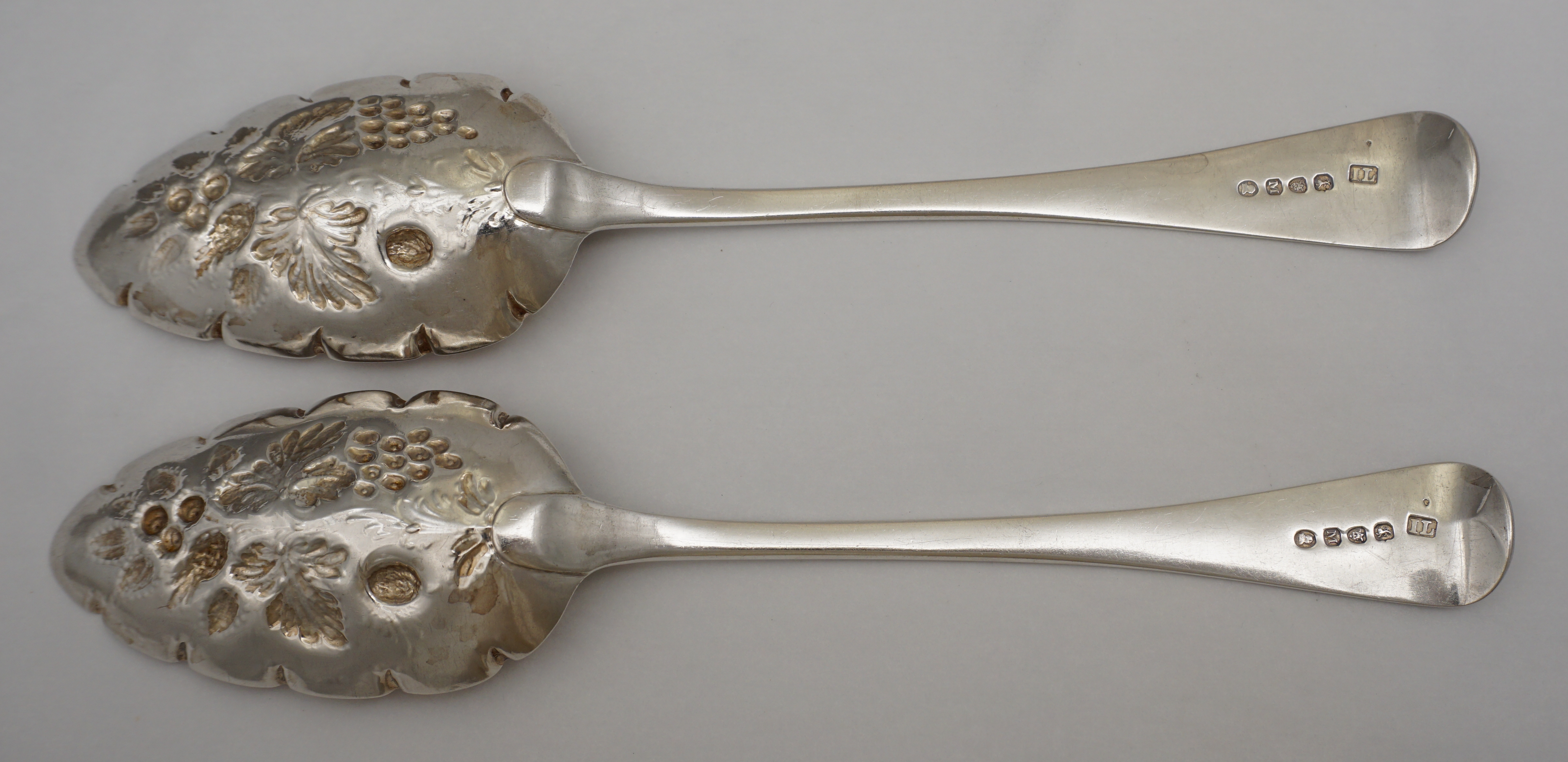 DESCRIPTION | Pair of antique English Georgian solid sterling silver Old English pattern 'Berry' table spoons with later embossed and engraved decoration and gilded bowls. |
