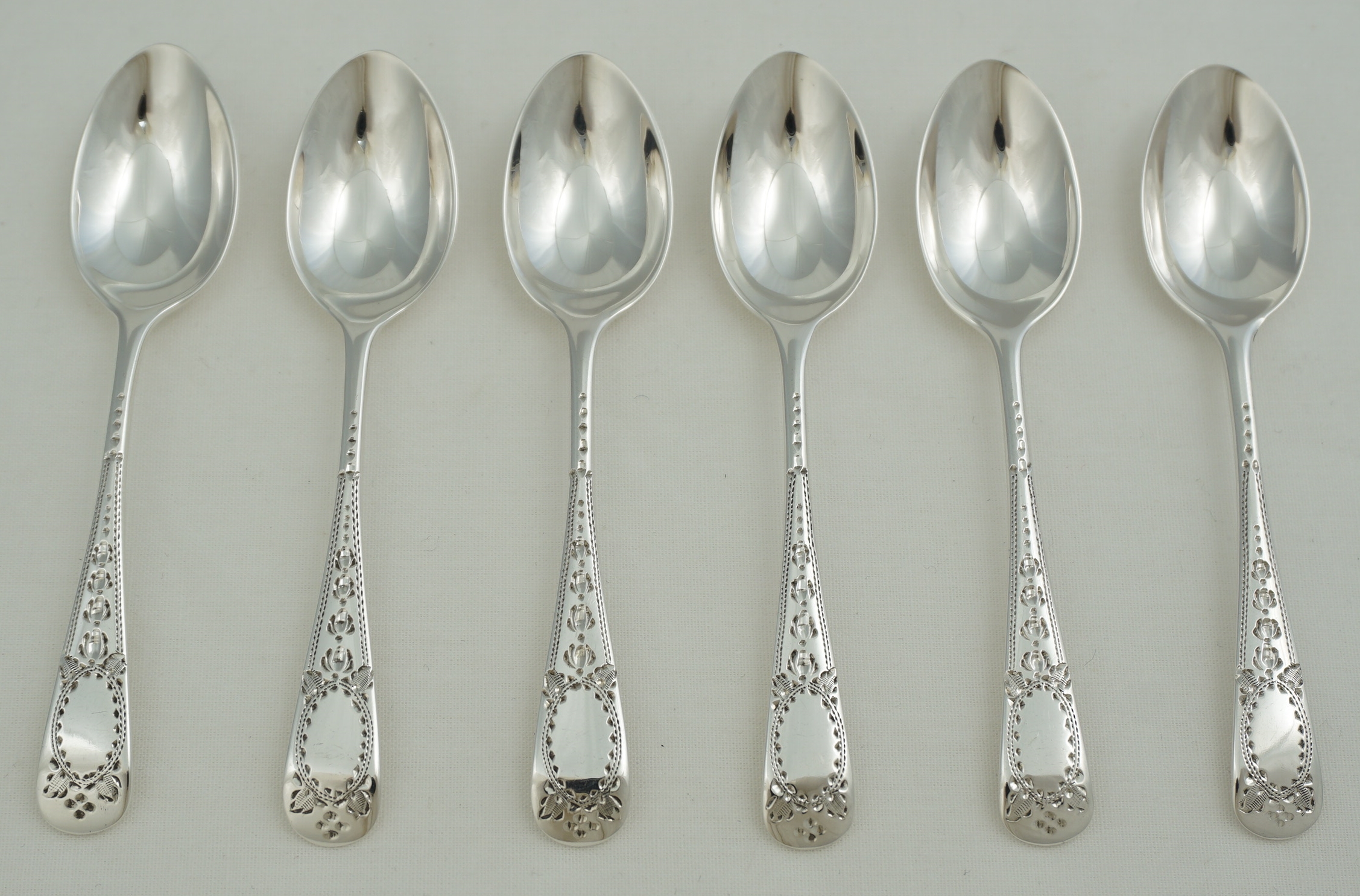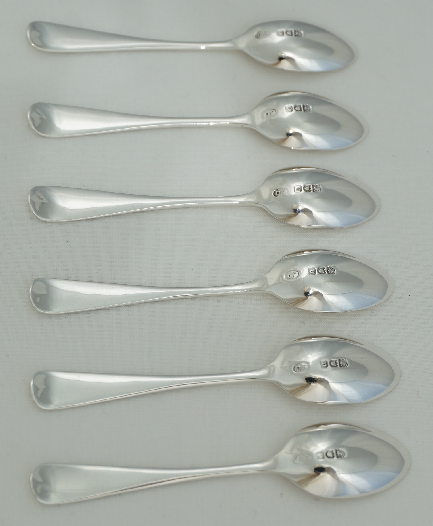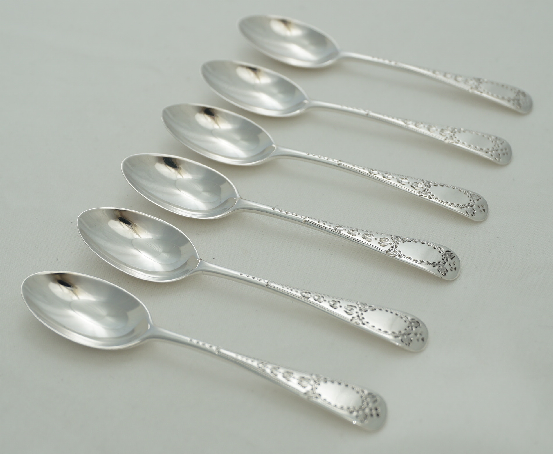 DESCRIPTION | Pretty and cased set of six antique English solid sterling silver bright-cut Old English pattern coffee spoons. |