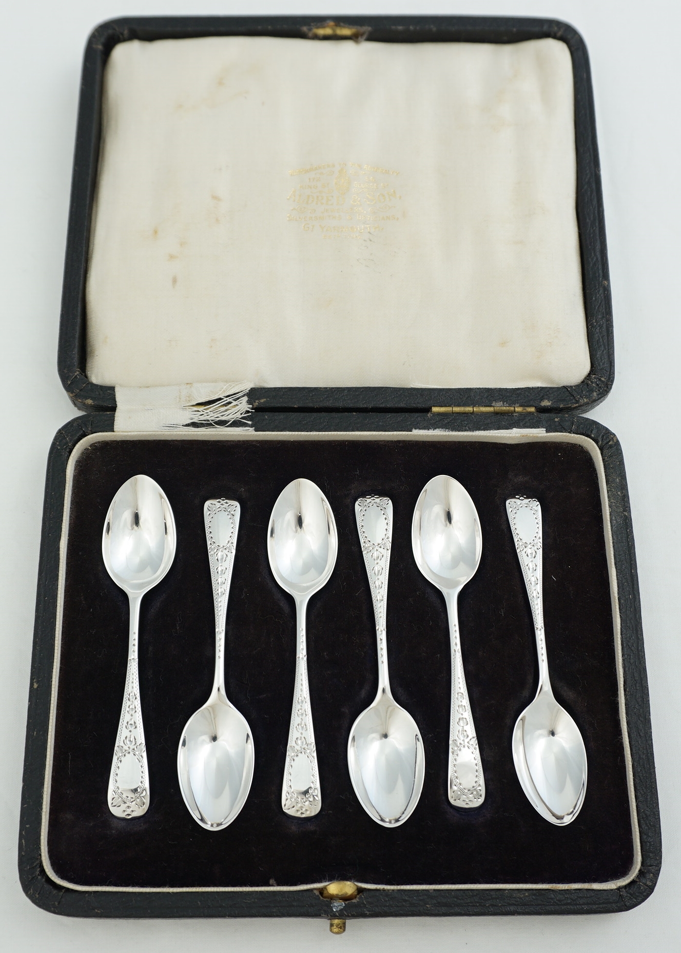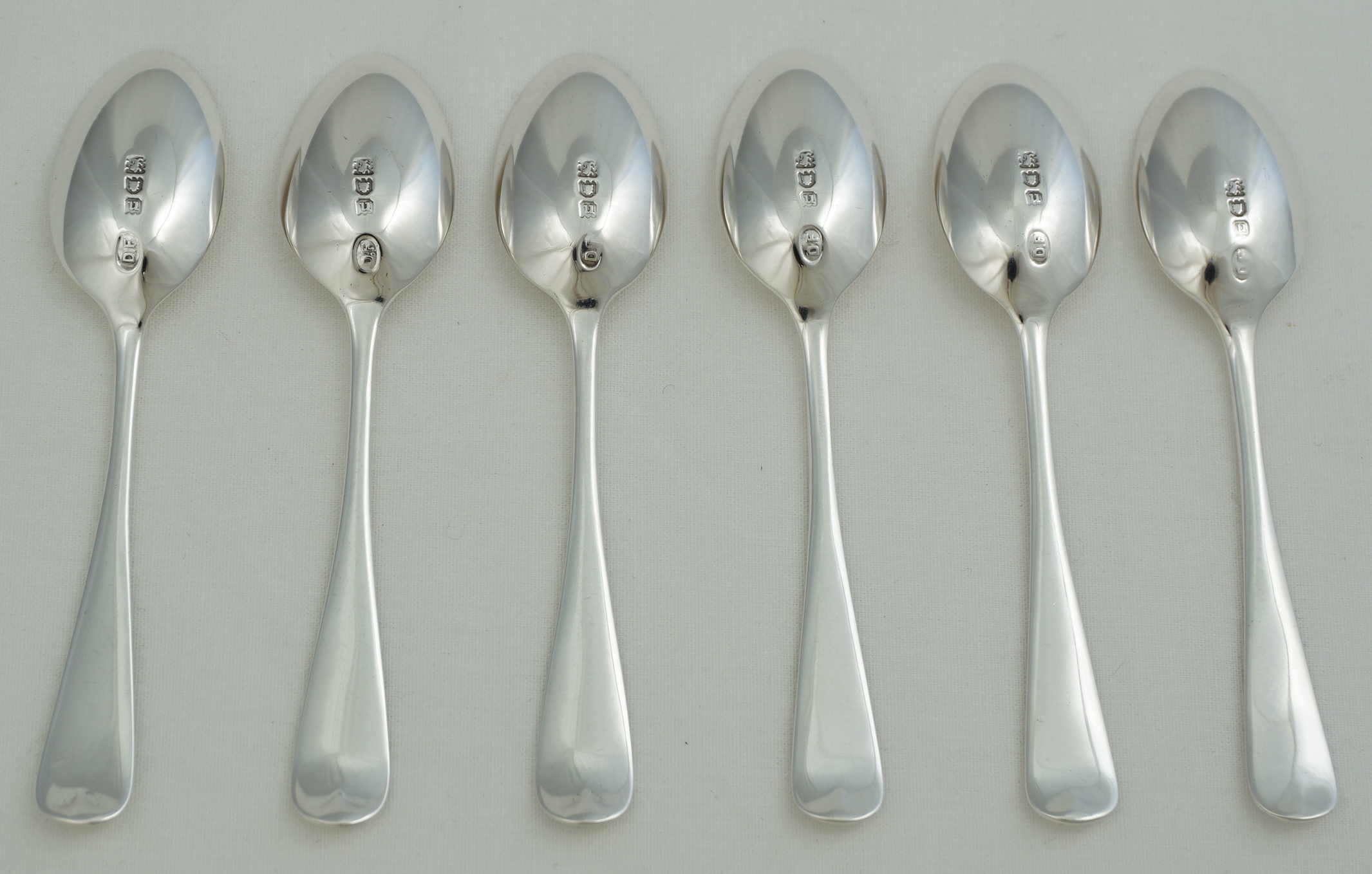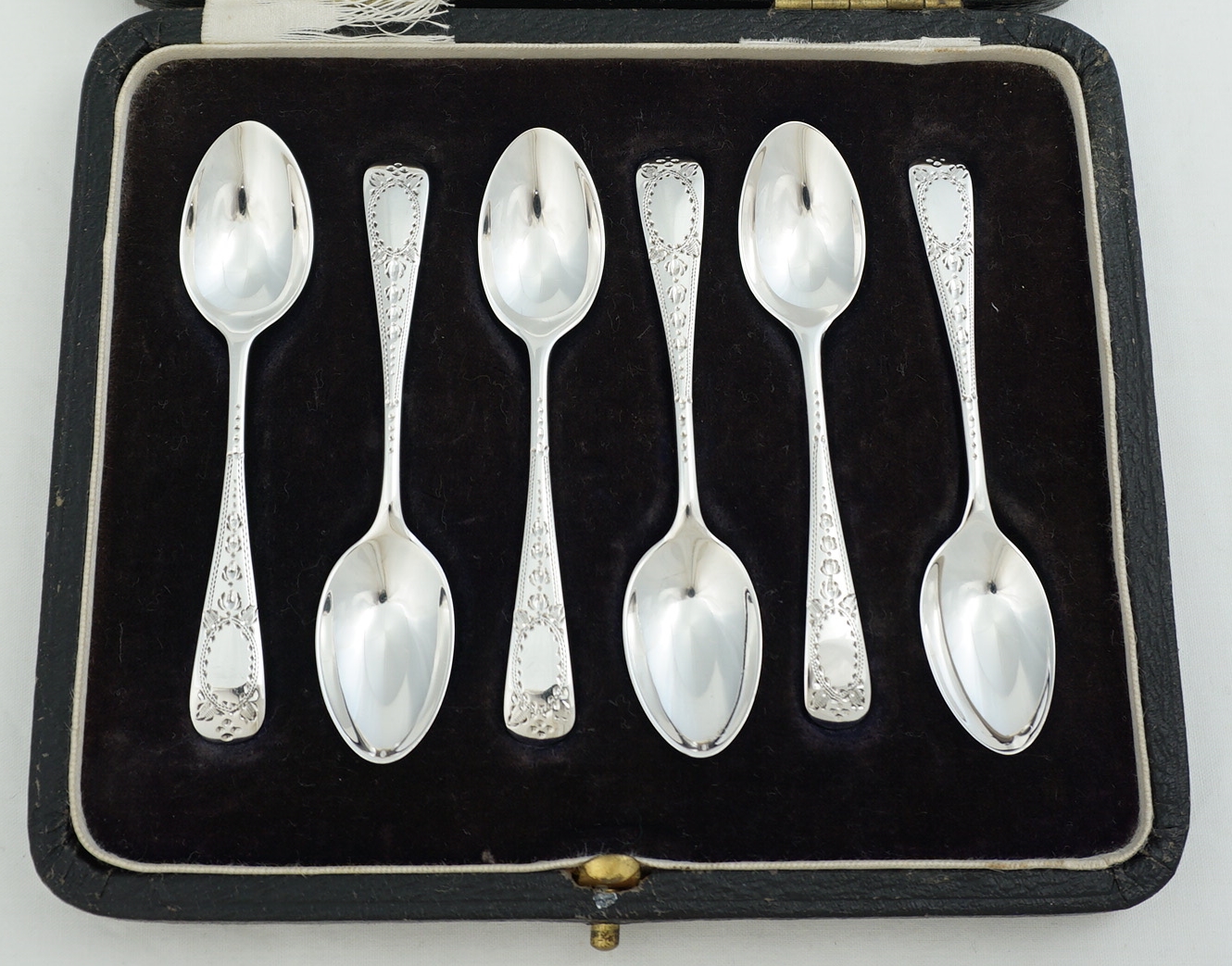 DESCRIPTION | Pretty and cased set of six antique English solid sterling silver bright-cut Old English pattern coffee spoons. |