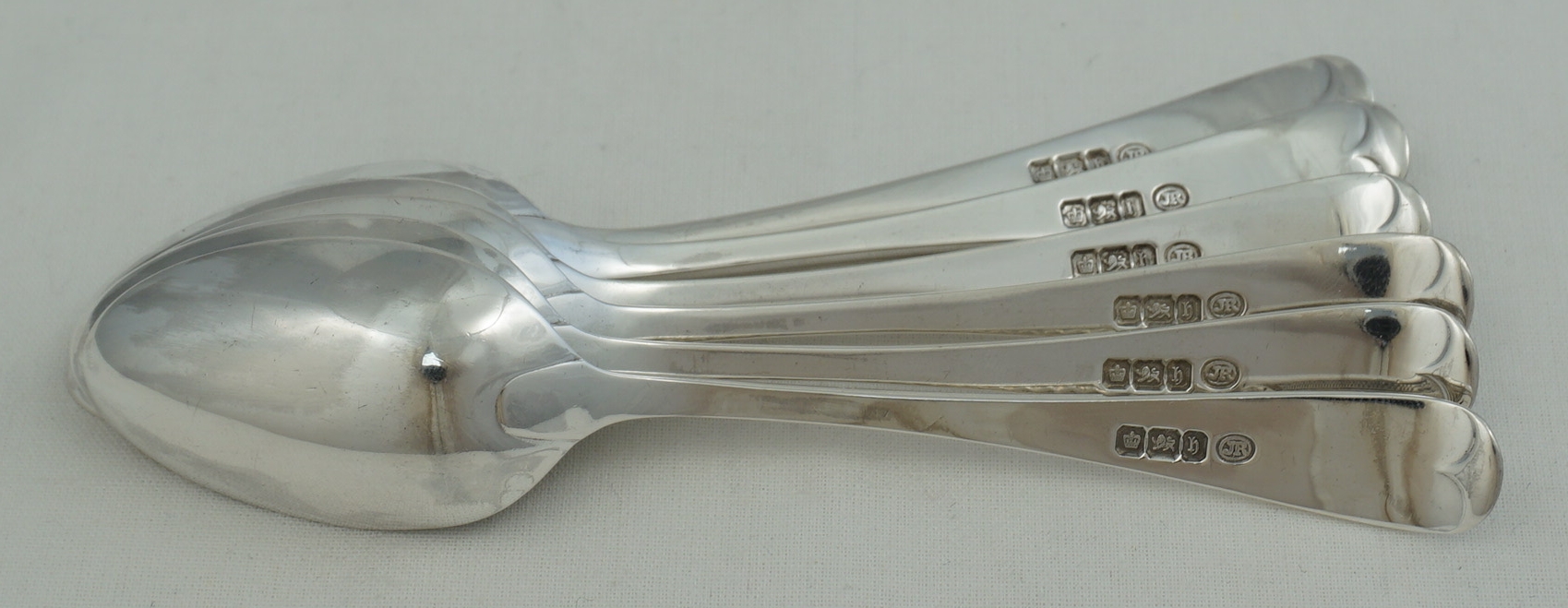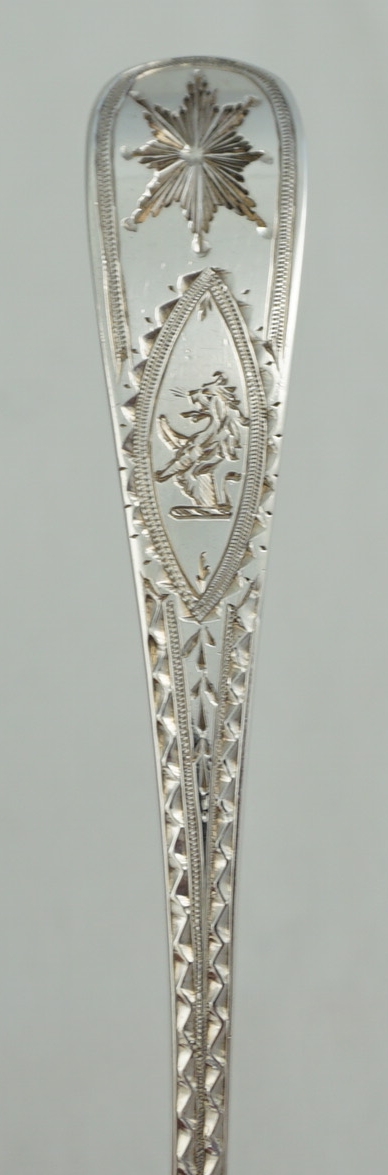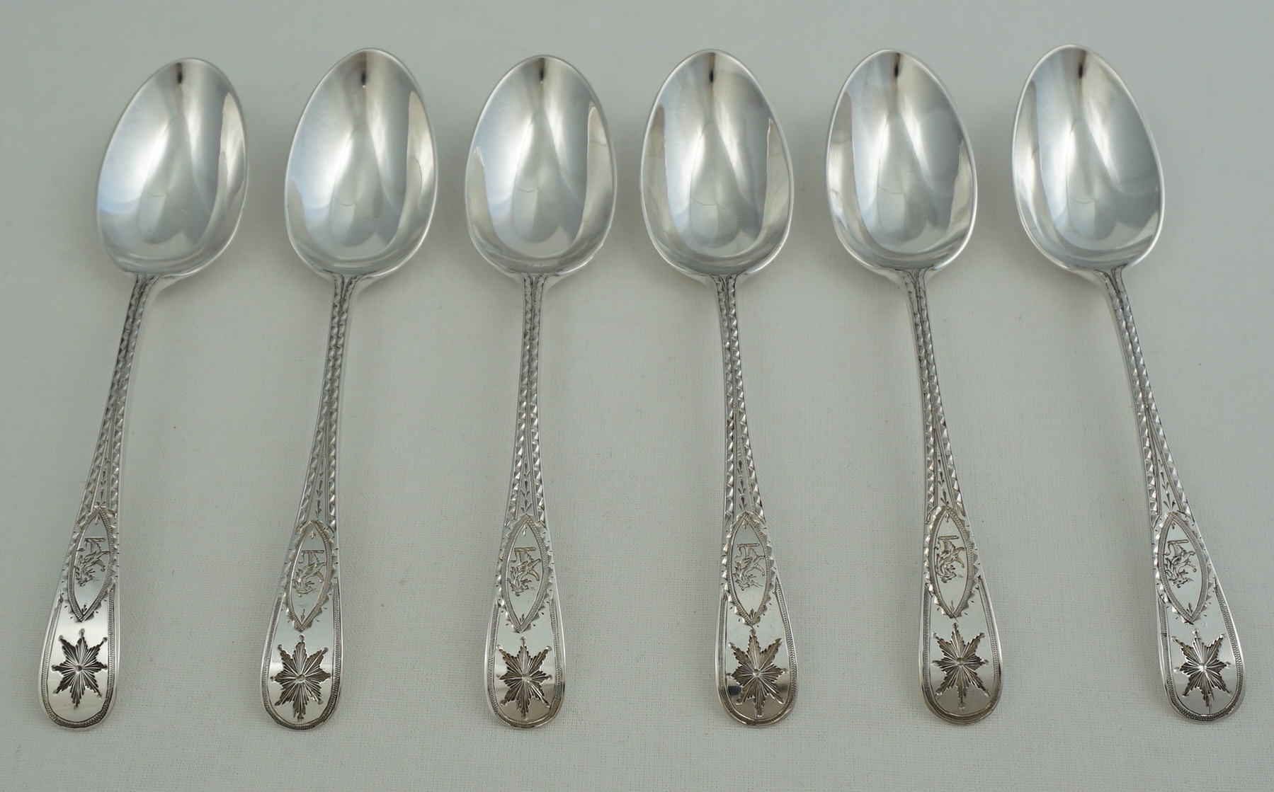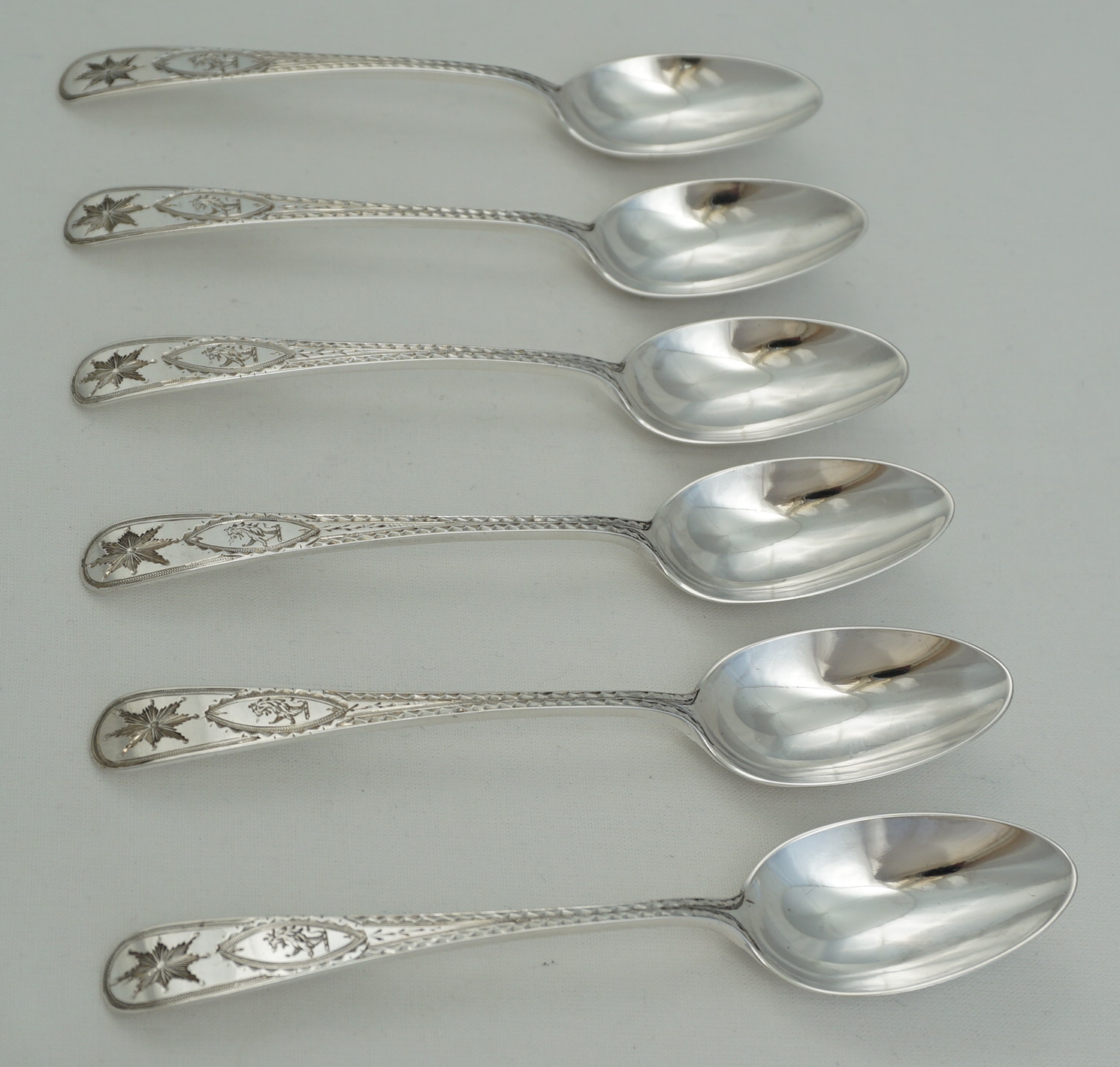DESCRIPTION | Good set of six antique English late Victorian solid sterling silver Bright-cut Old English Star pattern teaspoons with a good frontal crest engraving. |