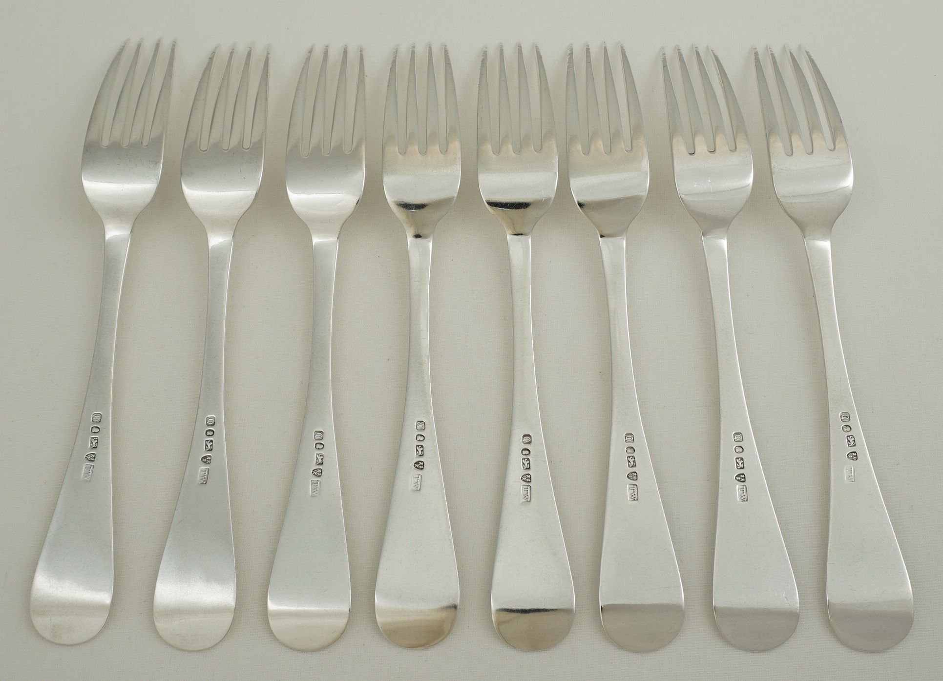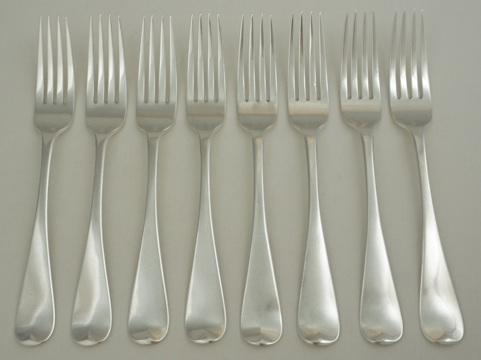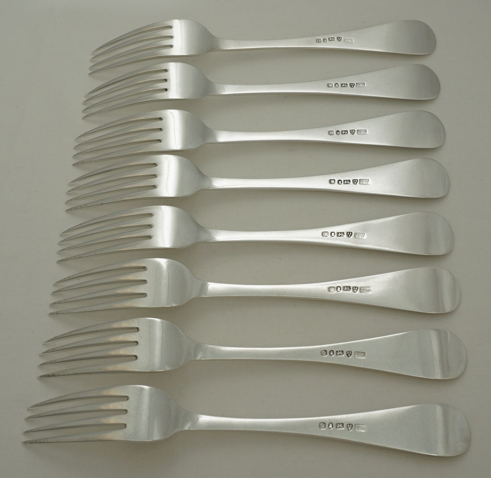 | DESCRIPTION | Superb set of eight antique English William IV solid sterling silver Old English pattern table forks with no engraving or erasure. |