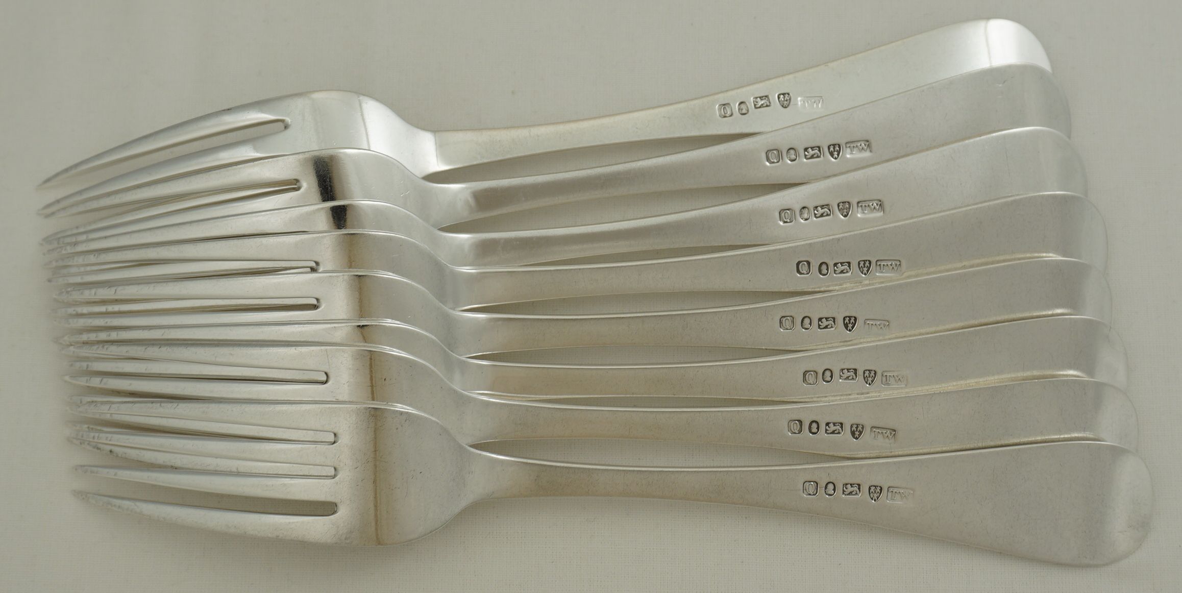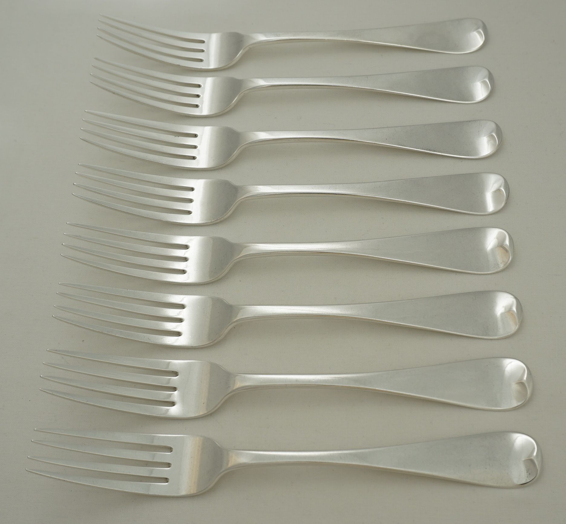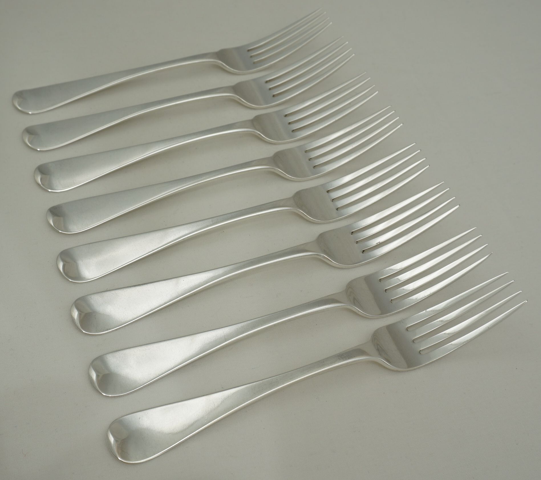 | DESCRIPTION | Superb set of eight antique English William IV solid sterling silver Old English pattern table forks with no engraving or erasure. |