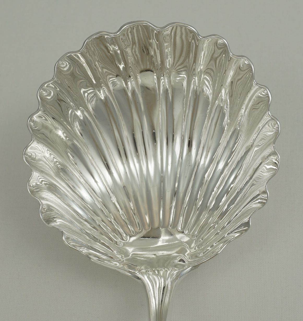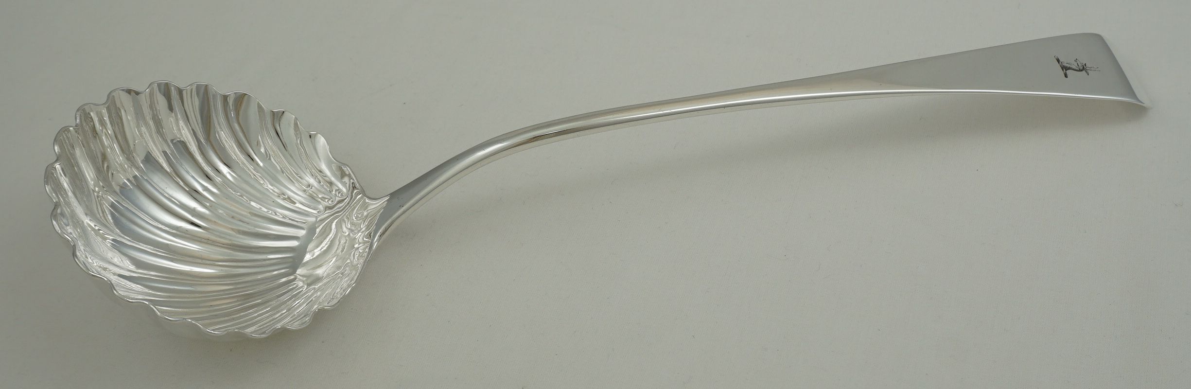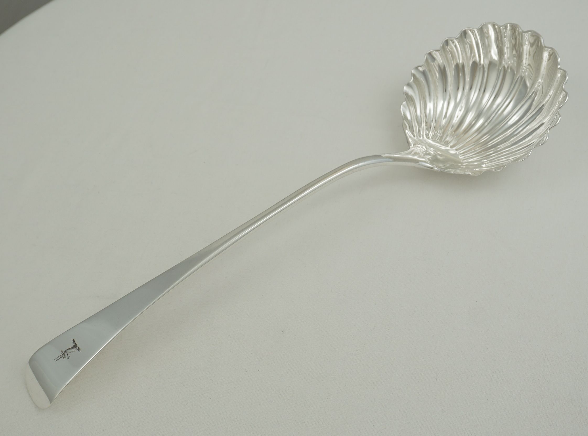 | DESCRIPTION | Heavy antique English Georgian solid sterling silver Old English pattern Shell Bowl soup ladle with a probably later and still crisp frontal crest engraving. |
