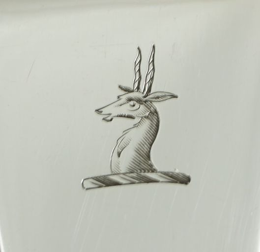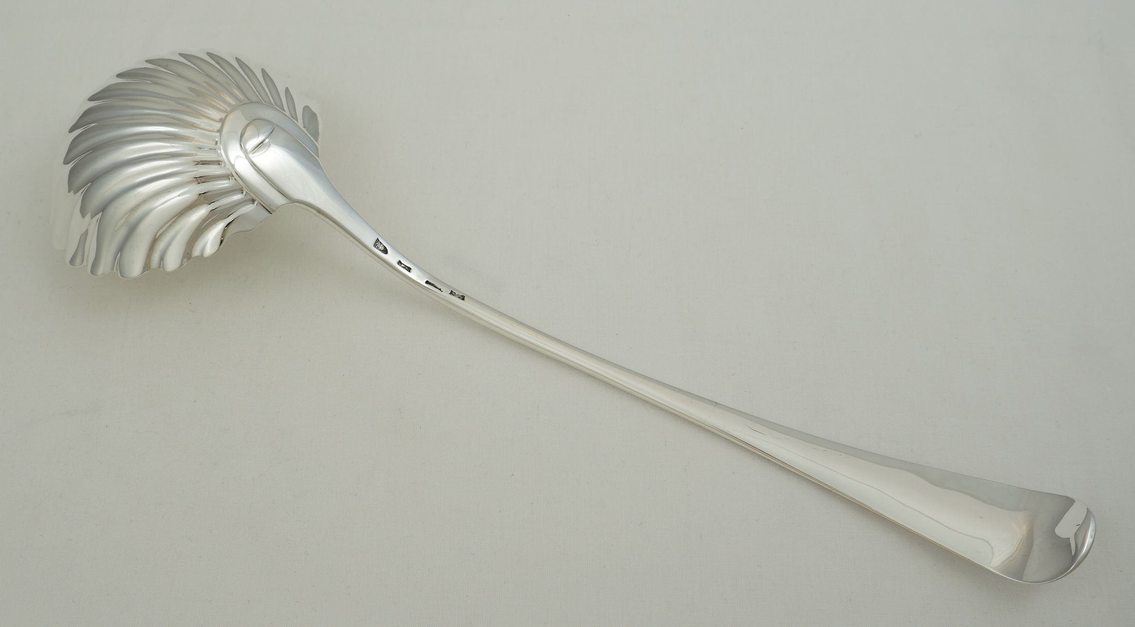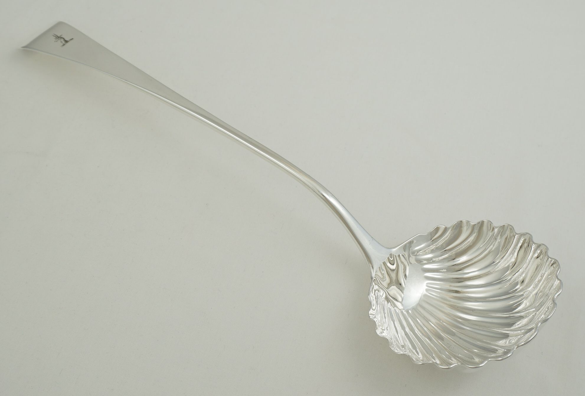 | DESCRIPTION | Heavy antique English Georgian solid sterling silver Old English pattern Shell Bowl soup ladle with a probably later and still crisp frontal crest engraving. |