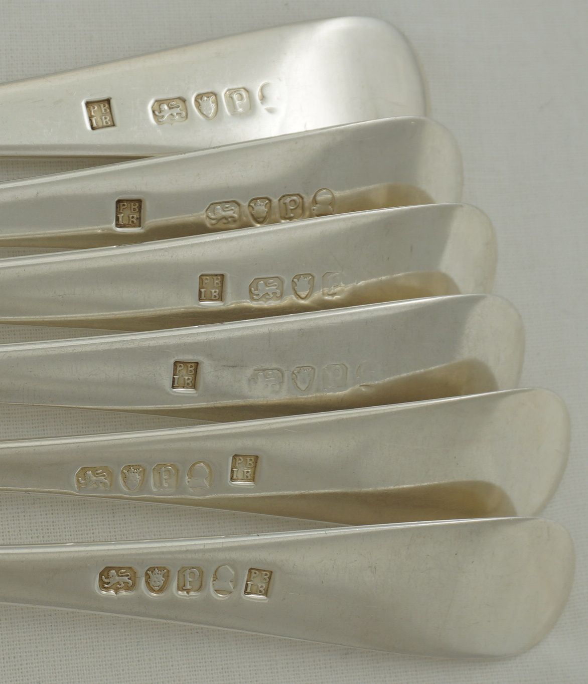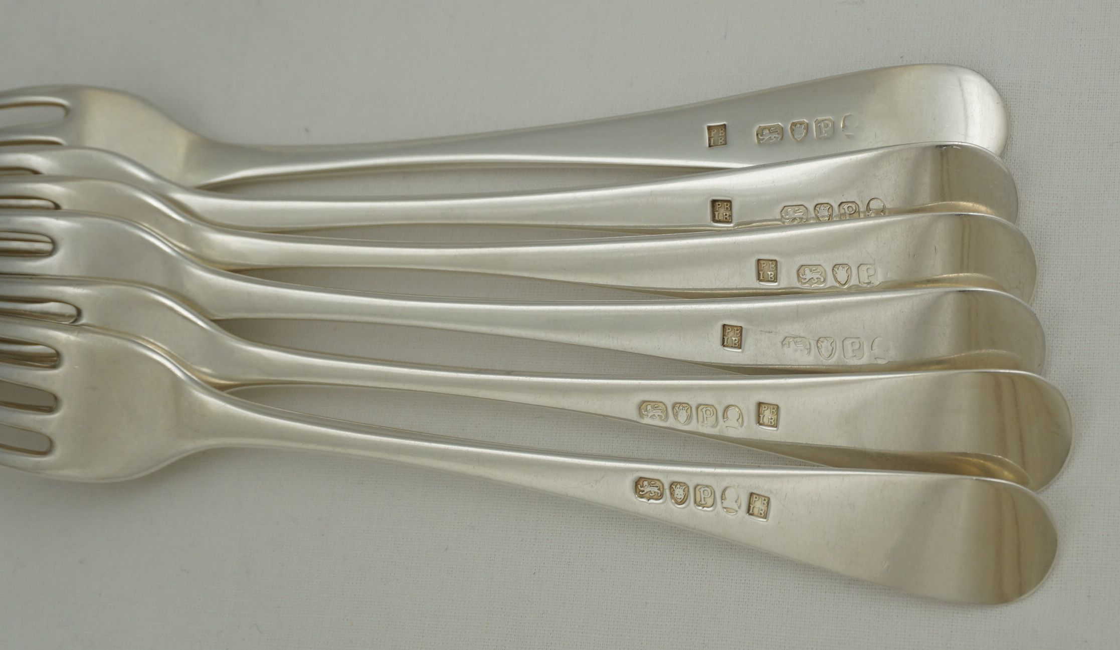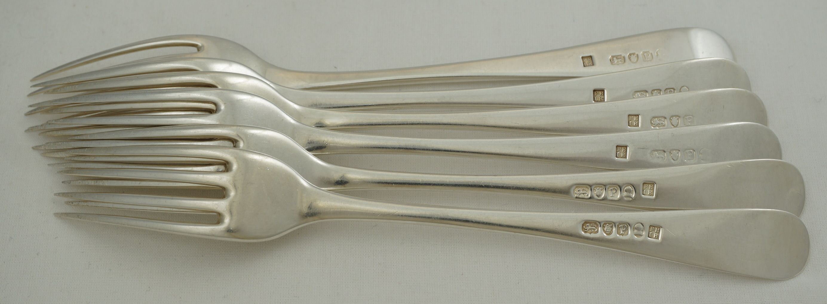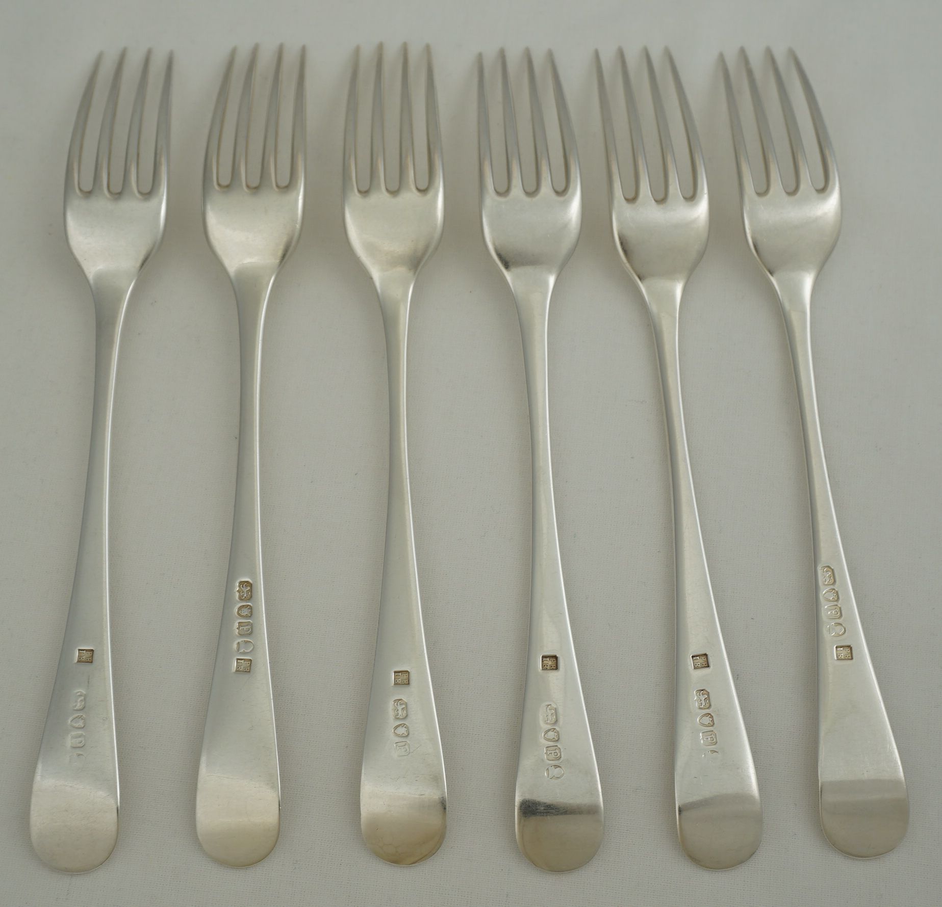 | DESCRIPTION | Scarce set of six antique English Georgian solid sterling silver Old English pattern table forks with no engraving but a probable erasure verso. All the maker's mark are superb but some of the duty marks are part rubbed and one completely erased by the erasure of the engraving. The tines are nice and level and I suspect that they have been levelled only once. I have never seen PB.IB forks before so looked online for some guidance on the price. So far I have found nothing. None for sale and none ever sold. I know that they are rare but this situation is unique. If you can find some links to other PB.IB forks especially those with some price history please share. As this mark has passed unrecognised for most of its history I am fearful that much of the brothers' fork production has already succumbed to the melt. |