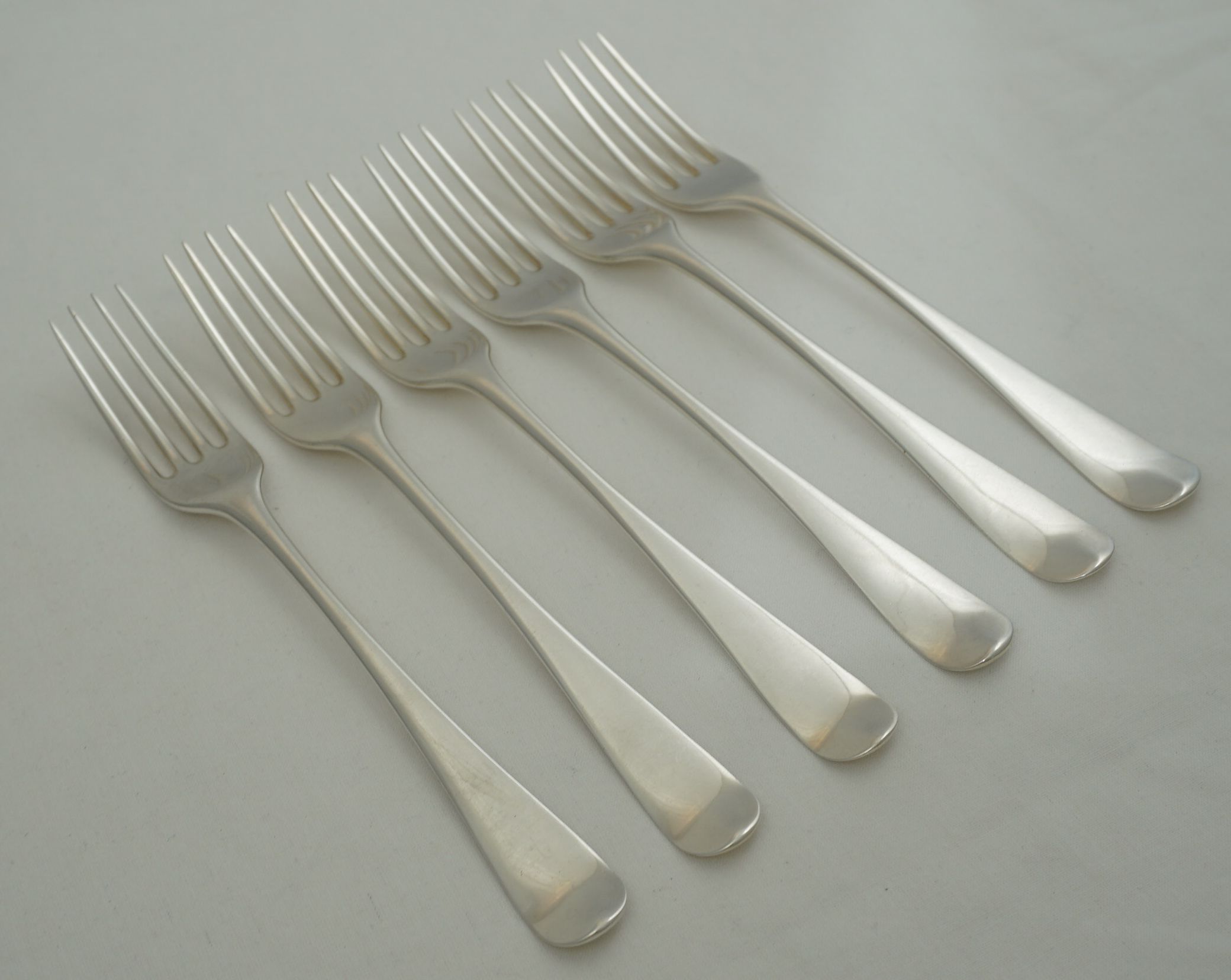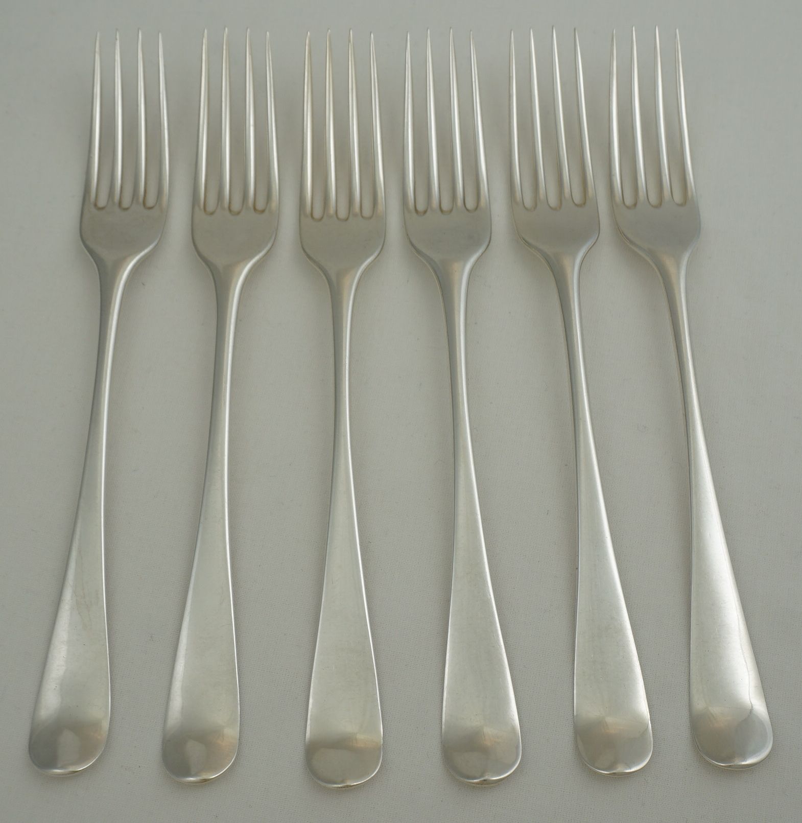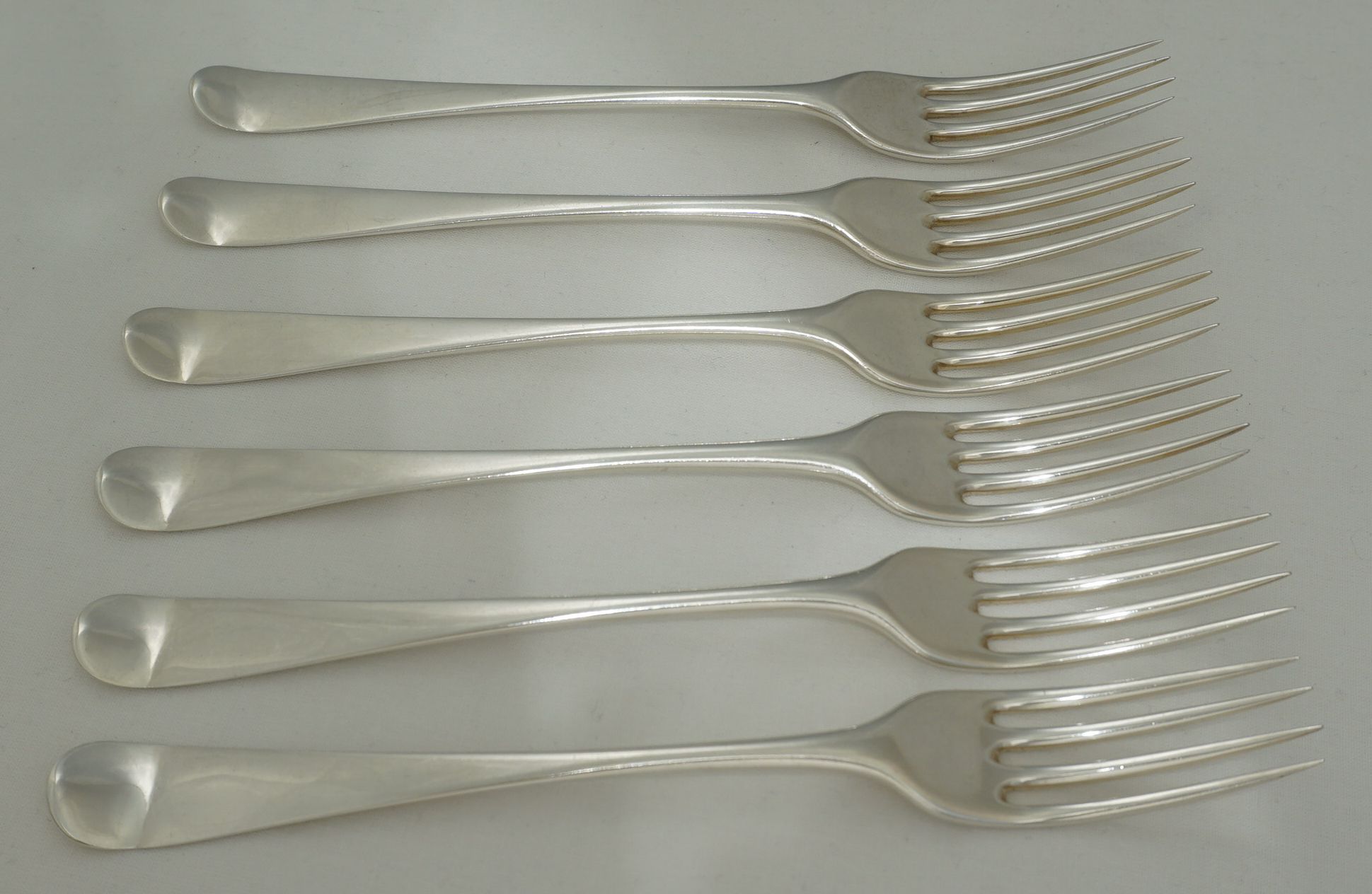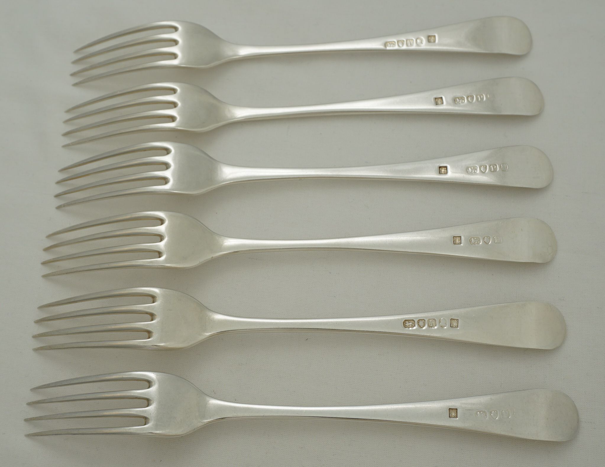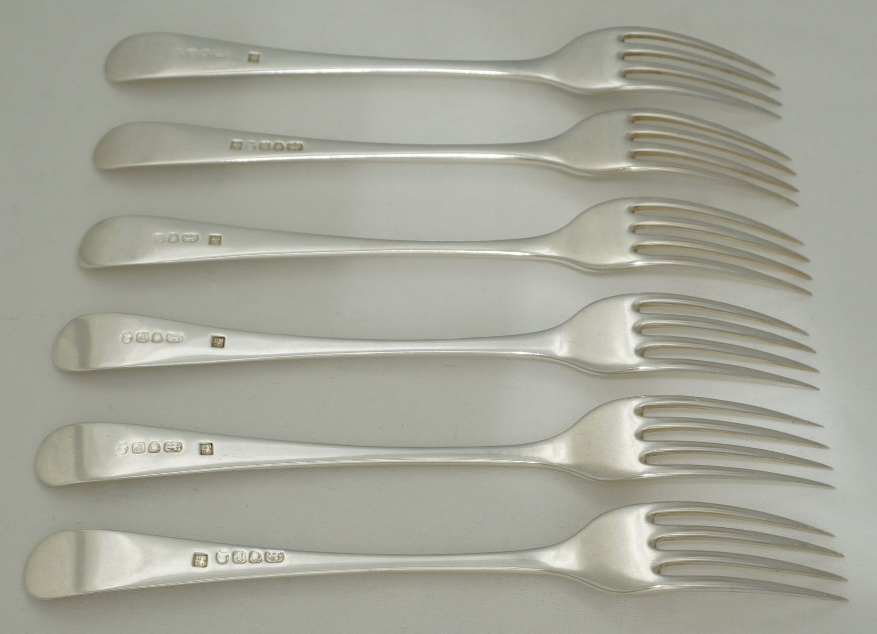 | DESCRIPTION | Scarce set of six antique English Georgian solid sterling silver Old English pattern table forks with no engraving but a probable erasure verso. All the maker's mark are superb but some of the duty marks are part rubbed and one completely erased by the erasure of the engraving. The tines are nice and level and I suspect that they have been levelled only once. I have never seen PB.IB forks before so looked online for some guidance on the price. So far I have found nothing. None for sale and none ever sold. I know that they are rare but this situation is unique. If you can find some links to other PB.IB forks especially those with some price history please share. As this mark has passed unrecognised for most of its history I am fearful that much of the brothers' fork production has already succumbed to the melt. |