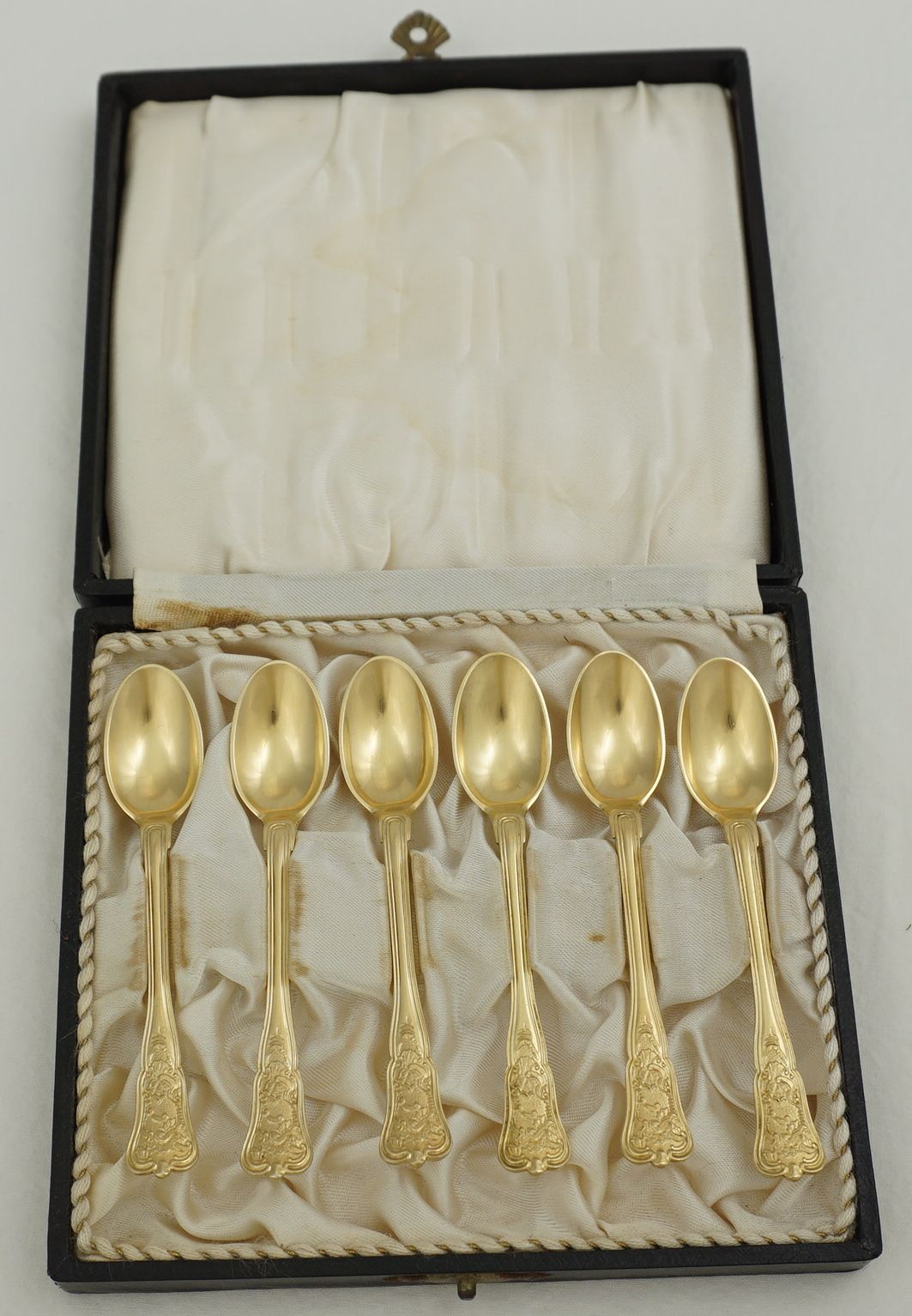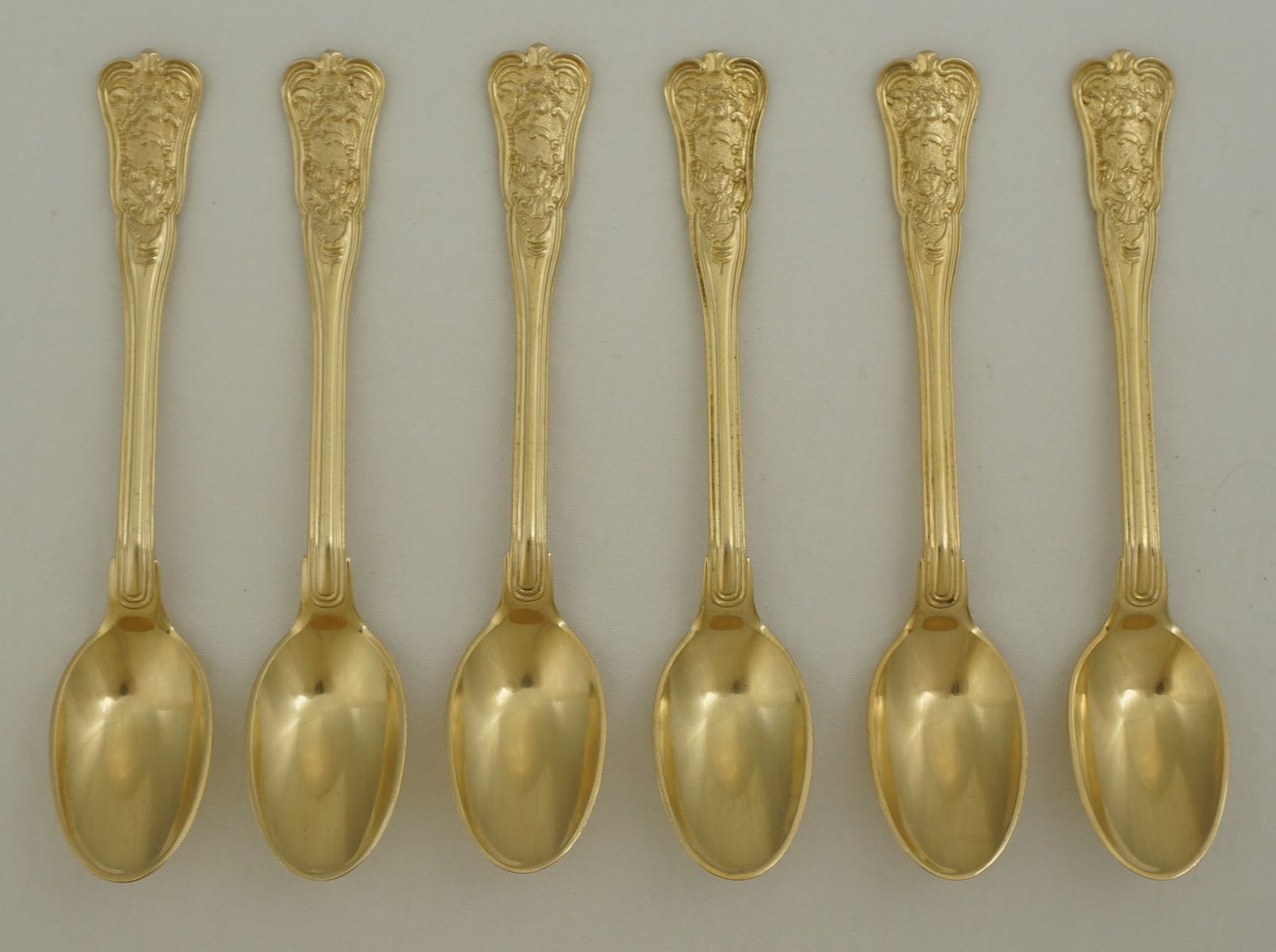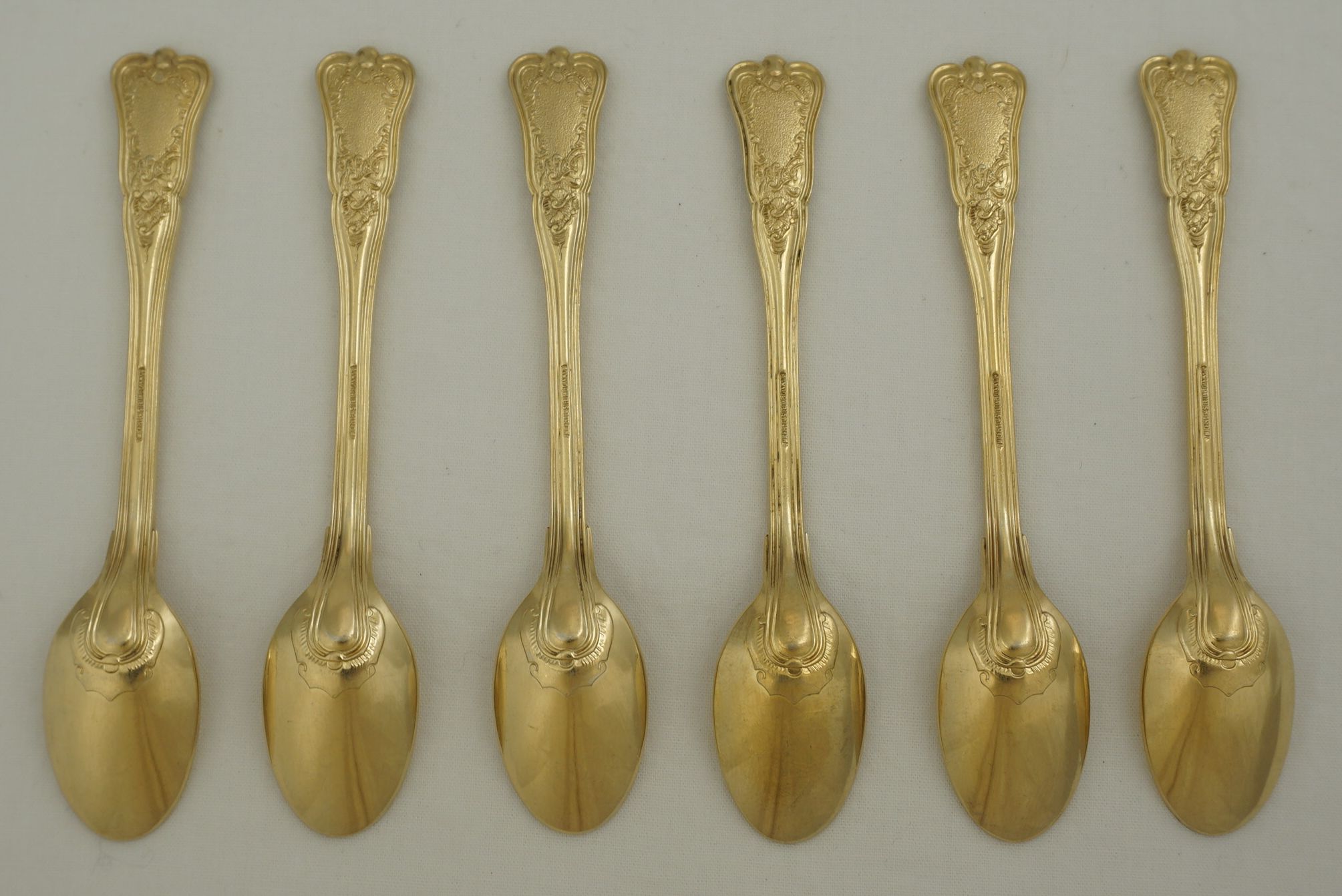 | DESCRIPTION | Cased set of six antique Danish vermeil rococo coffee spoons. Vermeil is pure gold plated sterling silver where the gold is significantly thicker than normal gold plating. |