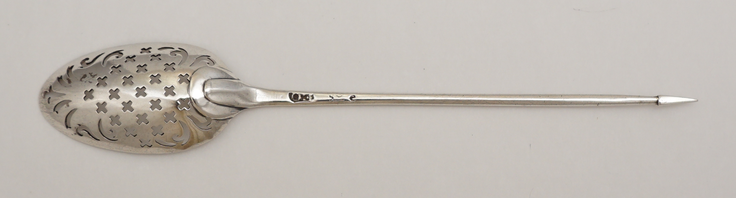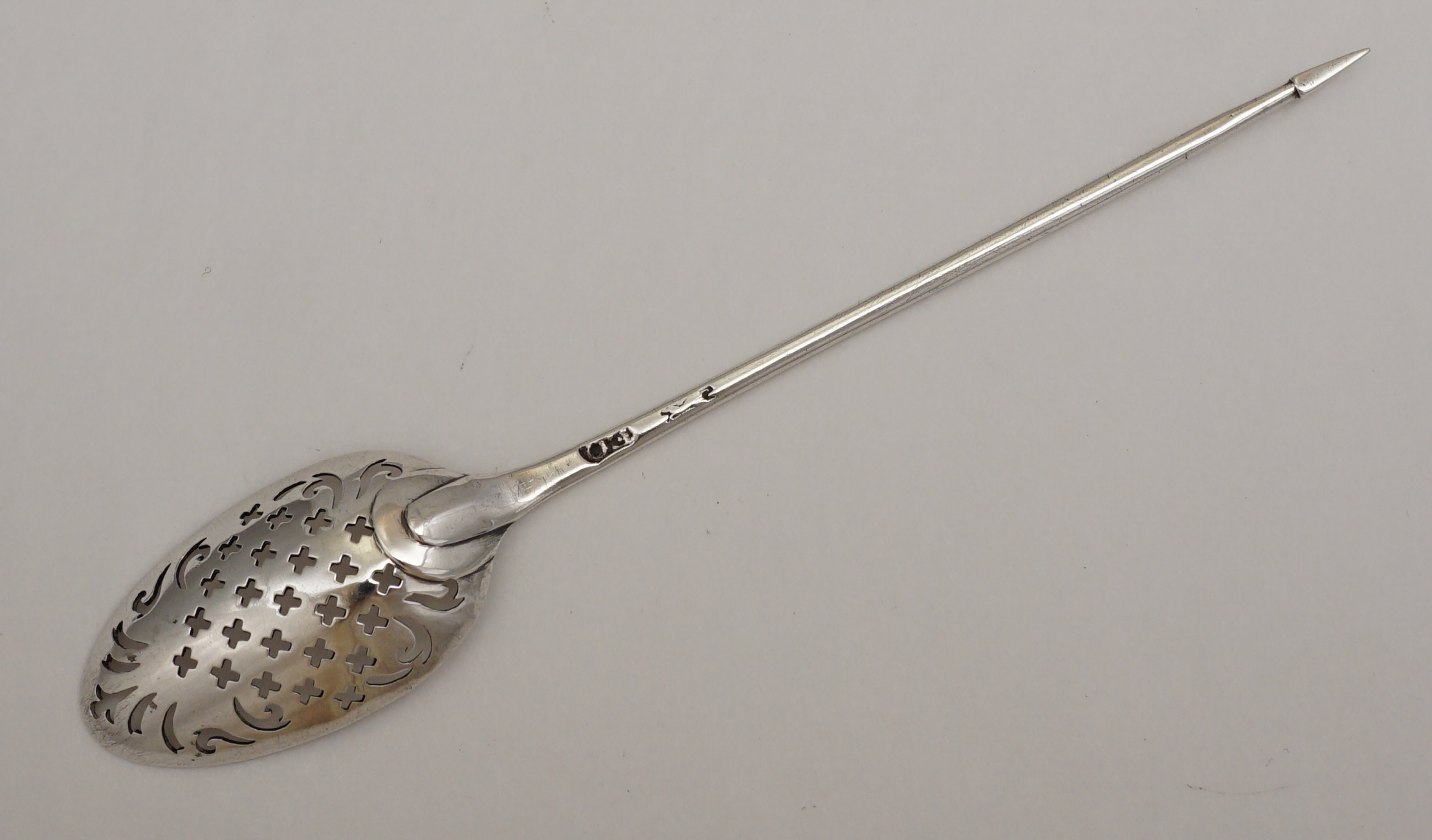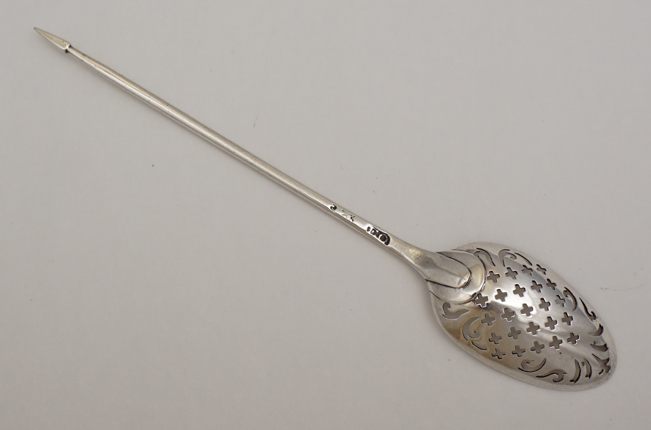 | DESCRIPTION | Very good antique English Georgian solid sterling silver mote spoon, the bowl with typical for the period crosslet and scroll piercing and an unusual facetted drop over a balloon boss. The terminal with well preserved pyramid point. This wonderful survivor ticks all the boxes for these items and if you are to only ever buy one mote spoon this would be an excellent contender. Fully hallmarked with very well preserved and presented, clearly readable hallmarks. It is rare to find such a good maker's mark together with the lion passant. |