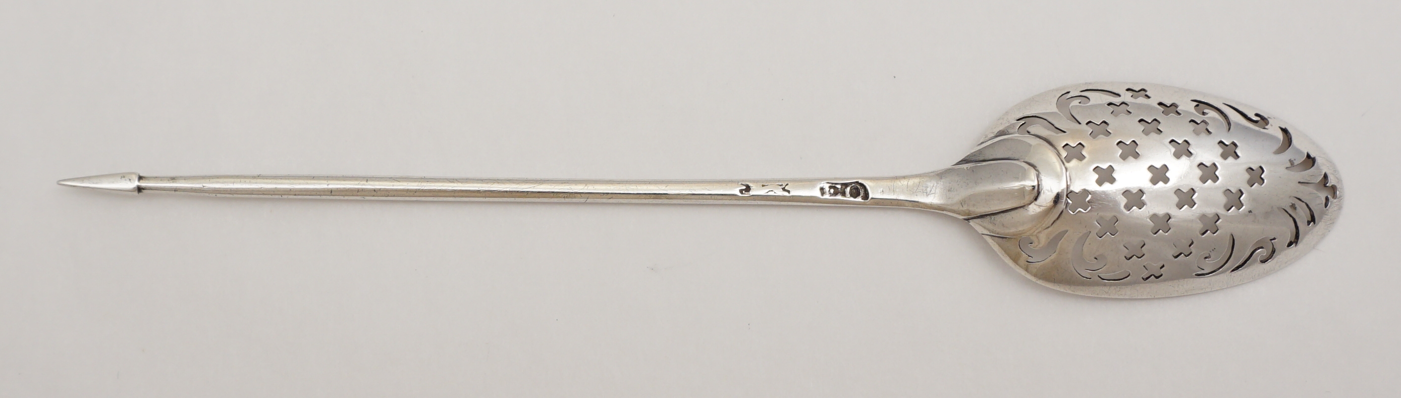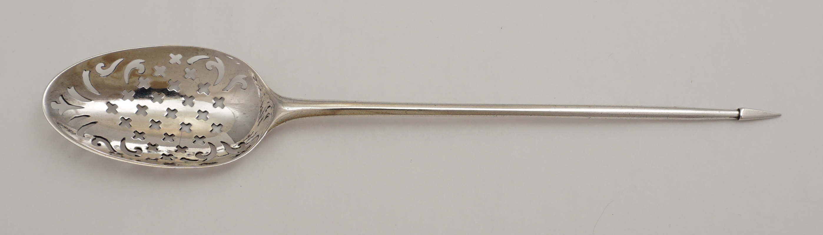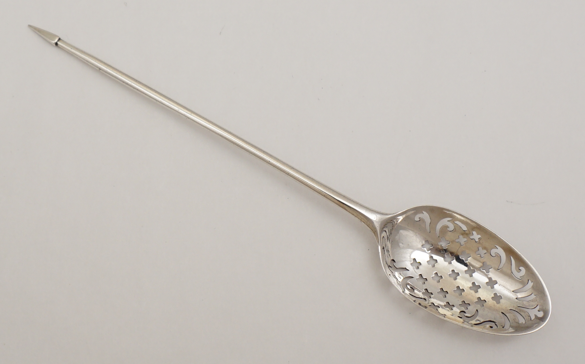 | DESCRIPTION | Very good antique English Georgian solid sterling silver mote spoon, the bowl with typical for the period crosslet and scroll piercing and an unusual facetted drop over a balloon boss. The terminal with well preserved pyramid point. This wonderful survivor ticks all the boxes for these items and if you are to only ever buy one mote spoon this would be an excellent contender. Fully hallmarked with very well preserved and presented, clearly readable hallmarks. It is rare to find such a good maker's mark together with the lion passant. |