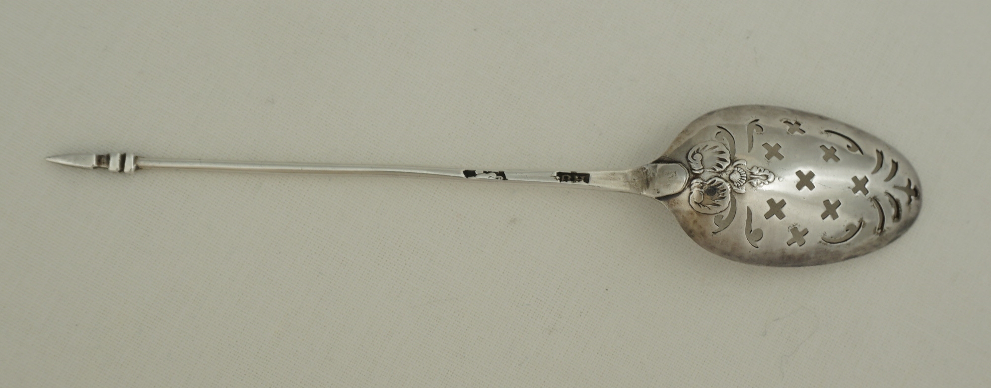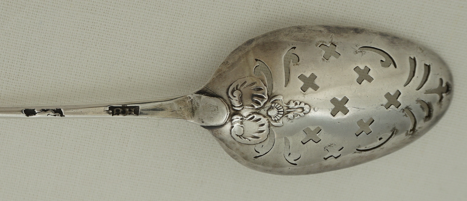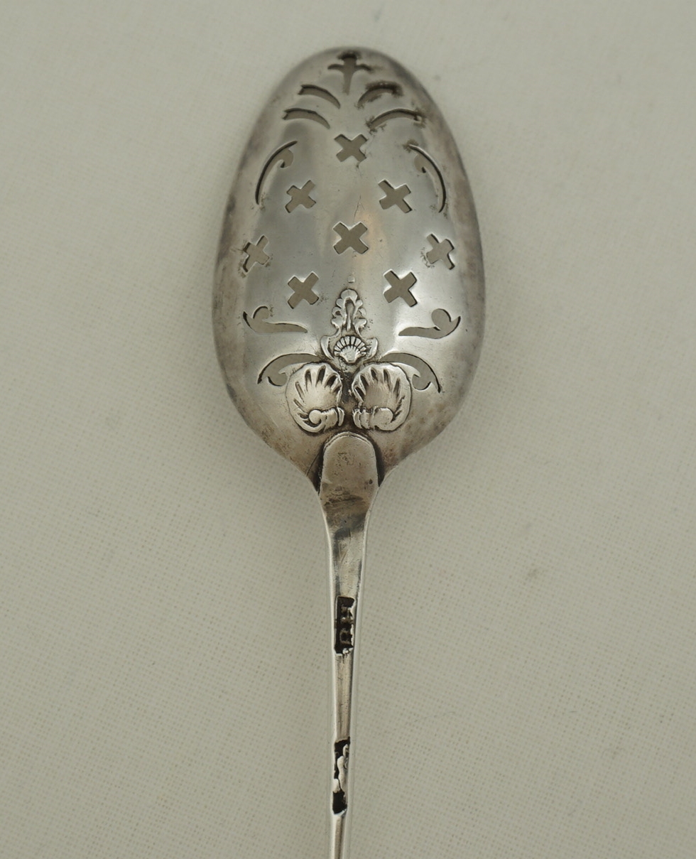 | DATE or HALLMARK | mid 18th century, mote spoons of this period never had a date letter. There was no legal requirement for it and scant space to strike upon. I had a Hanoverian fancy back table spoon with the same RH maker that had a clear date letter for 1755. |