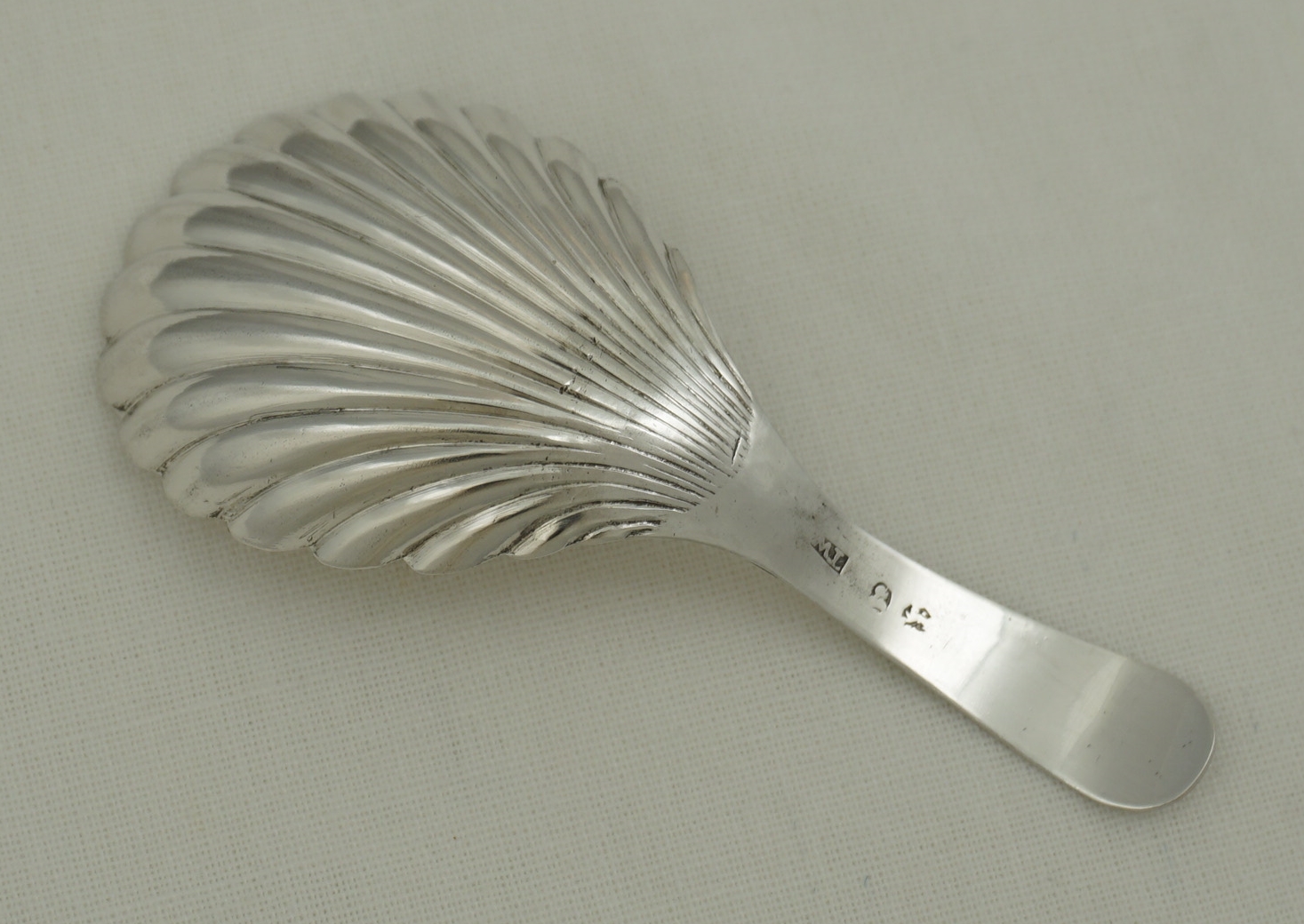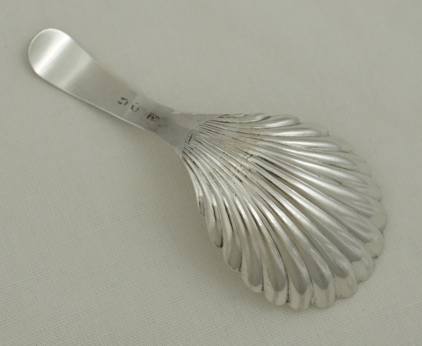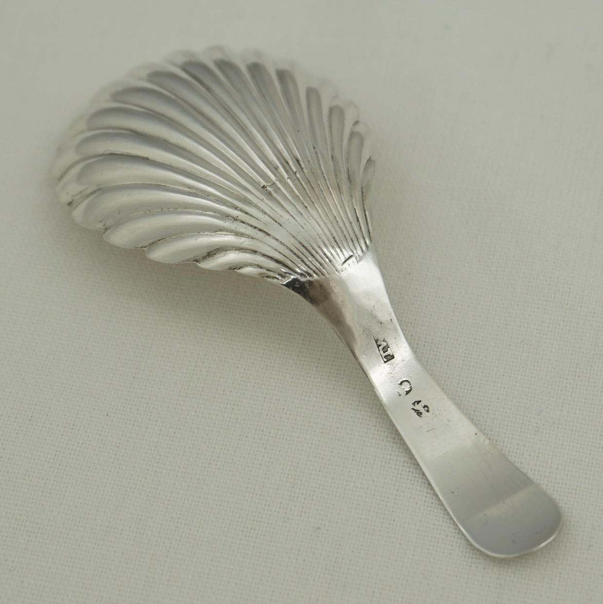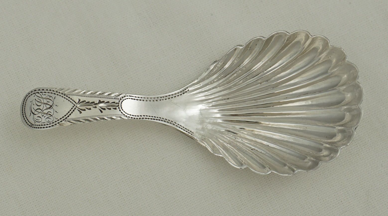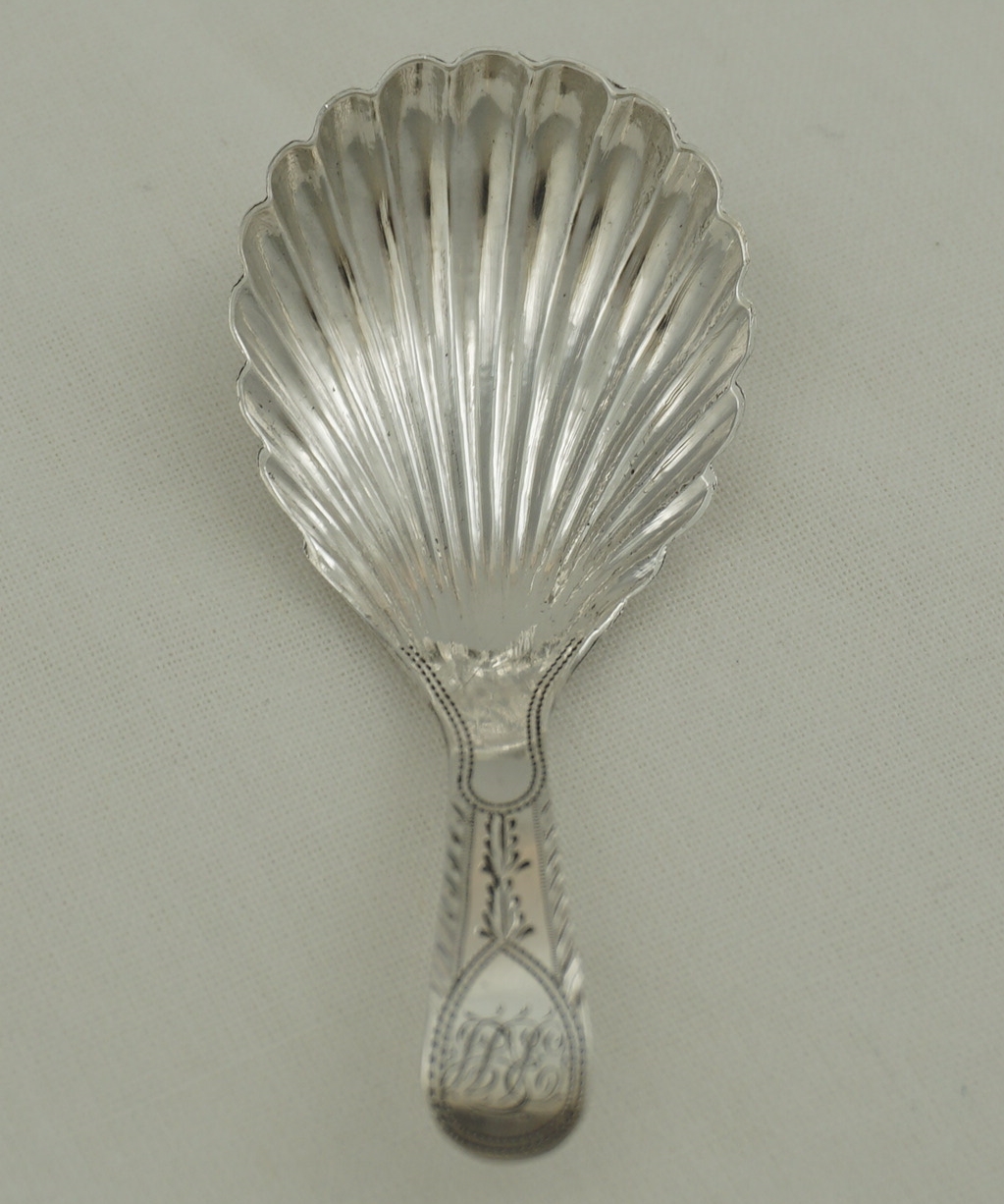 DESCRIPTION | Antique English Georgian solid sterling silver caddy spoon with shell bowl, bright cut engraved decoration and the original monogram engraving to the cartouche. |