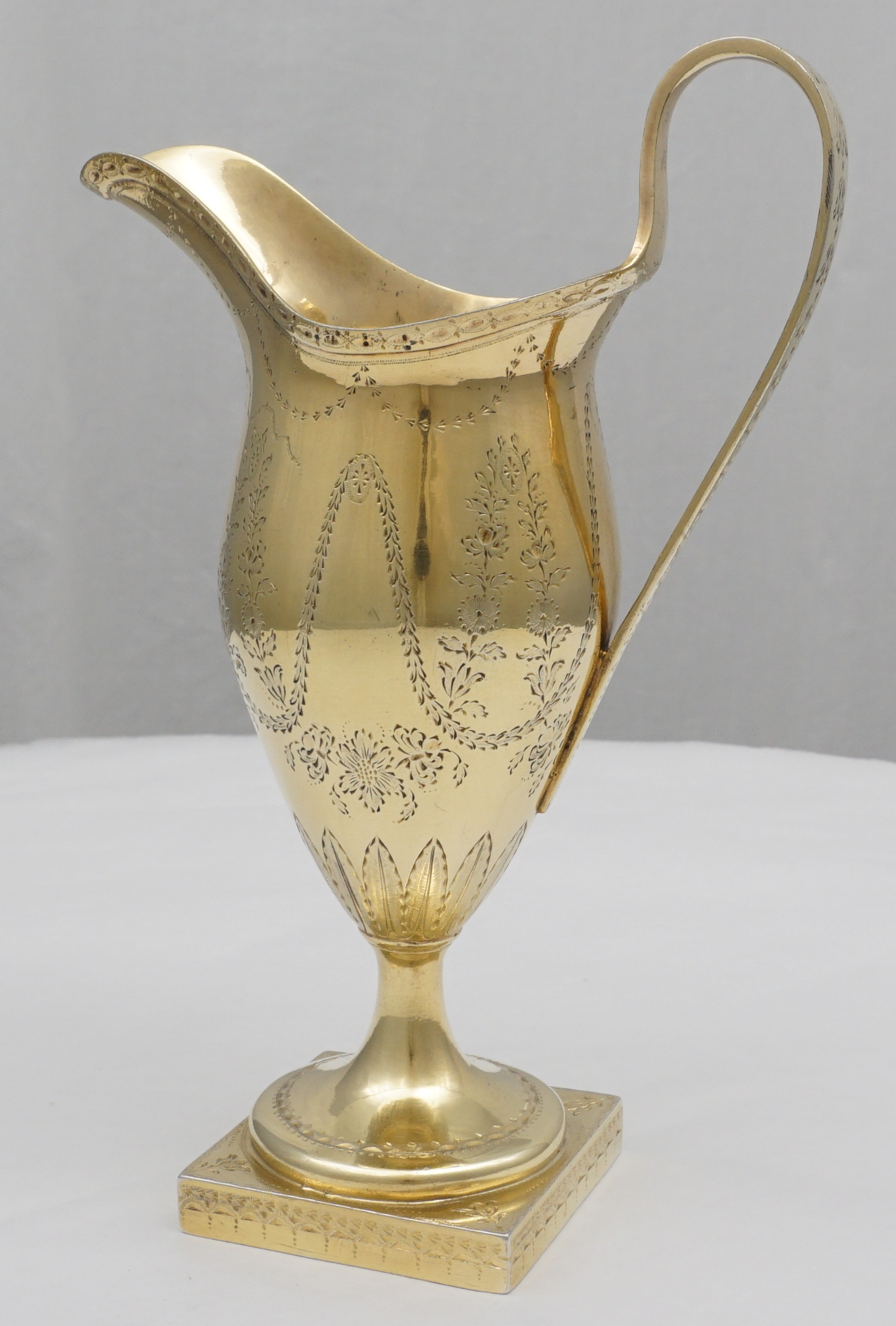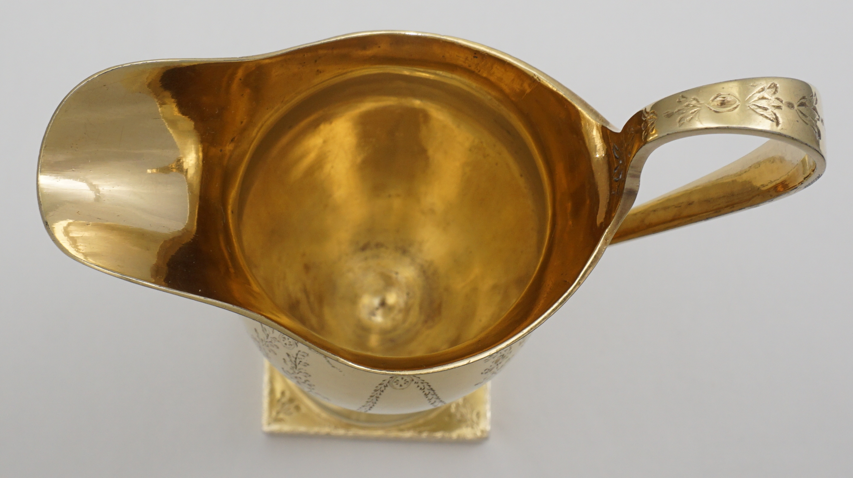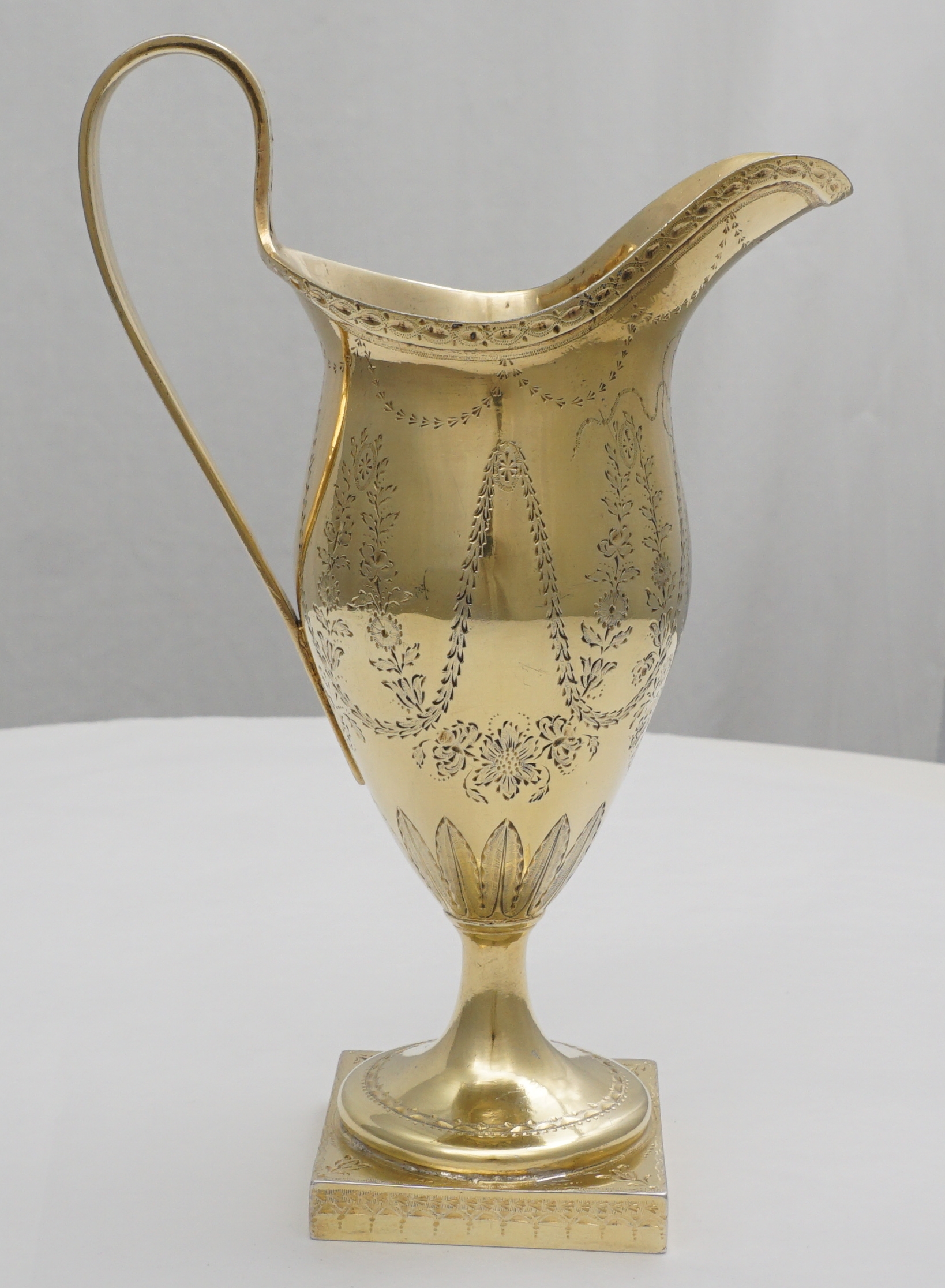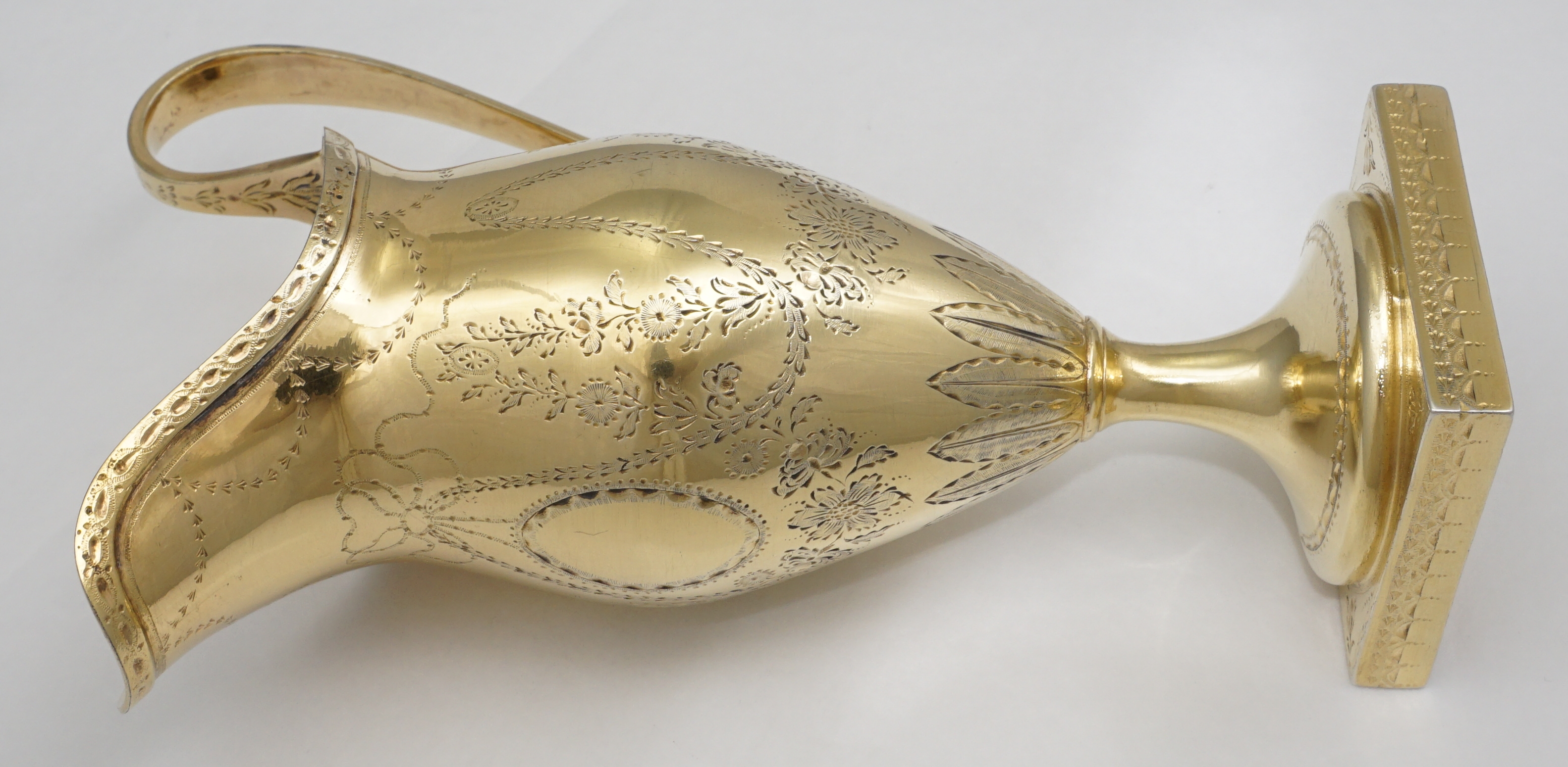 | DESCRIPTION | Extraordinary antique English Georgian solid sterling silver neo-classical cream jug with bright-cut engraving and completely gilt in pure gold. Probably a bit taller than you are expecting and of much thicker silver than similar items. I am thinking of the jugs by Hester Bateman that you could crush in one hand. If you tried to crush this example it would ruin your hands. No engraving or erasure to the frontal oval cartouche and the bright-cutting is still remarkably crisp. |