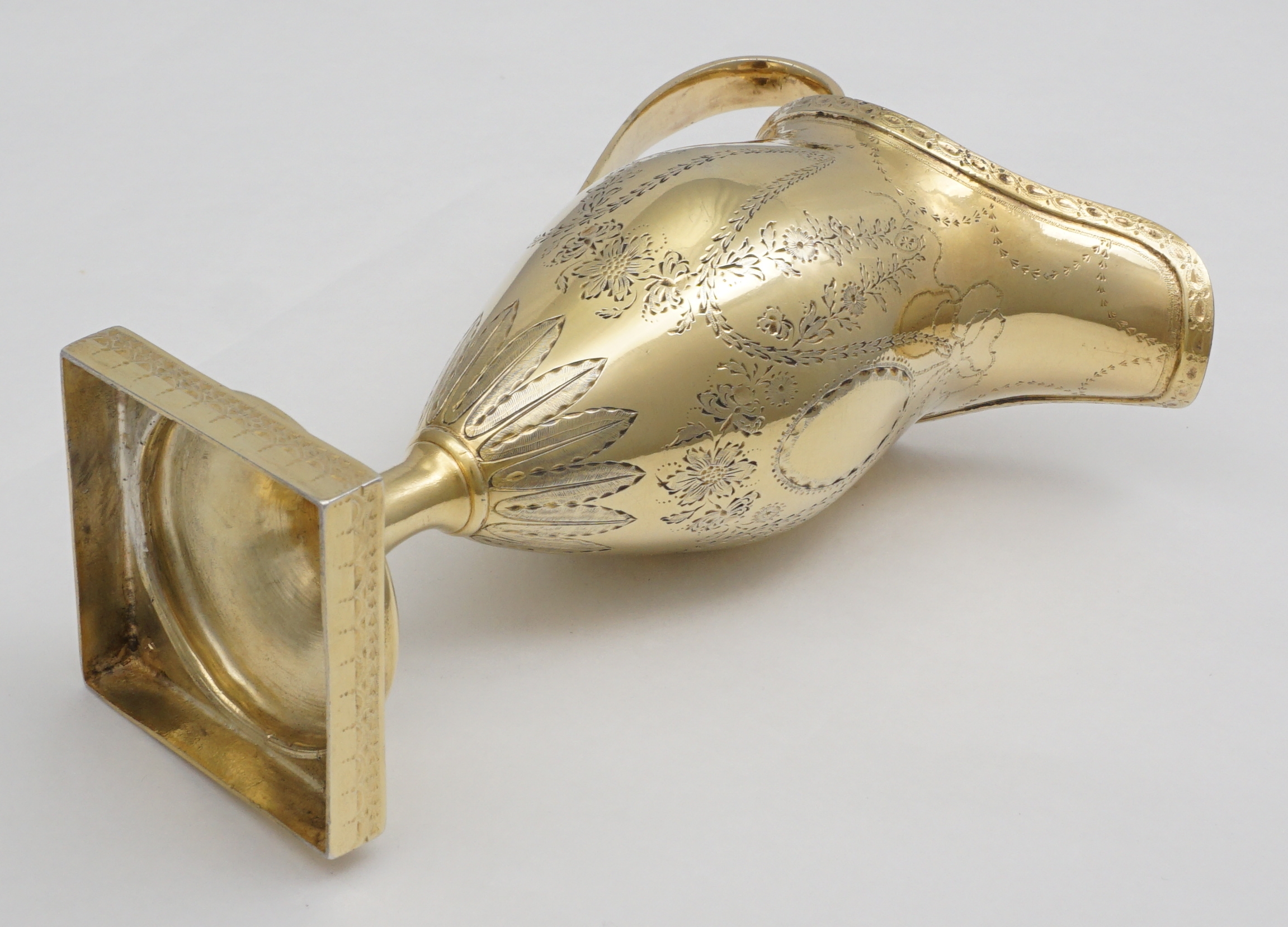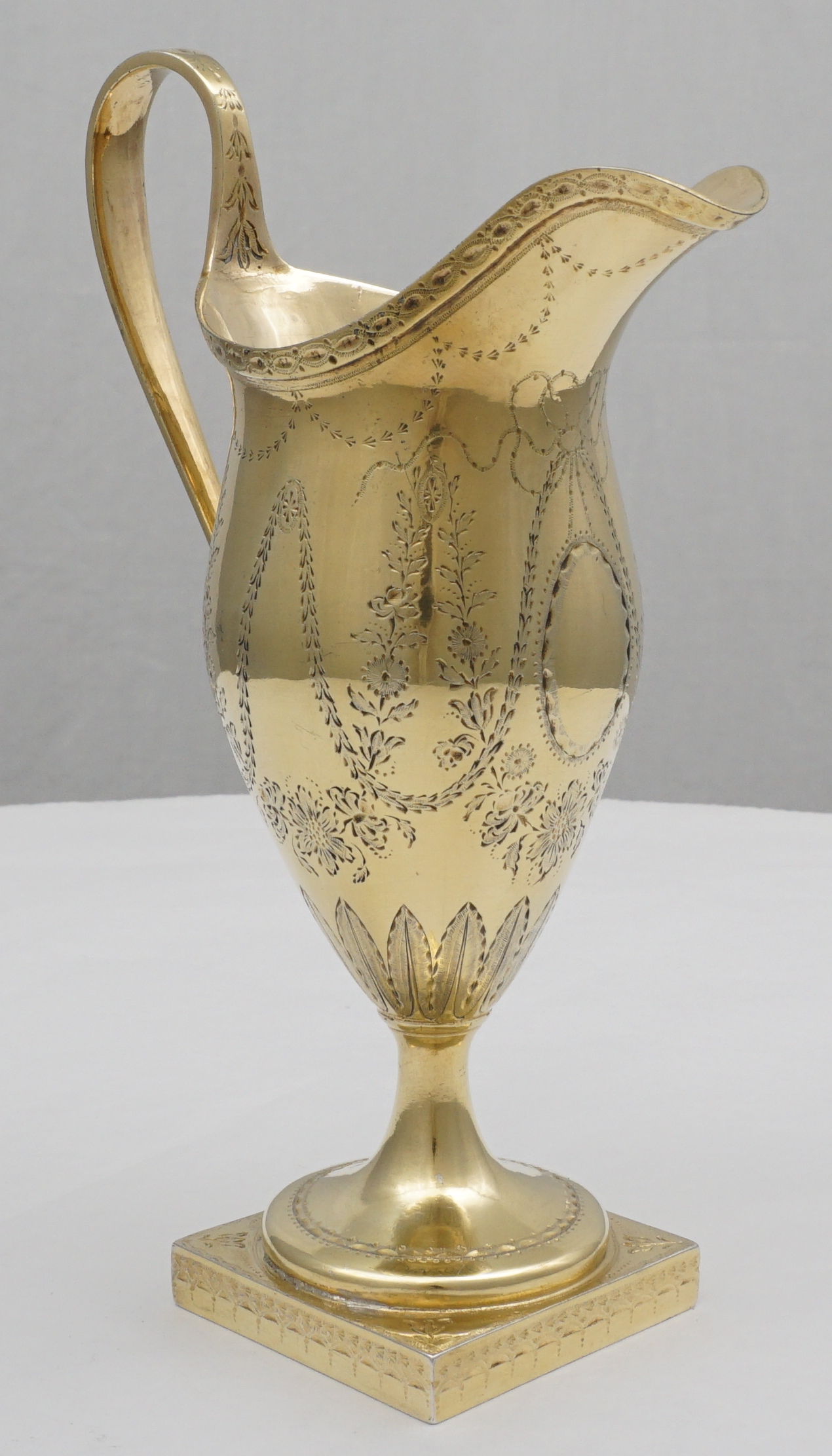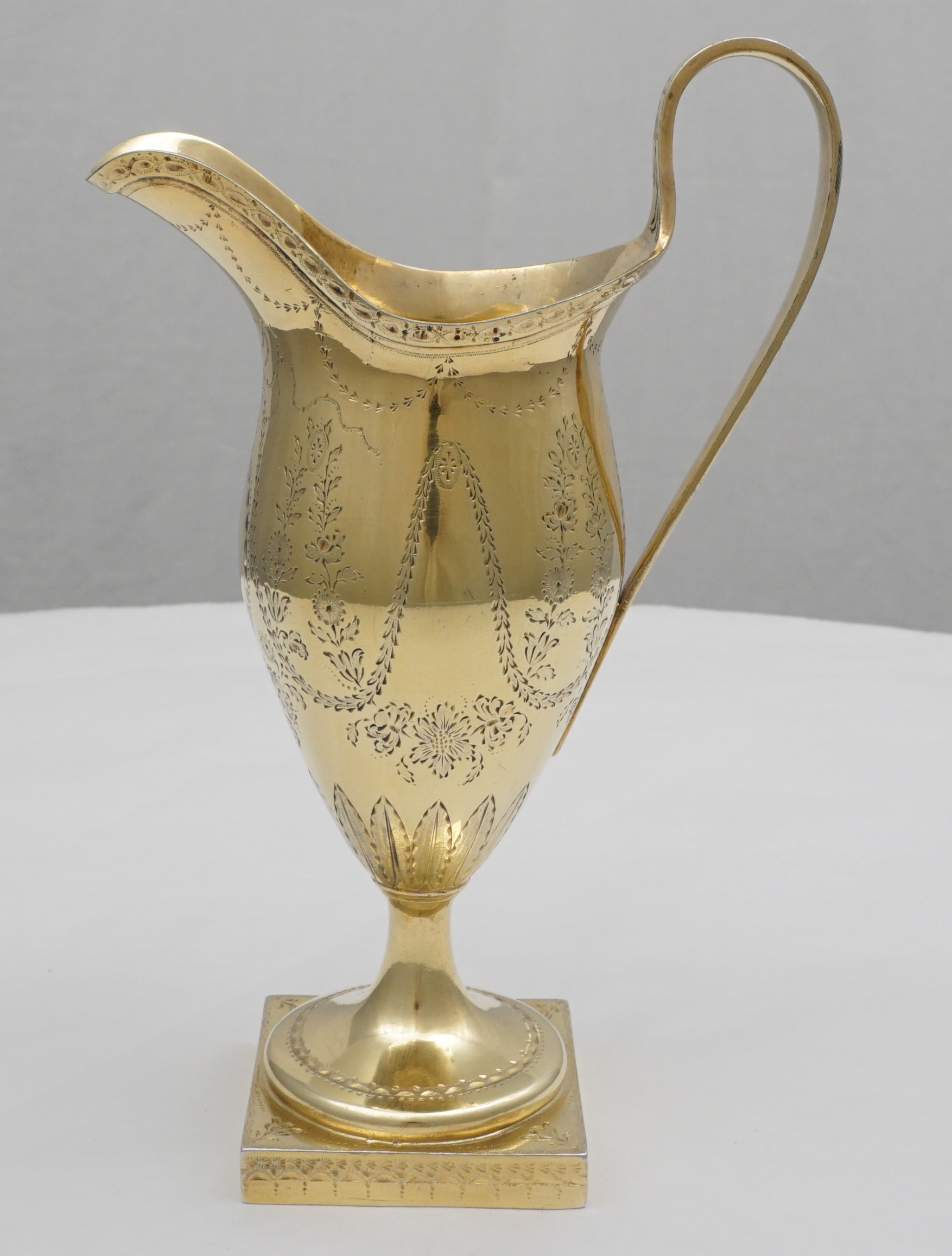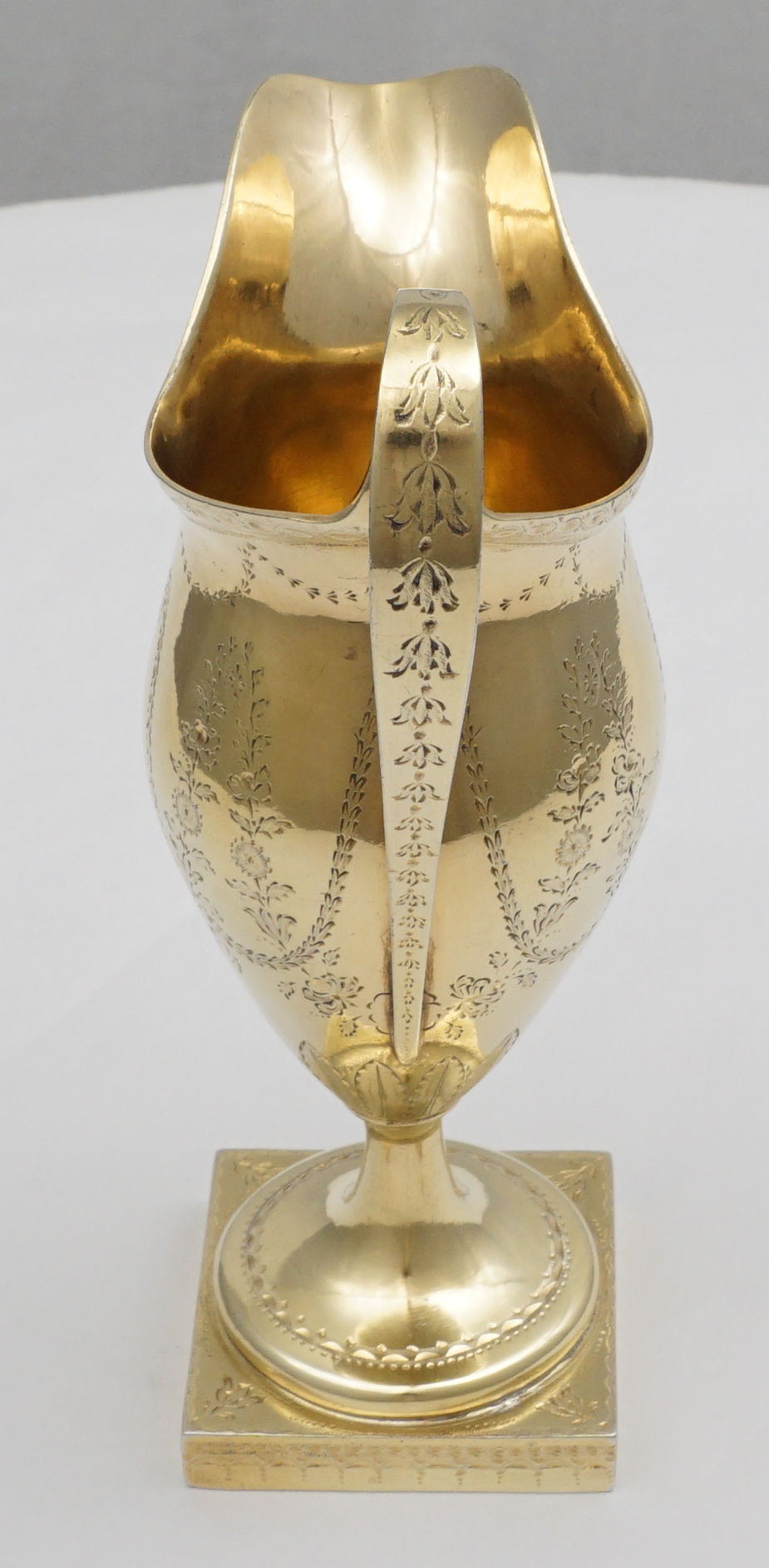 | DESCRIPTION | Extraordinary antique English Georgian solid sterling silver neo-classical cream jug with bright-cut engraving and completely gilt in pure gold. Probably a bit taller than you are expecting and of much thicker silver than similar items. I am thinking of the jugs by Hester Bateman that you could crush in one hand. If you tried to crush this example it would ruin your hands. No engraving or erasure to the frontal oval cartouche and the bright-cutting is still remarkably crisp. |