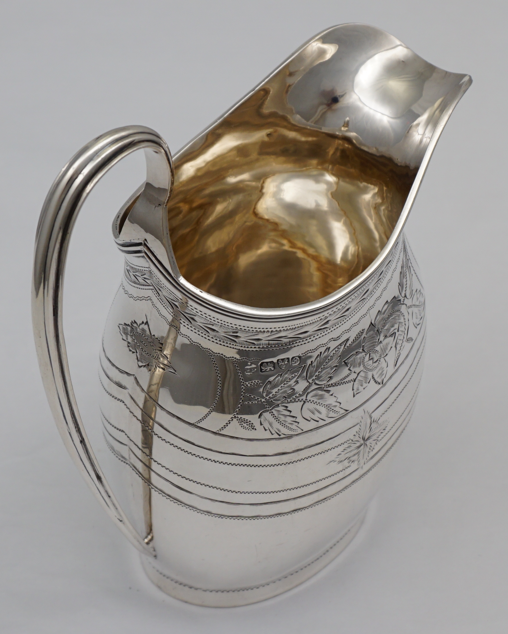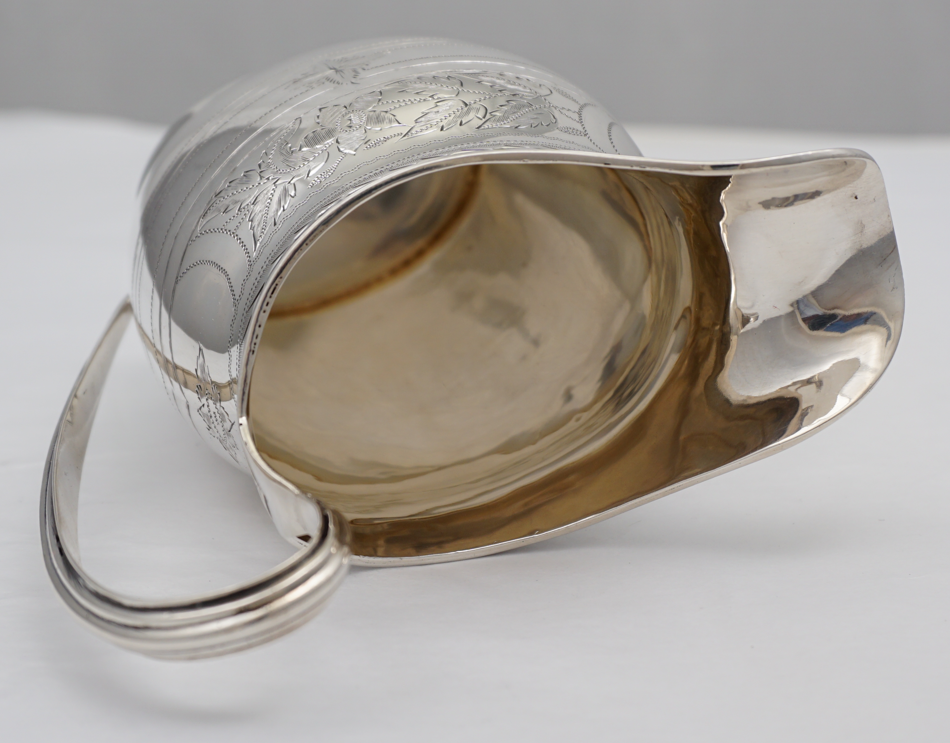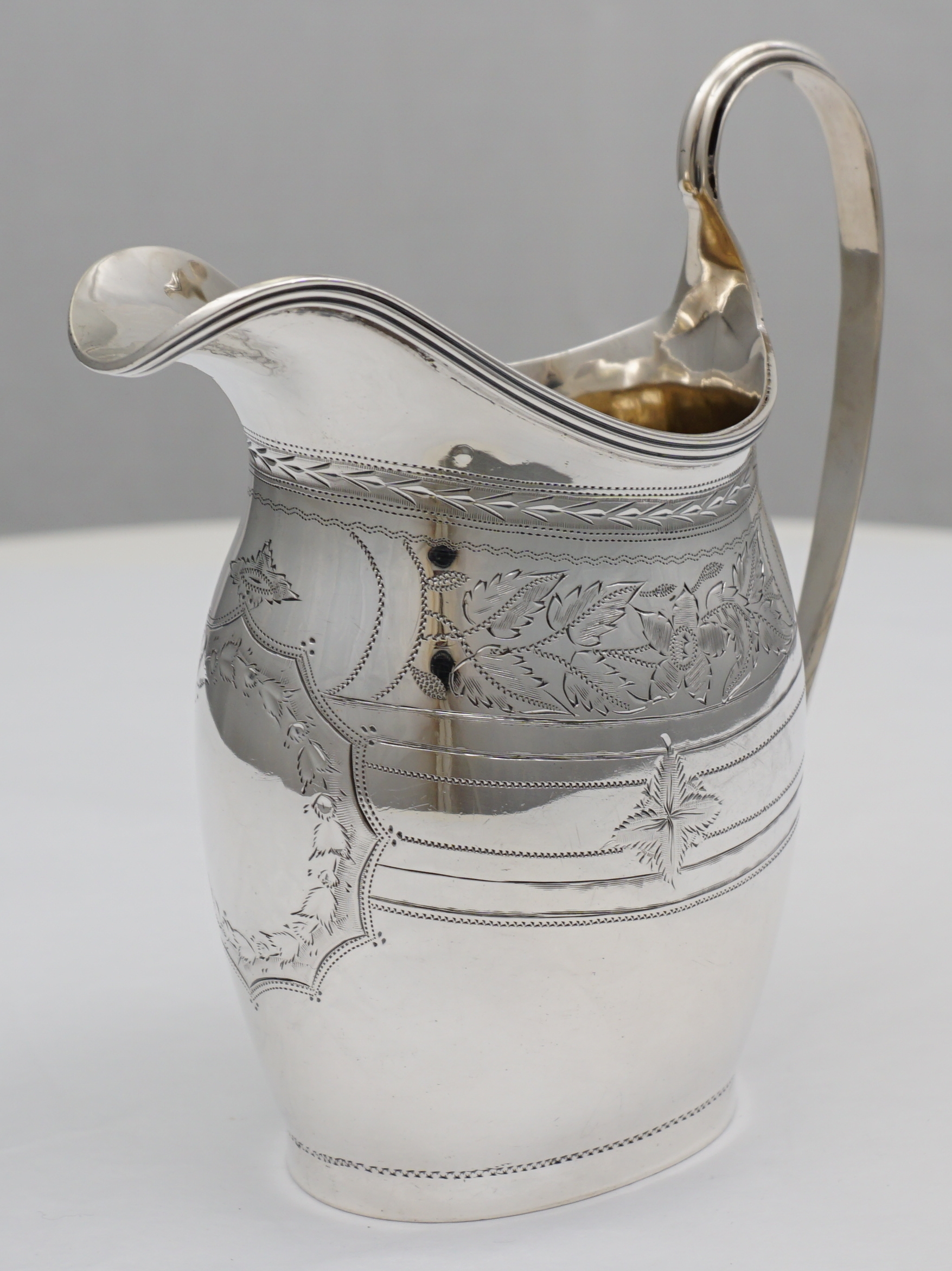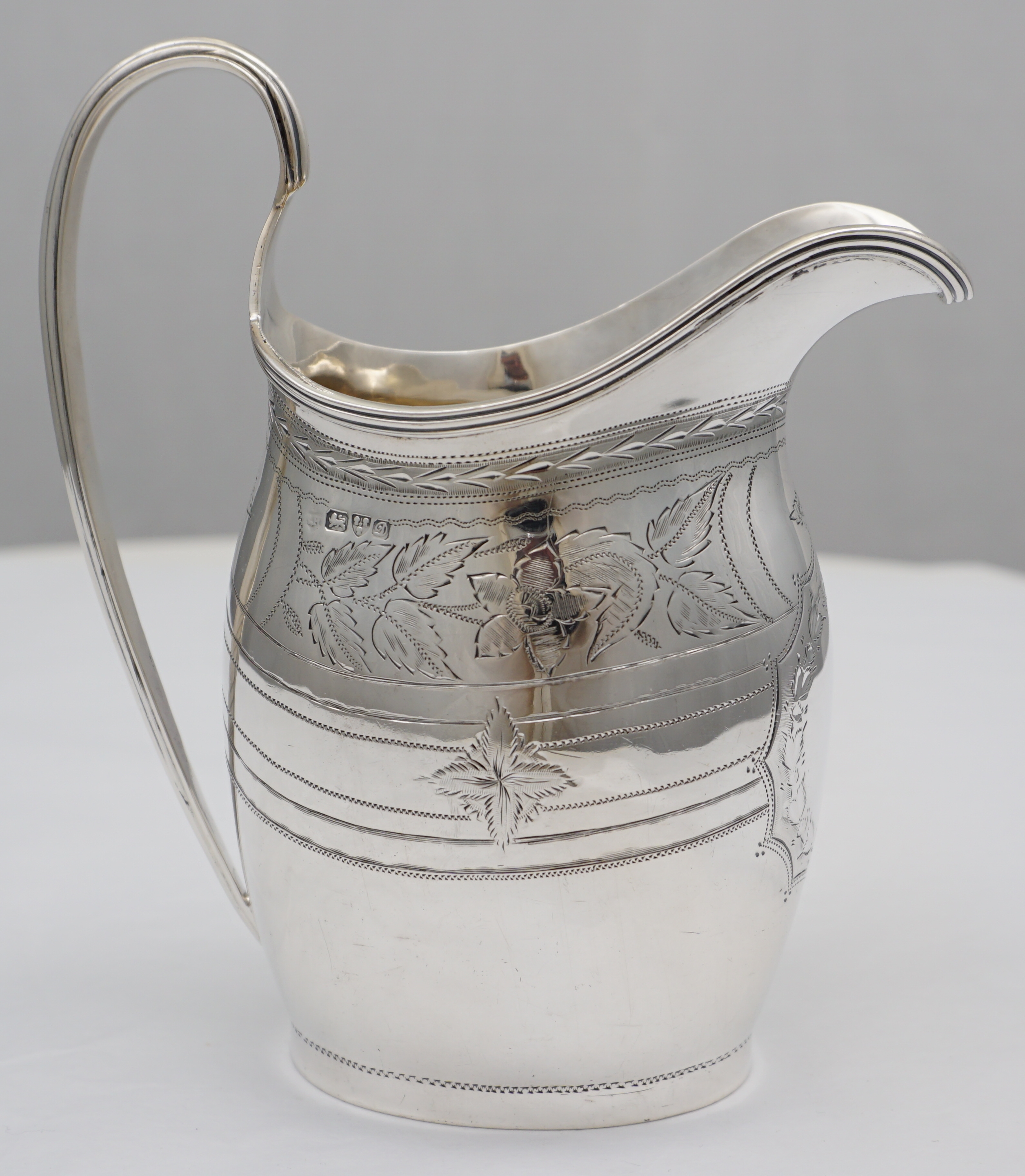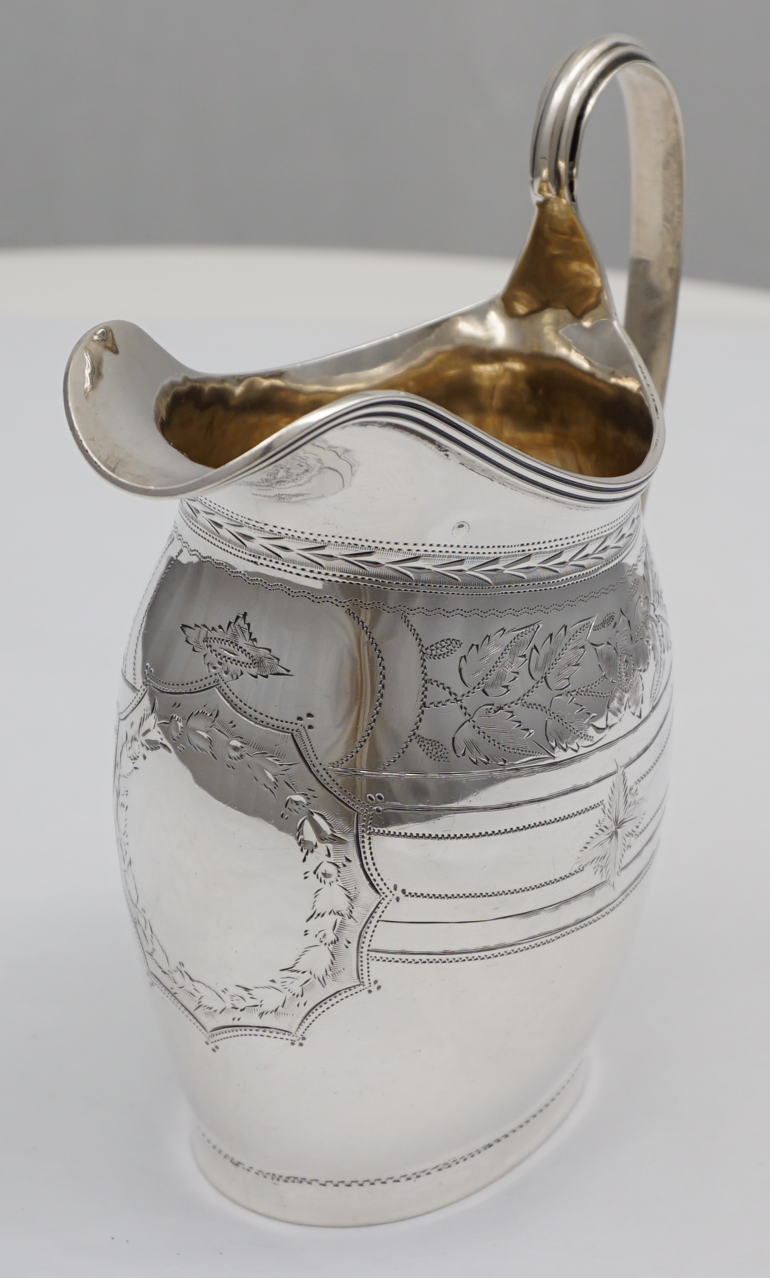 | DESCRIPTION | Pretty antique English Edwardian solid sterling silver jug in the Georgian style with bright-cut engraved decoration and a blank frontal cartouche. Holds ½ pint or 300ml and pours very nicely. |