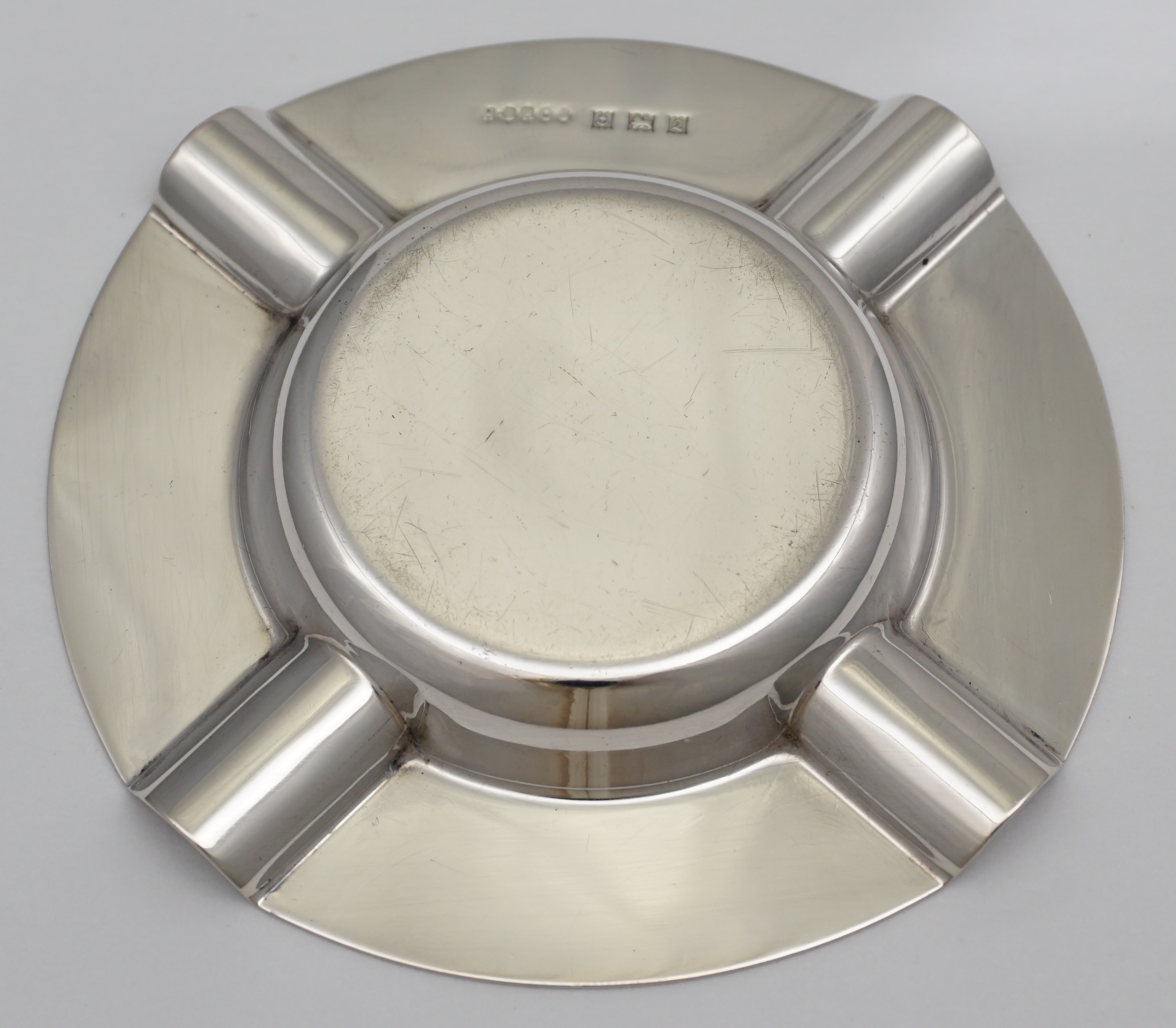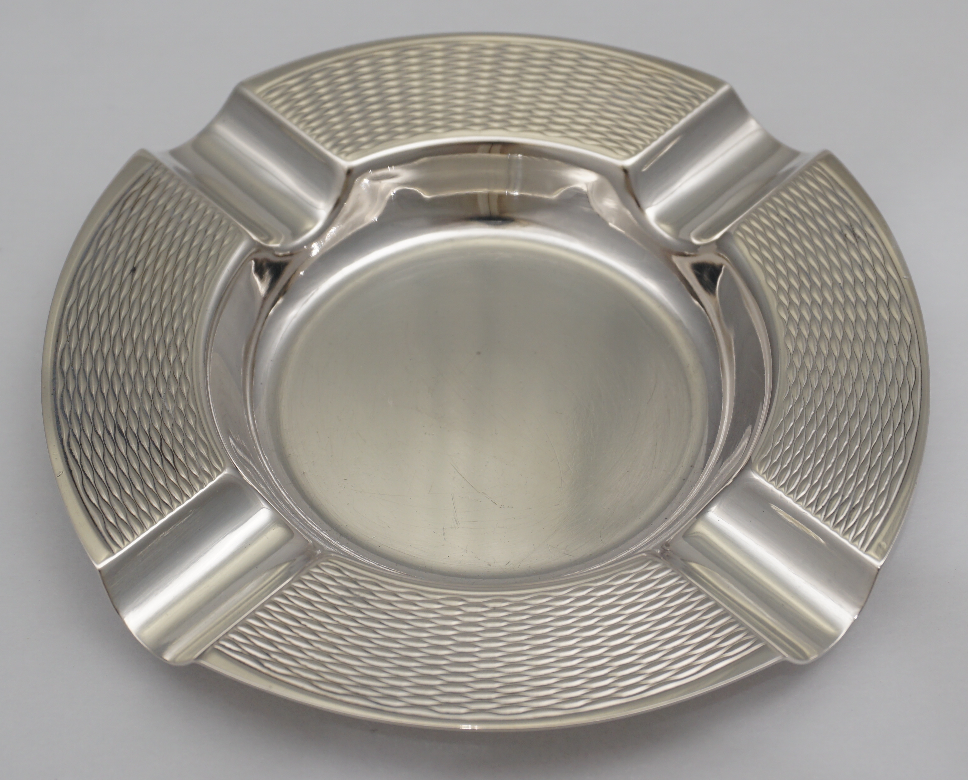 | DESCRIPTION | Good quality vintage solid sterling silver circular four station ashtray with engine turned decoration. |