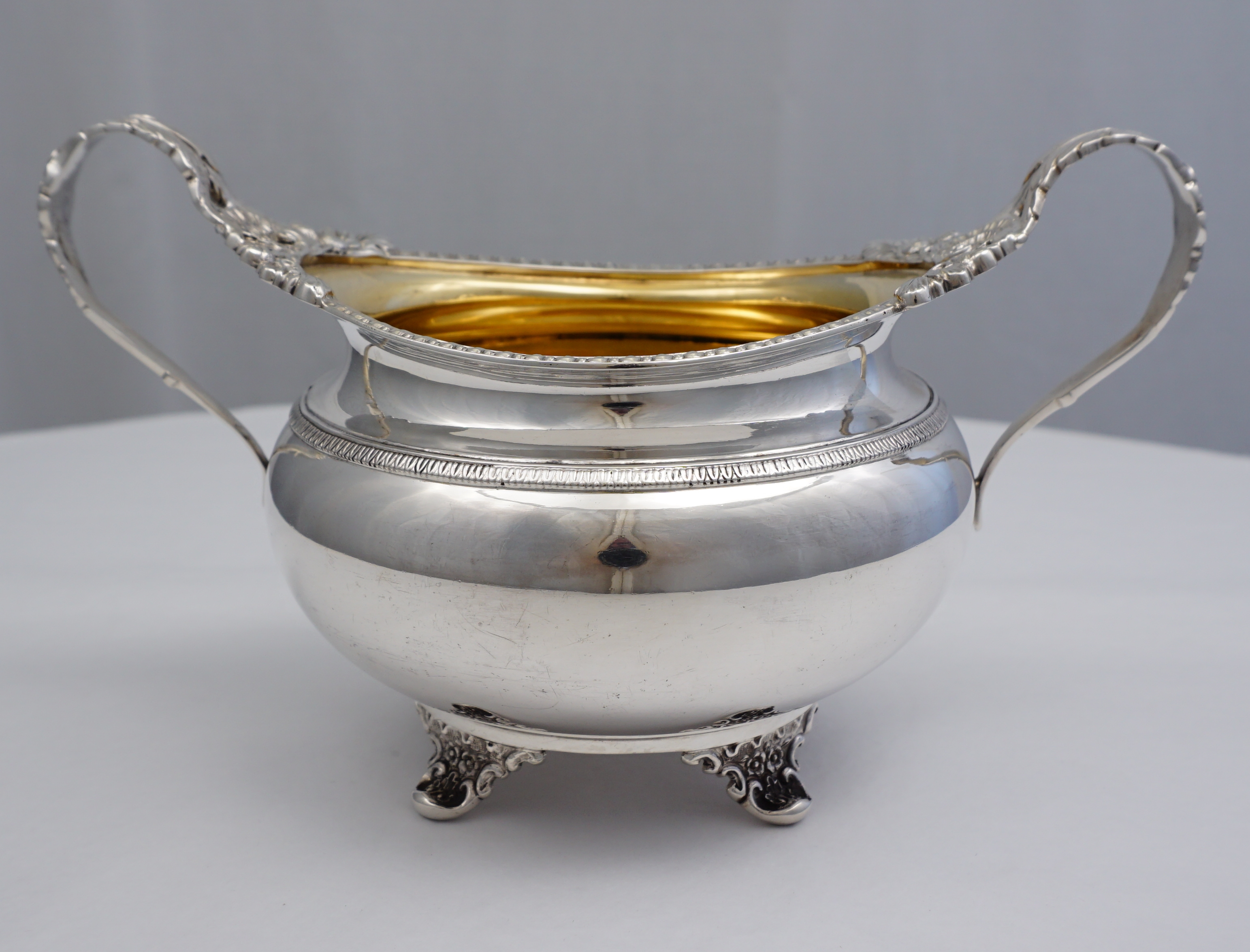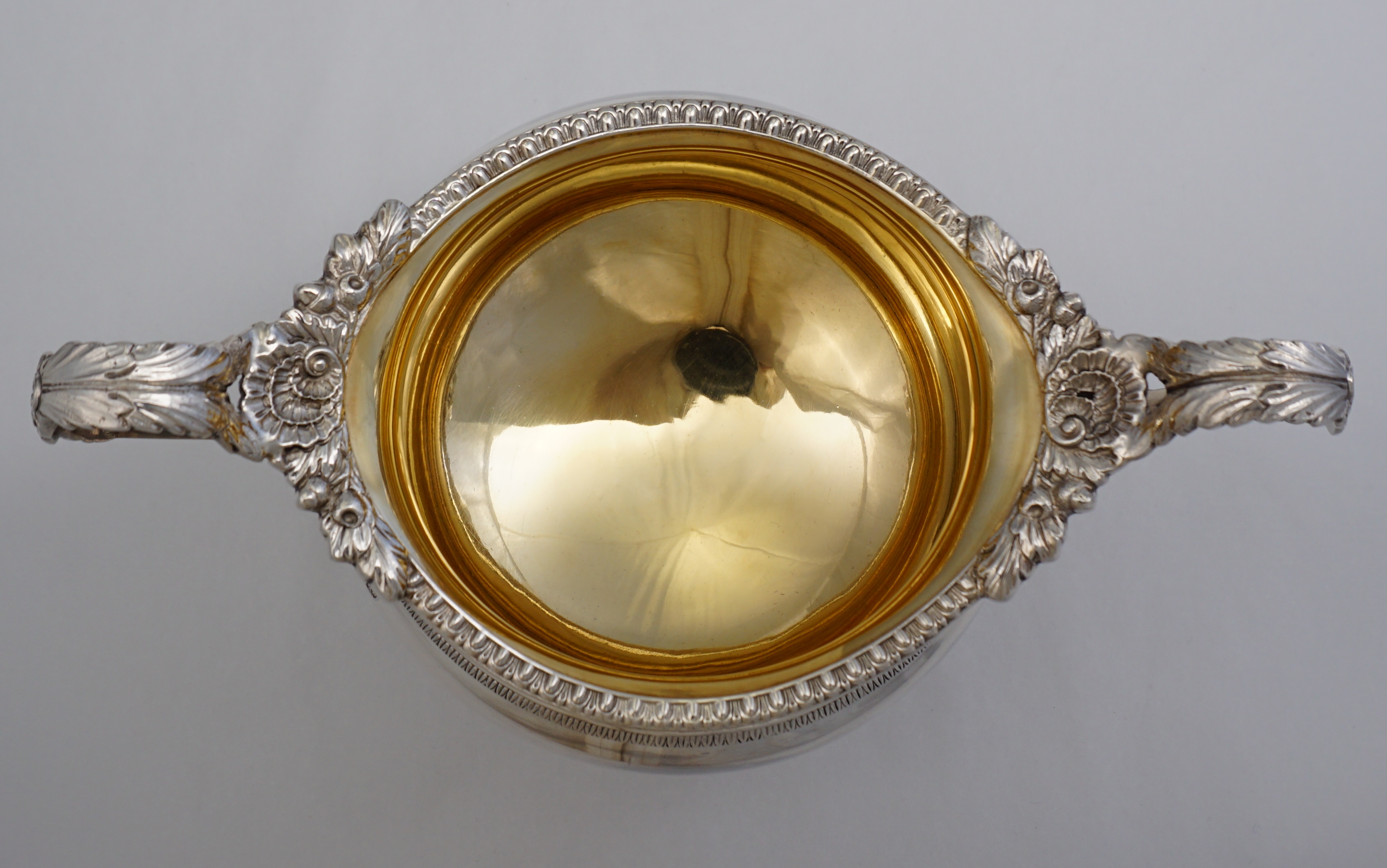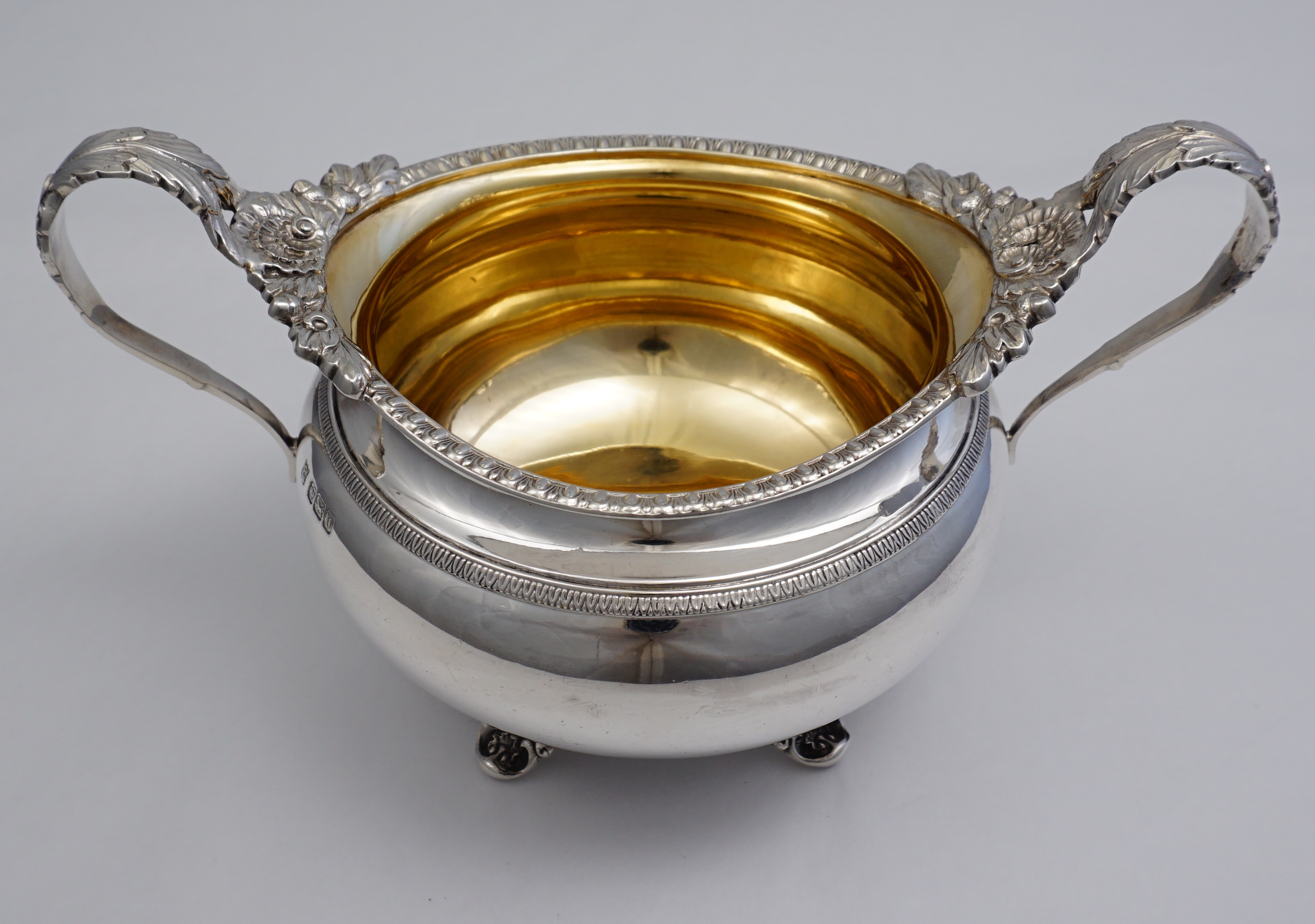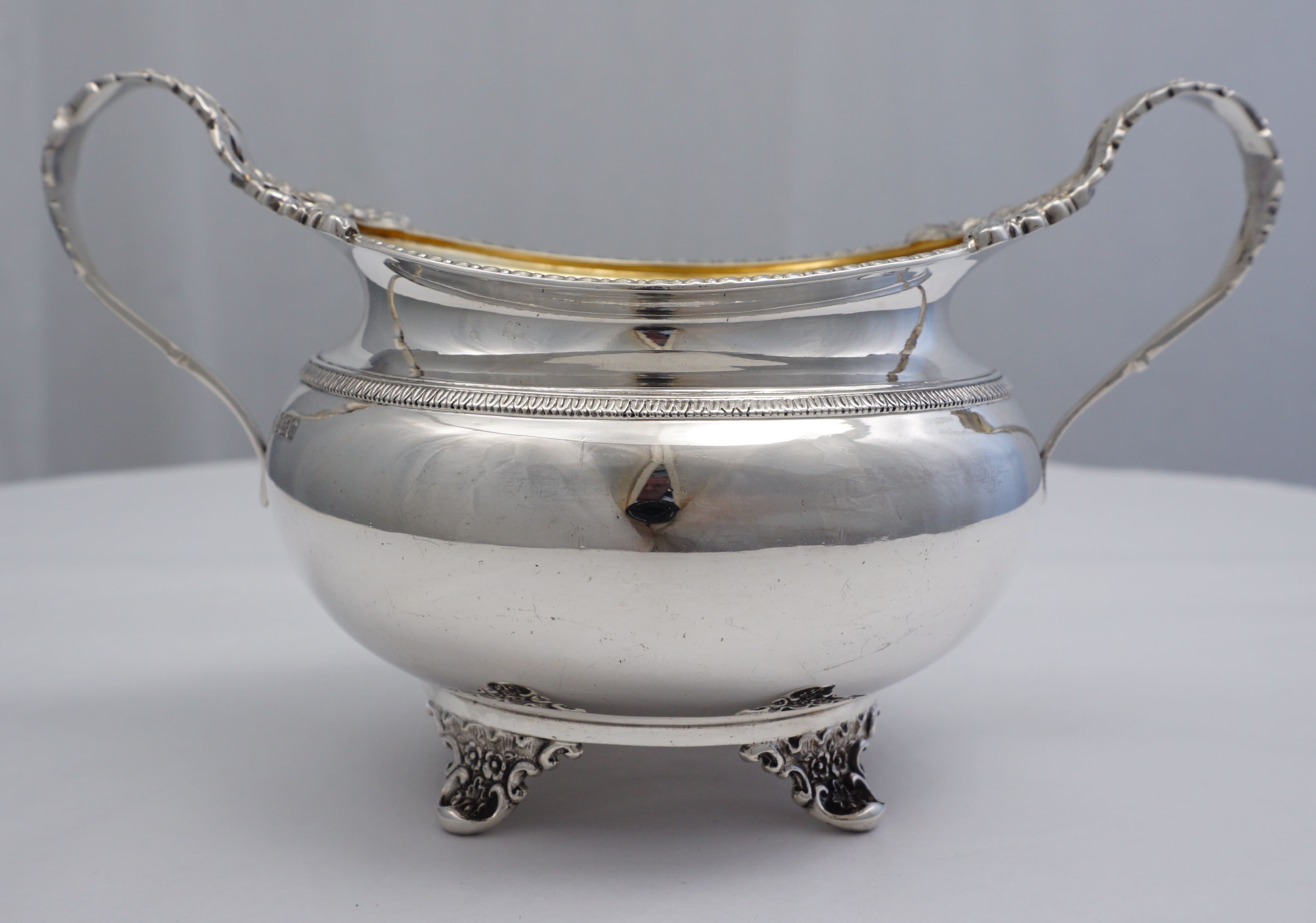 DESCRIPTION | Beautiful and impressive William IV style vintage English solid sterling silver large and heavy two handled solid sterling silver sugar bowl with a fully gilded interior. |